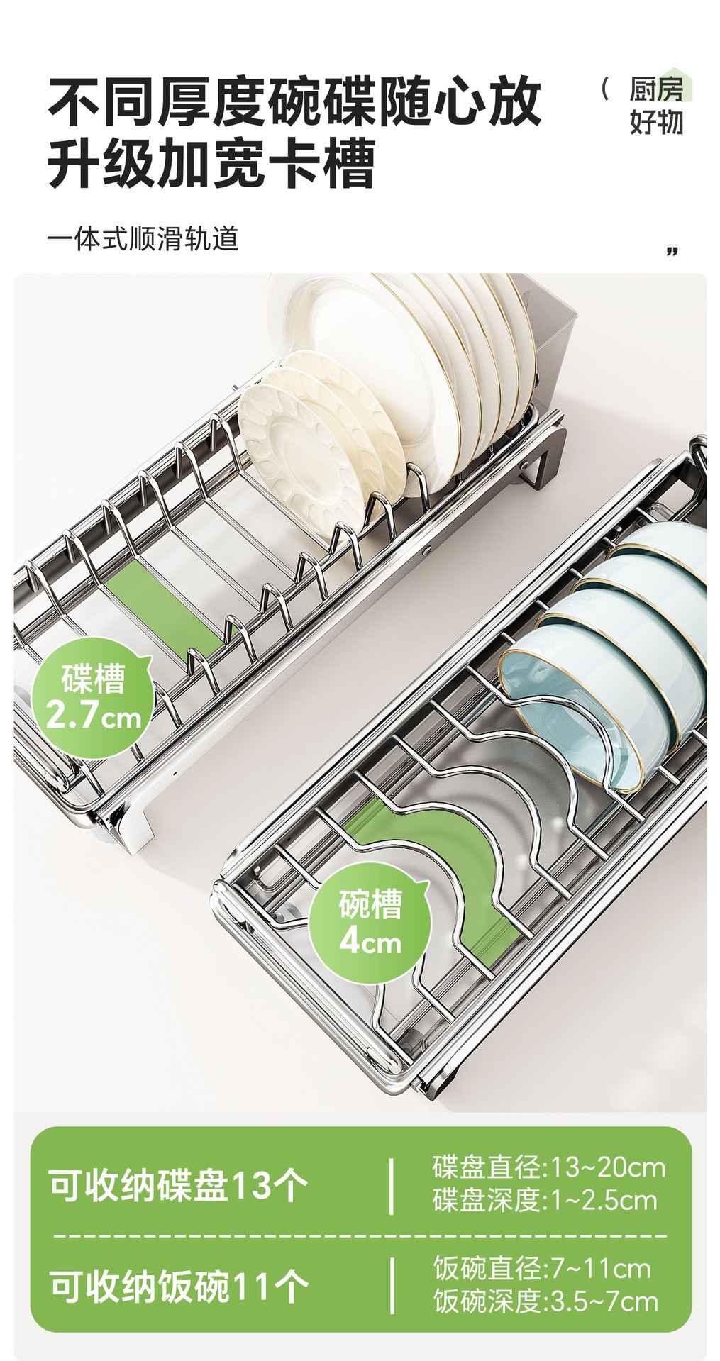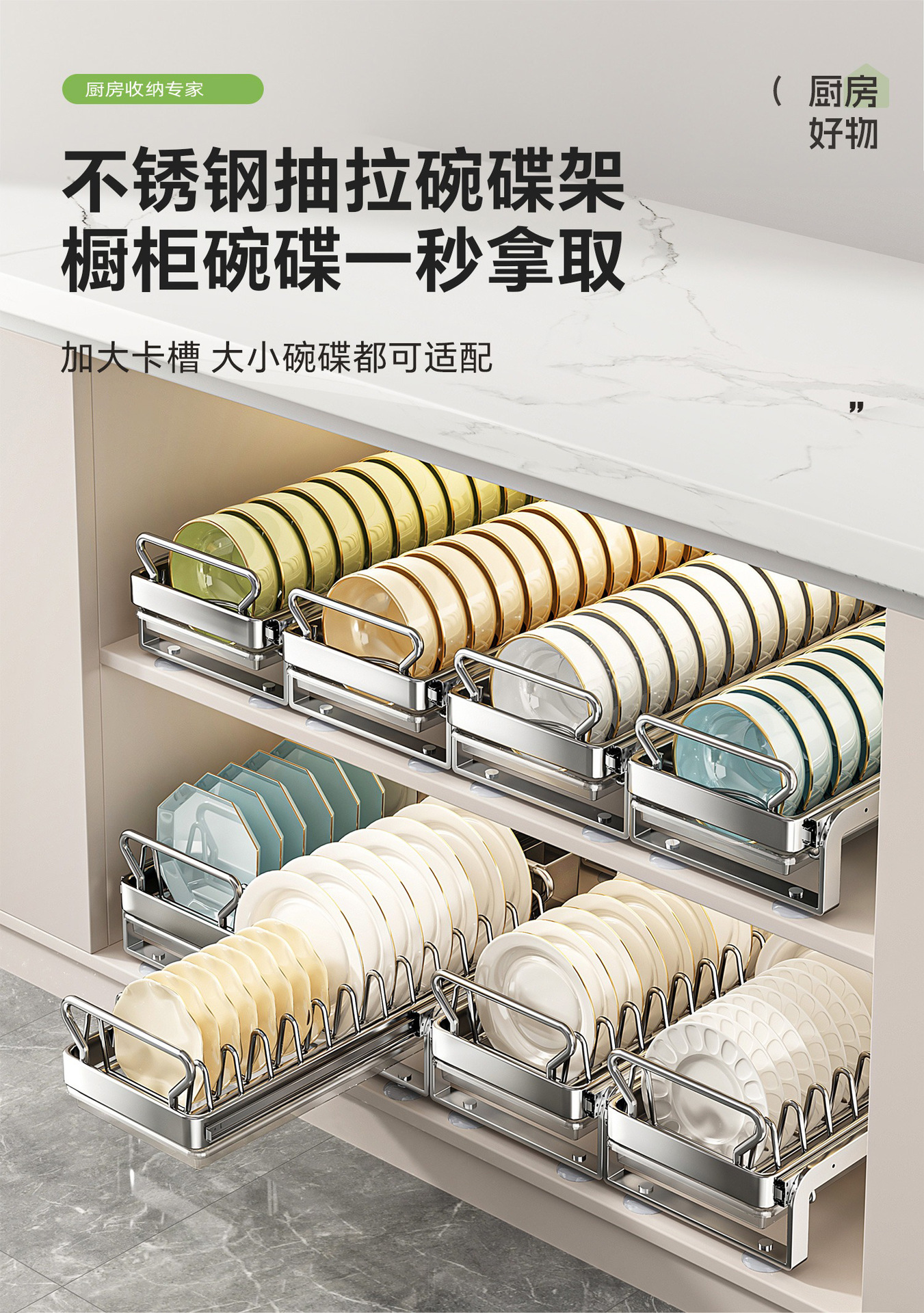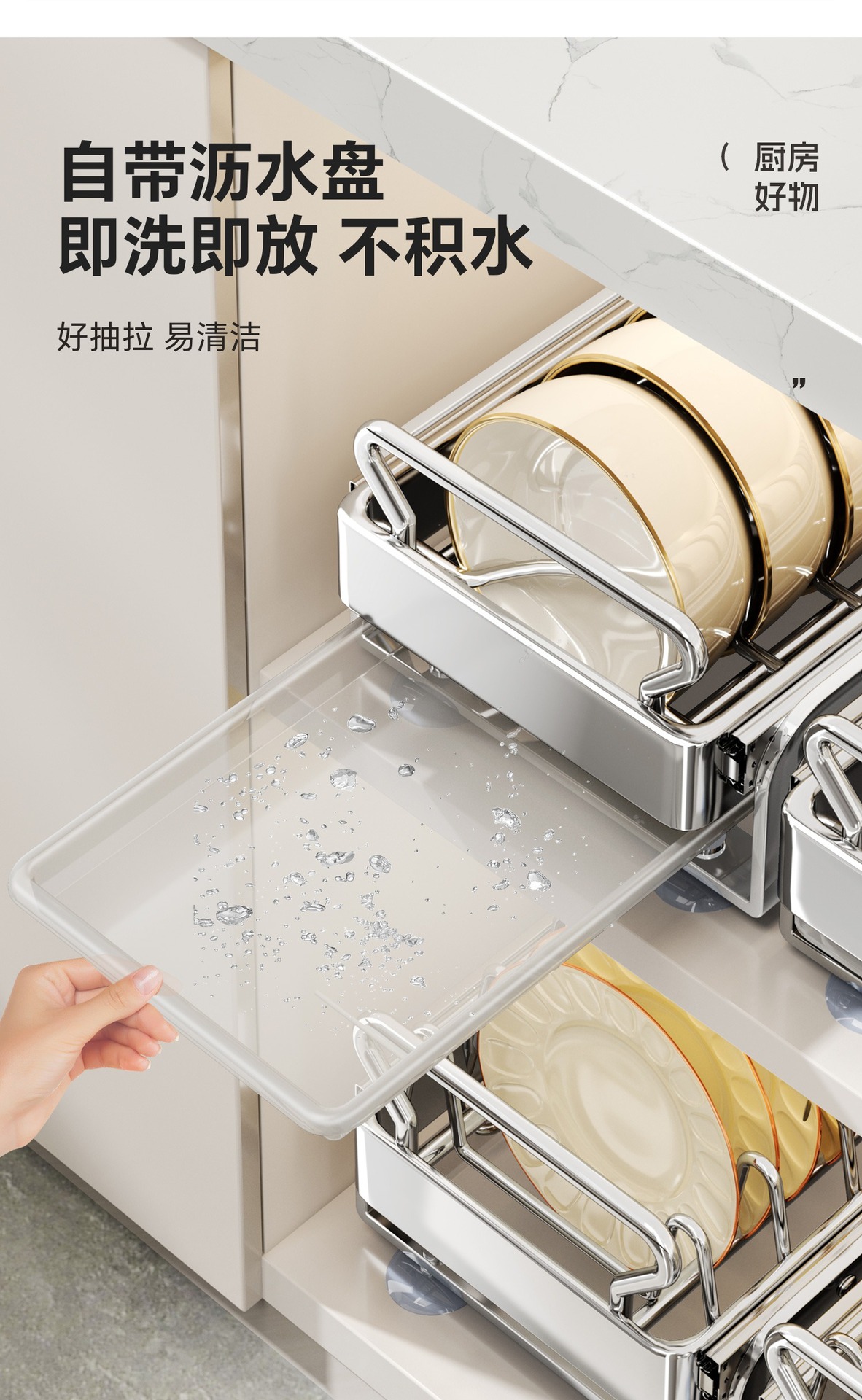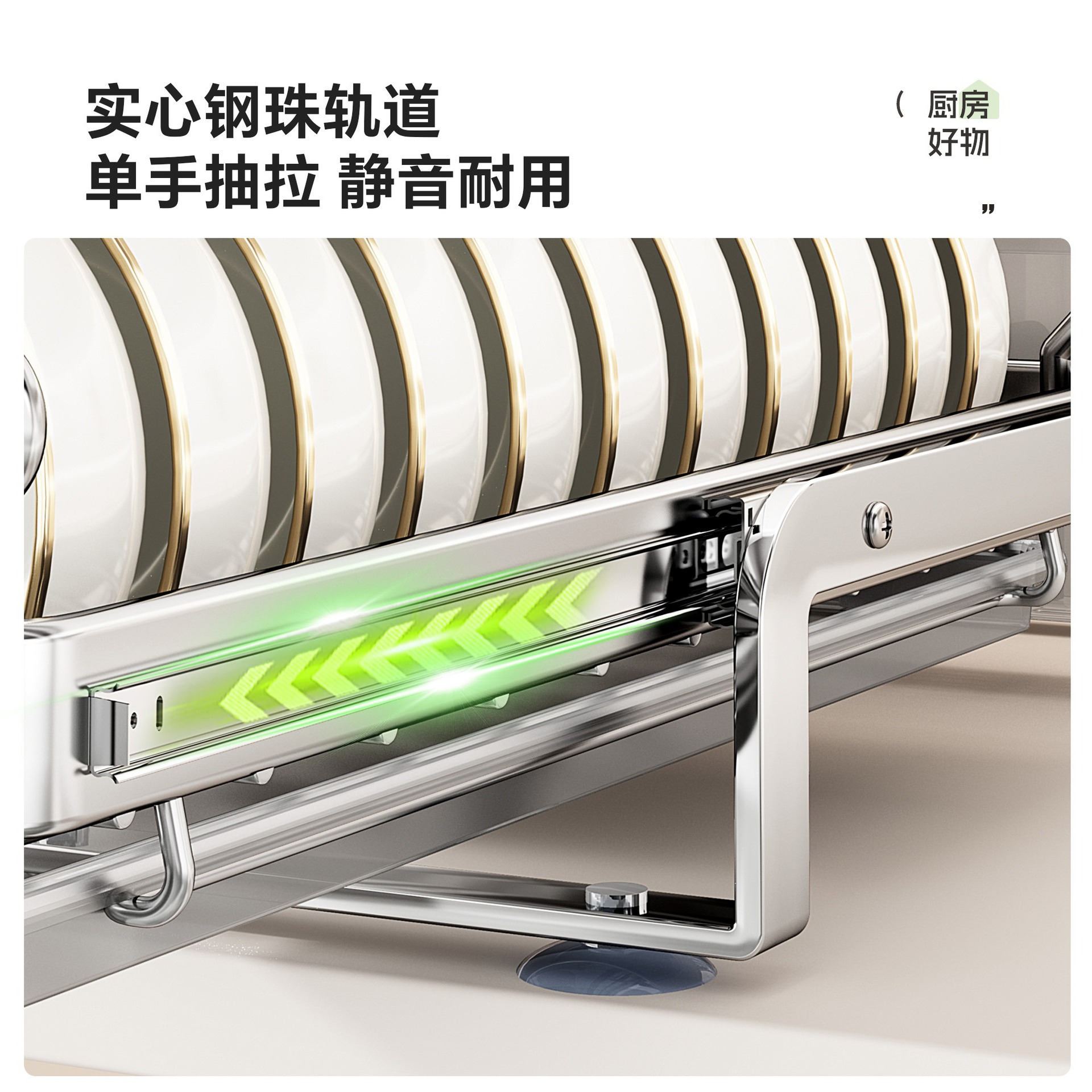 实心不锈钢抽拉碗碟收纳架厨房抽屉式拉篮橱柜内置沥水碗架置物架