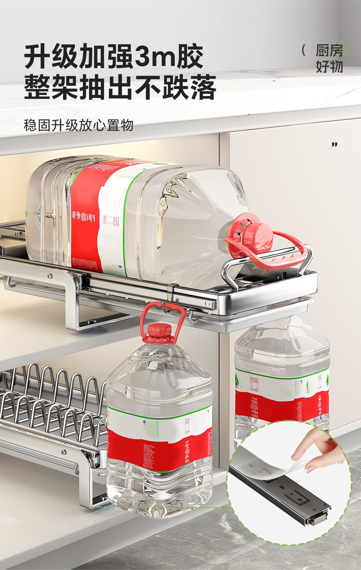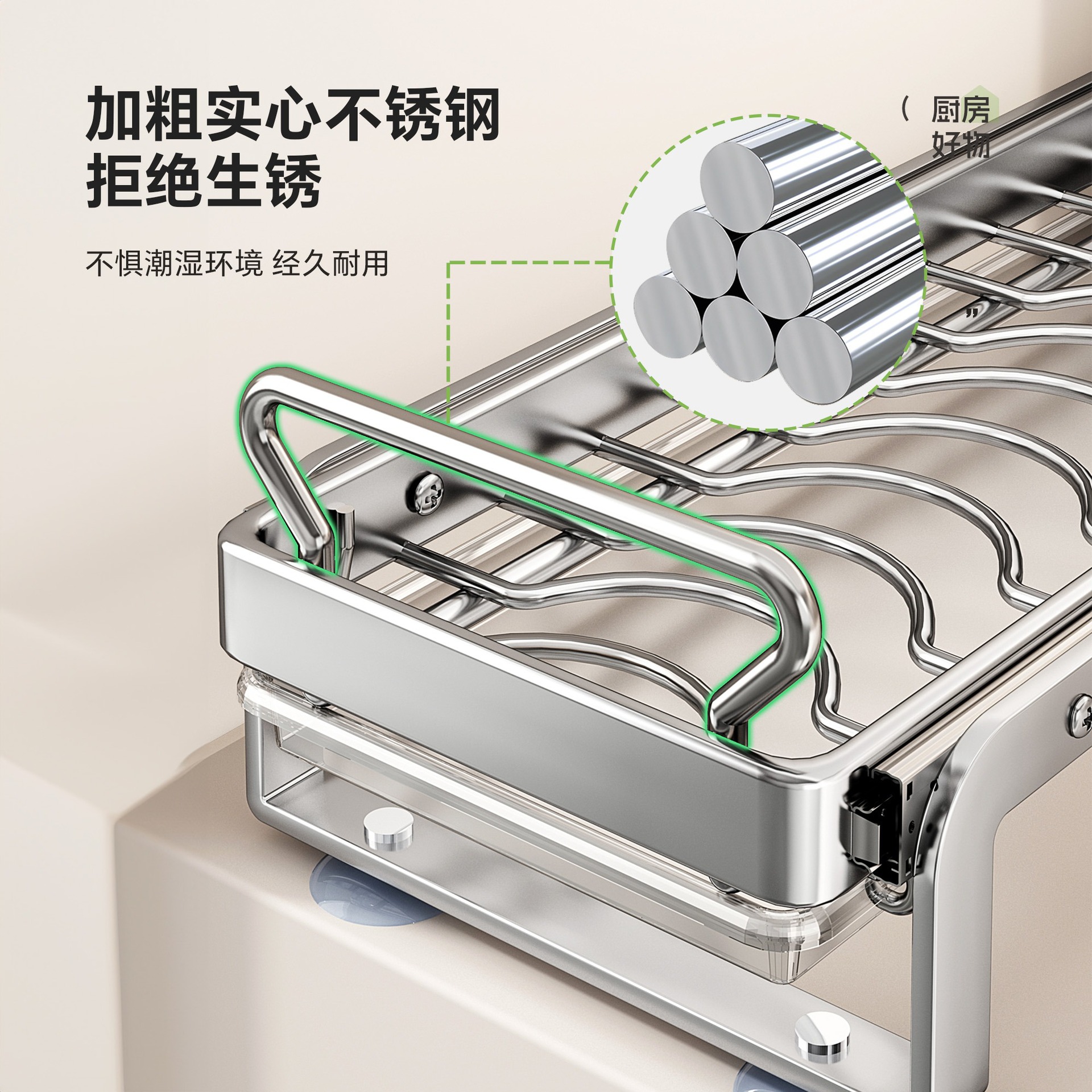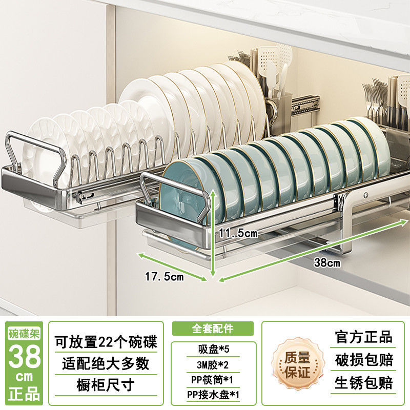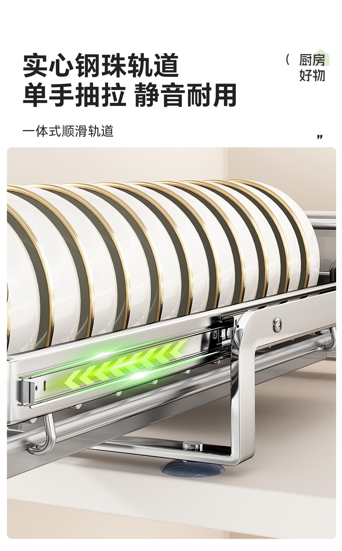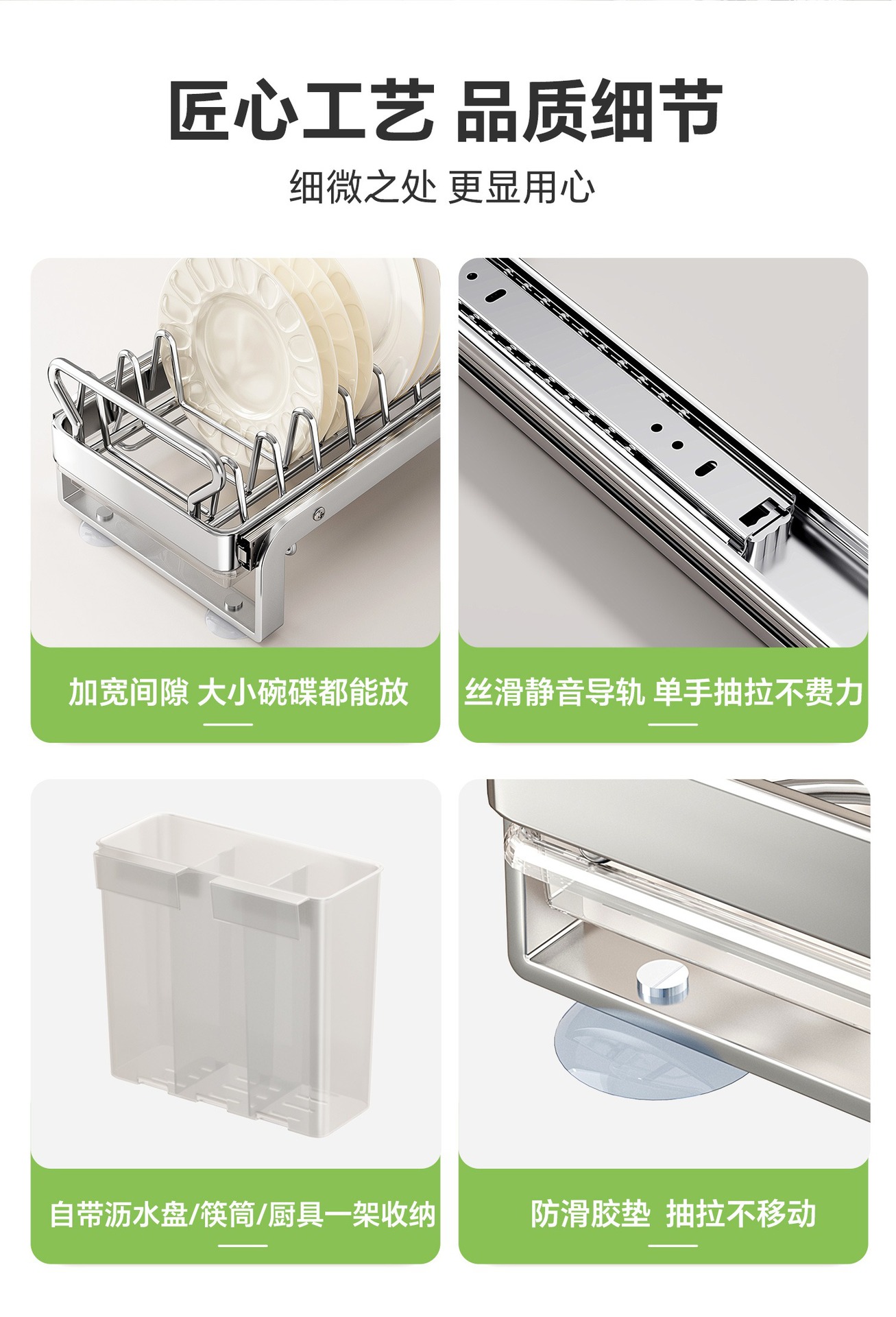 实心不锈钢抽拉碗碟收纳架厨房抽屉式拉篮橱柜内置沥水碗架置物架