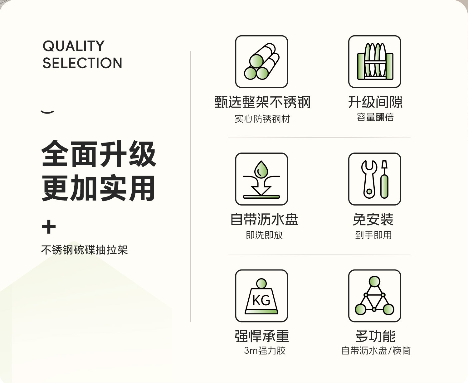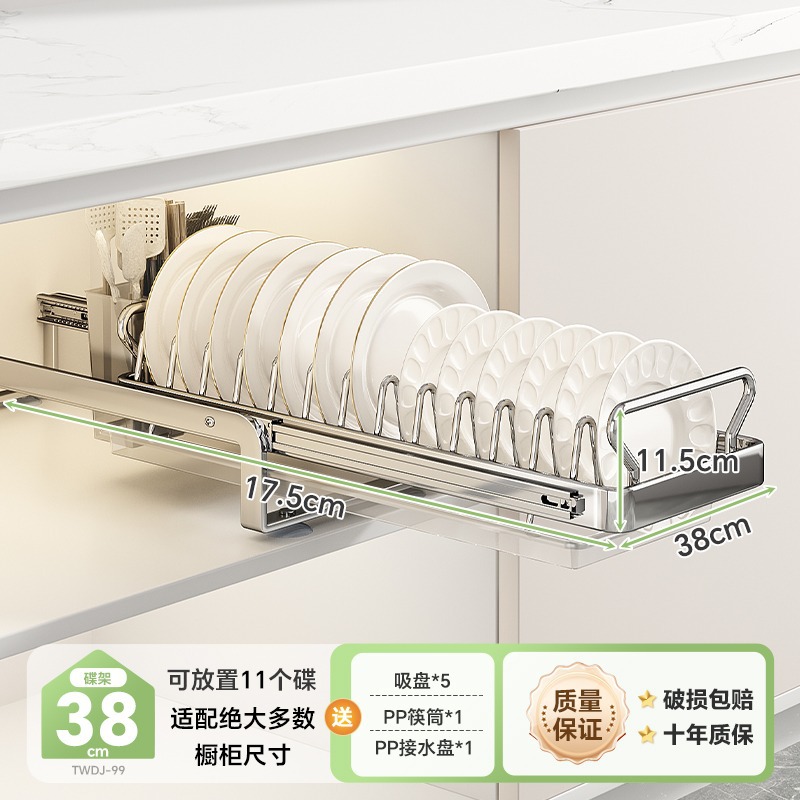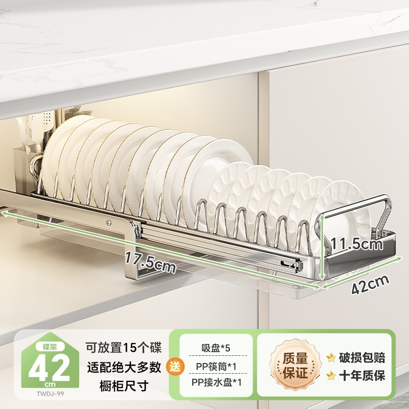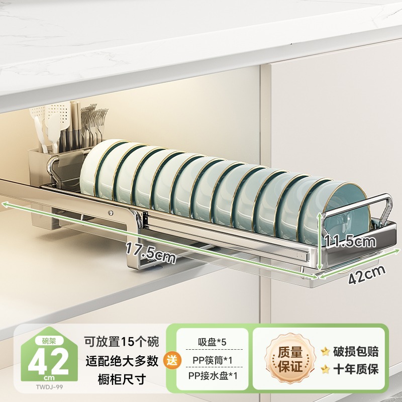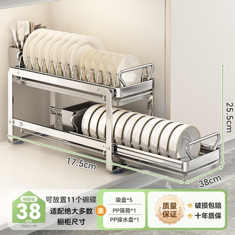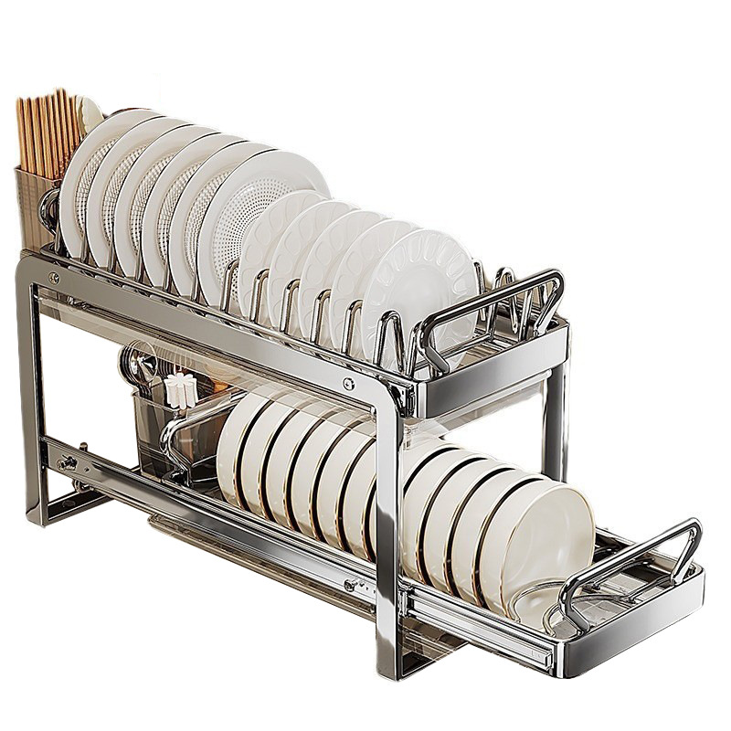 实心不锈钢抽拉碗碟收纳架厨房抽屉式拉篮橱柜内置沥水碗架置物架