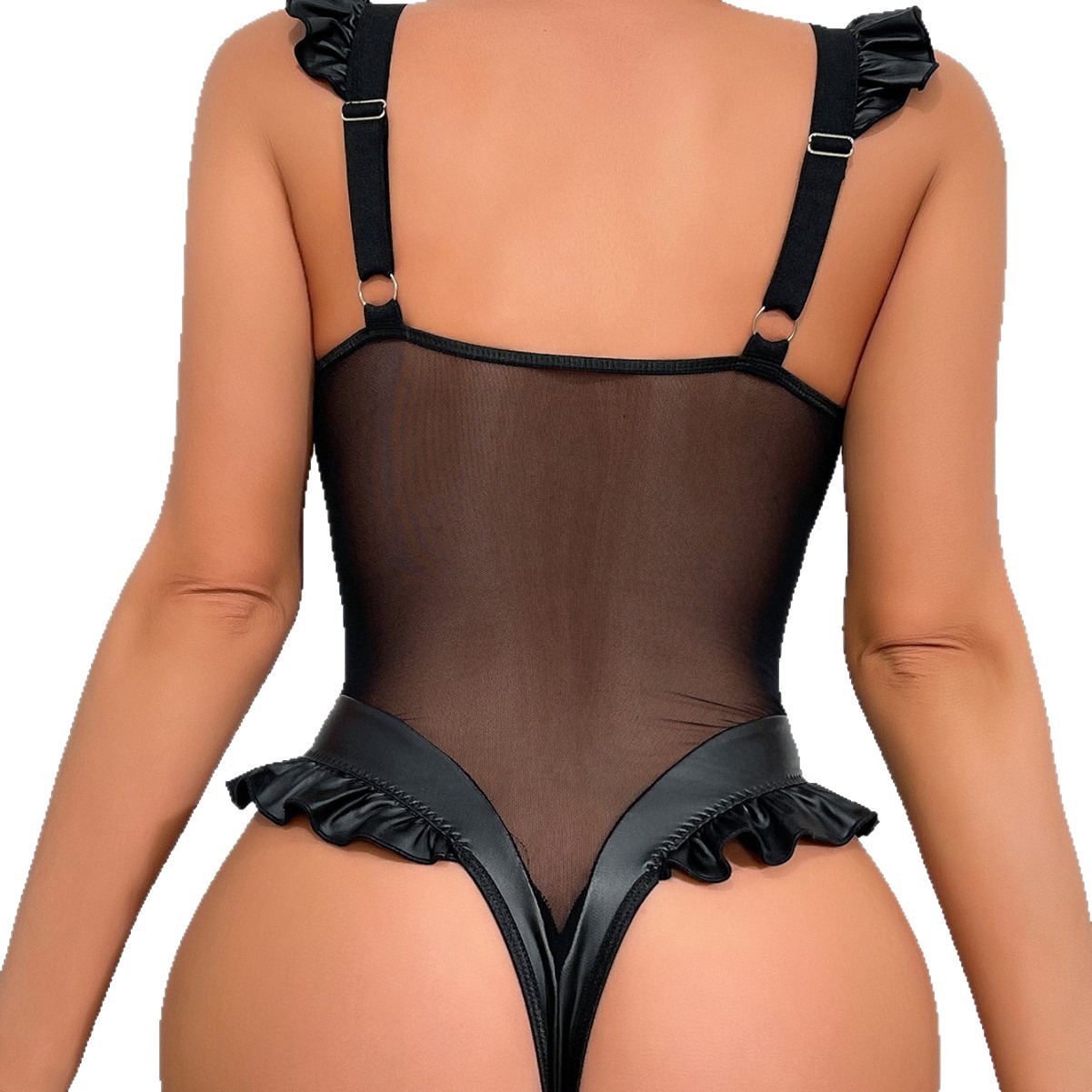 外贸货源跨境欧美新款性感木耳边薄透网纱PU吊带连体情趣内衣套装