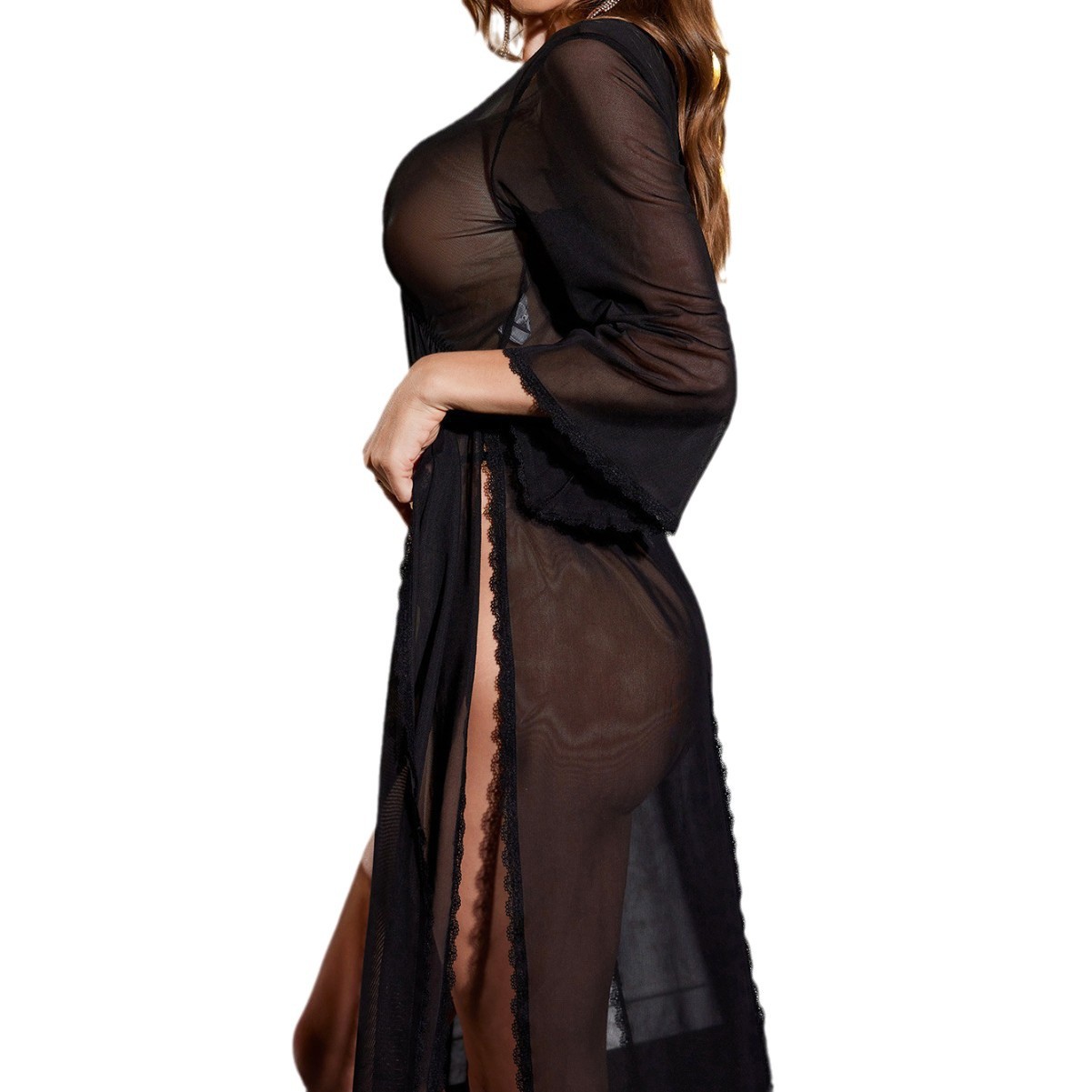 外贸货源跨境欧美新款性感薄透网纱蕾丝高开长袖睡裙情趣内衣套装