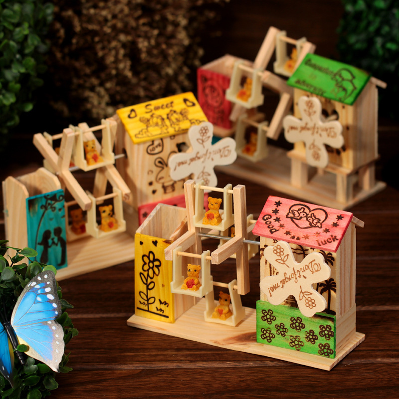 彩色风车笔筒木质音乐盒地中海风情八音盒文具笔插摆件货源批发