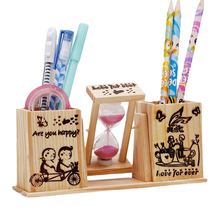 B616带沙漏双笔筒摆件 计时器 创意桌面木质摆饰 学生办公文具笔