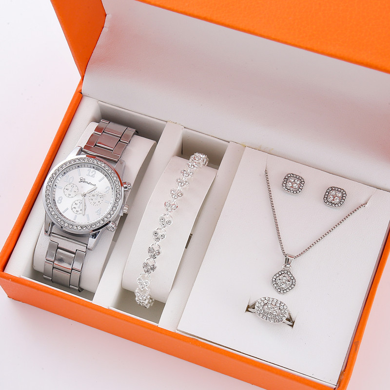 5pcs/set钢带女表 假三眼女士休闲韩版石英手表套装(橘色盒子)
