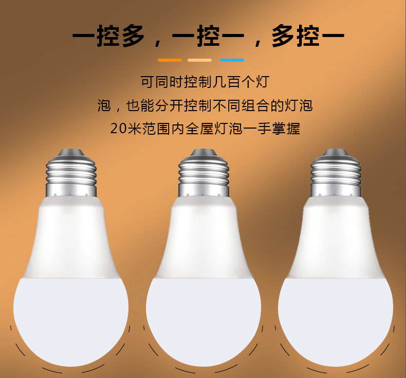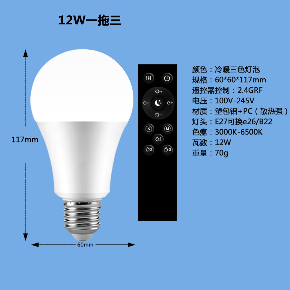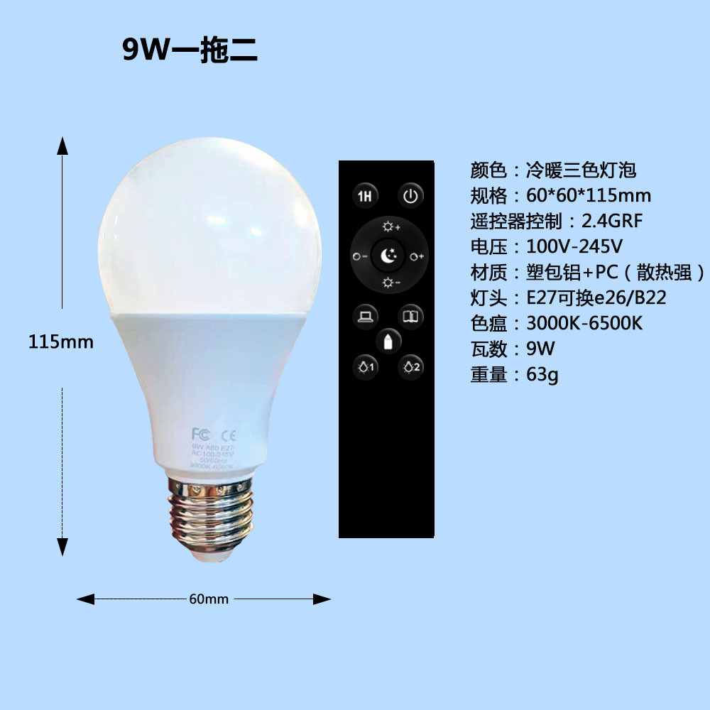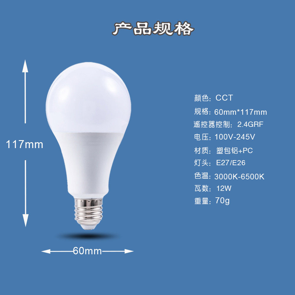 跨境智能2.4g遥控宽压三色温灯泡可无极调光调色led球泡灯螺口e26