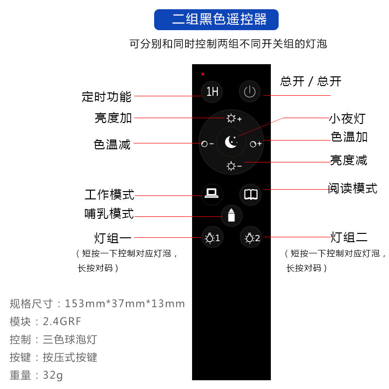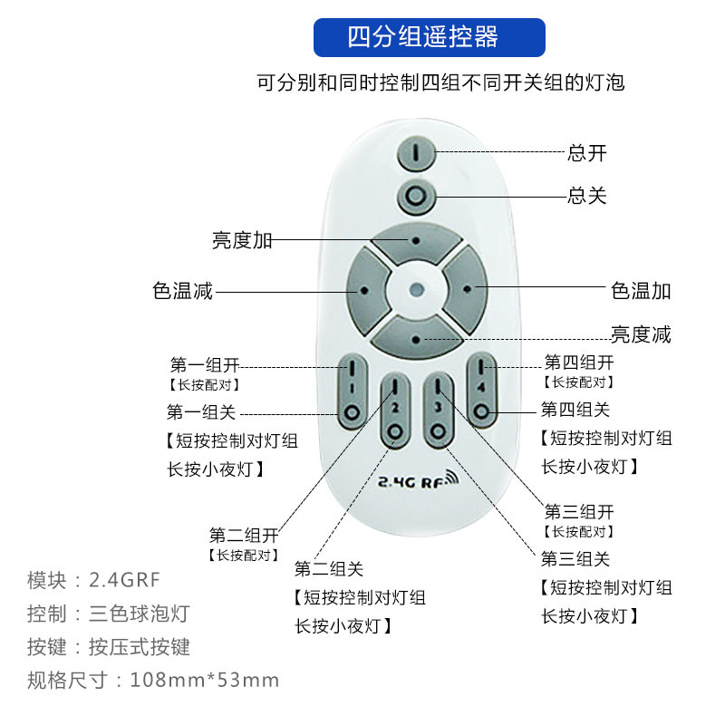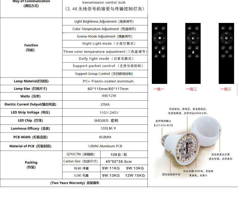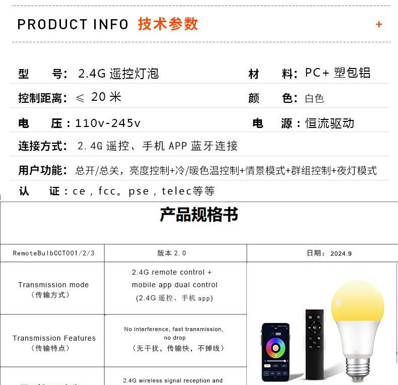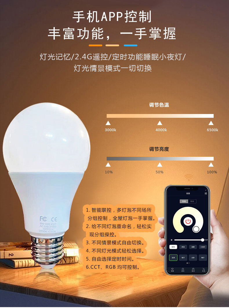 跨境智能2.4g遥控宽压三色温灯泡可无极调光调色led球泡灯螺口e26