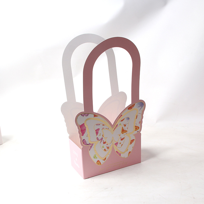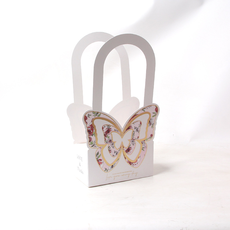 立体感折叠手提花盒随手拎蝴蝶花篮烫金纸折叠礼品盒鲜花店插花盒