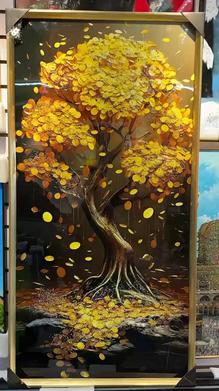 实拍外贸畅销款发财树玄关过道挂画竖板金色树晶瓷晶钻装饰画实拍