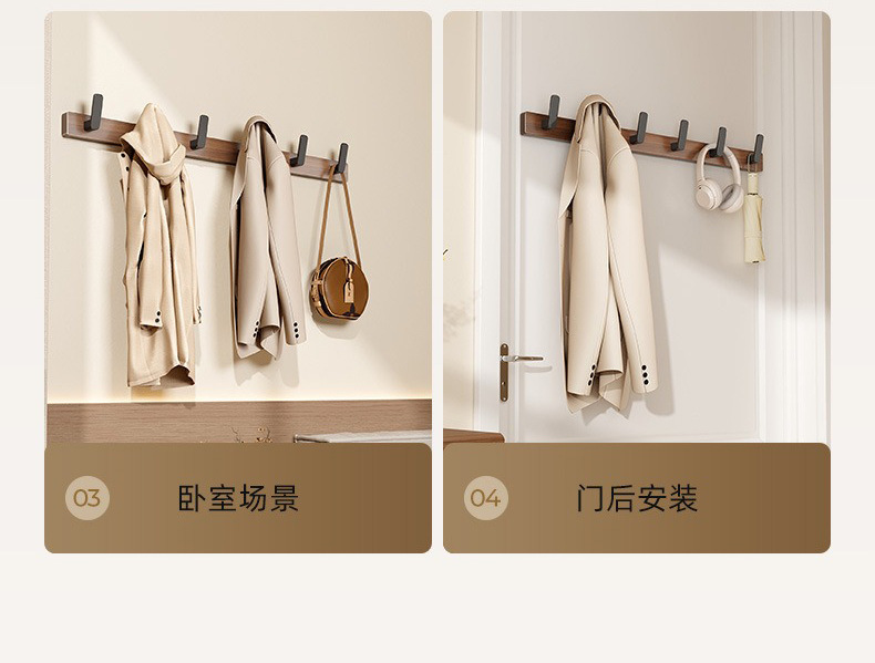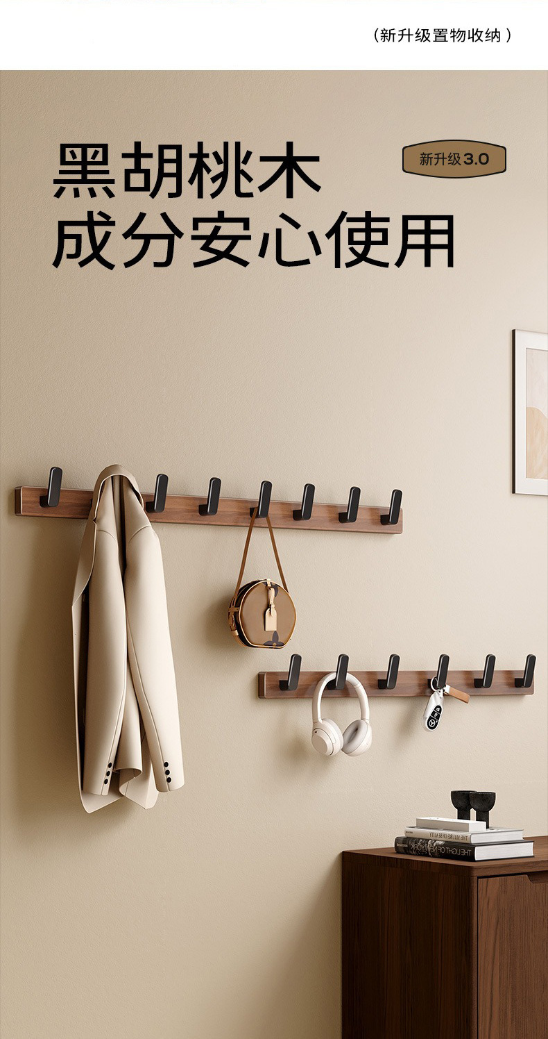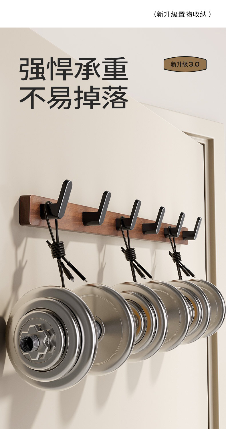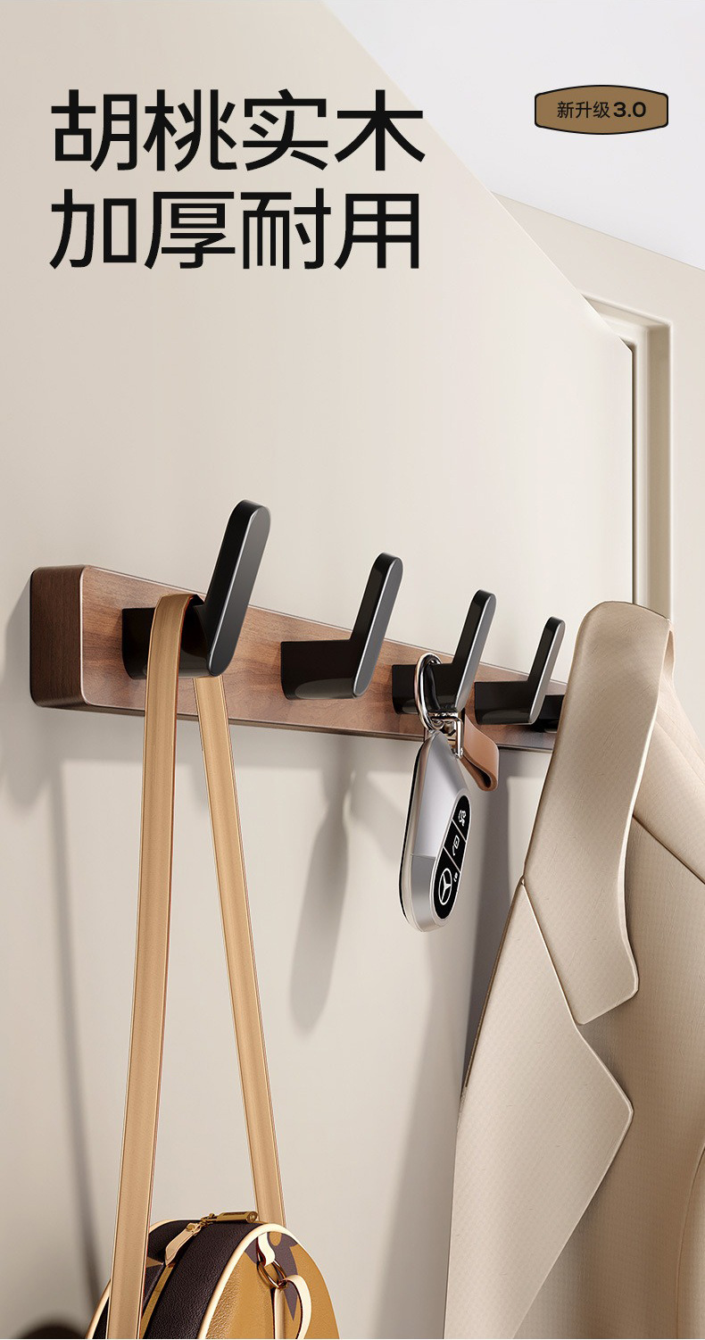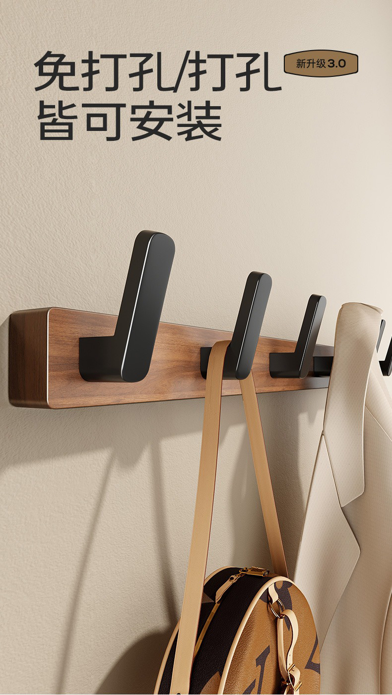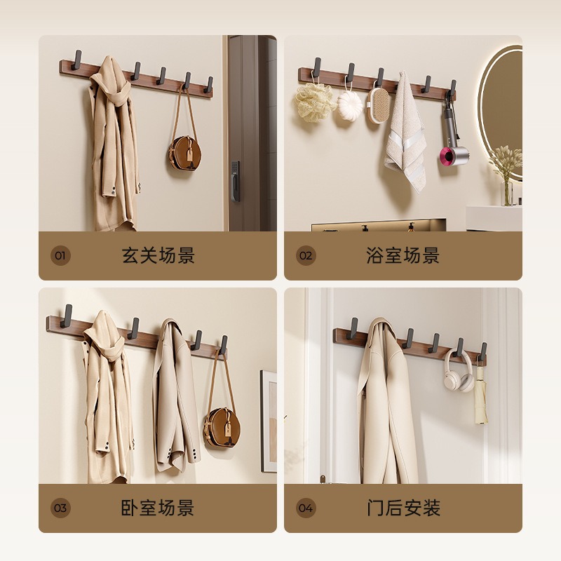 高文海胡桃木挂钩排钩打孔收纳神器卫生间浴室家用墙上挂衣架壁挂