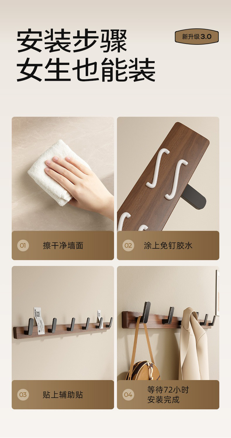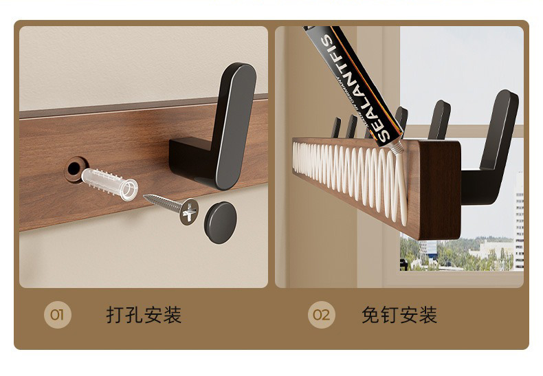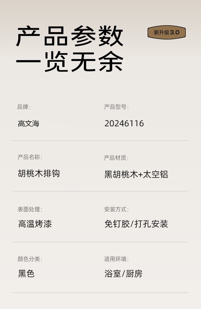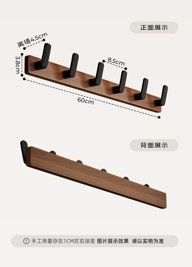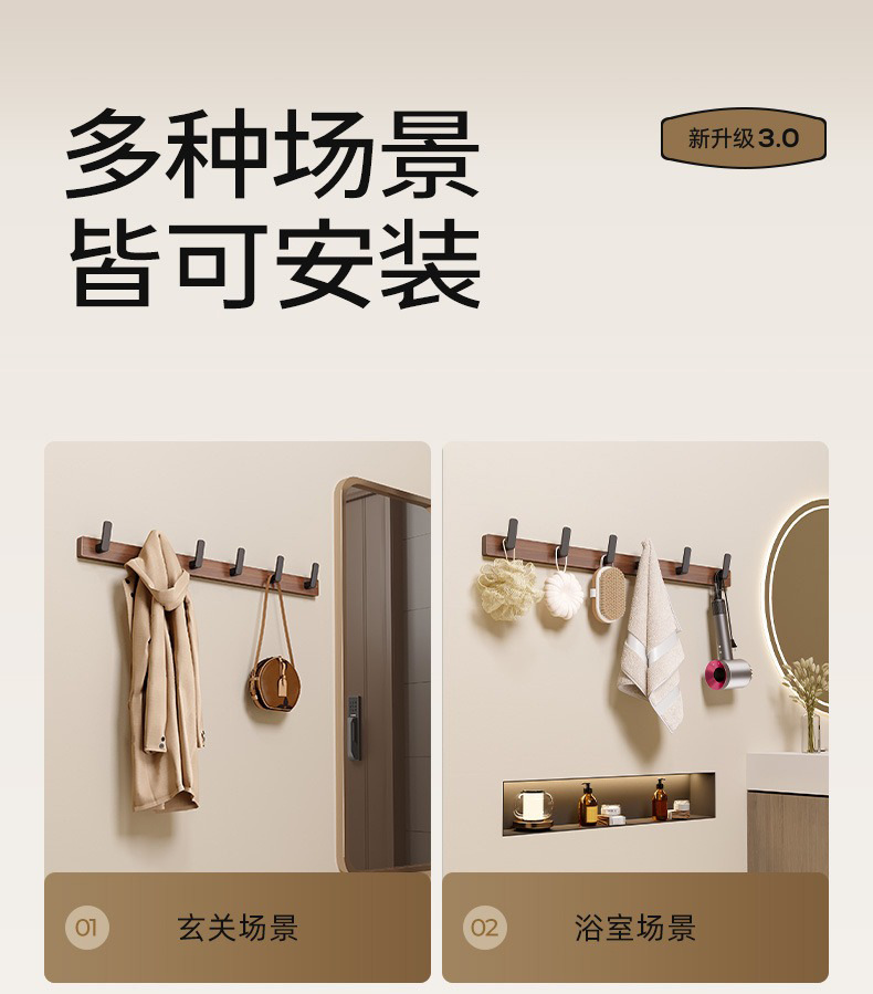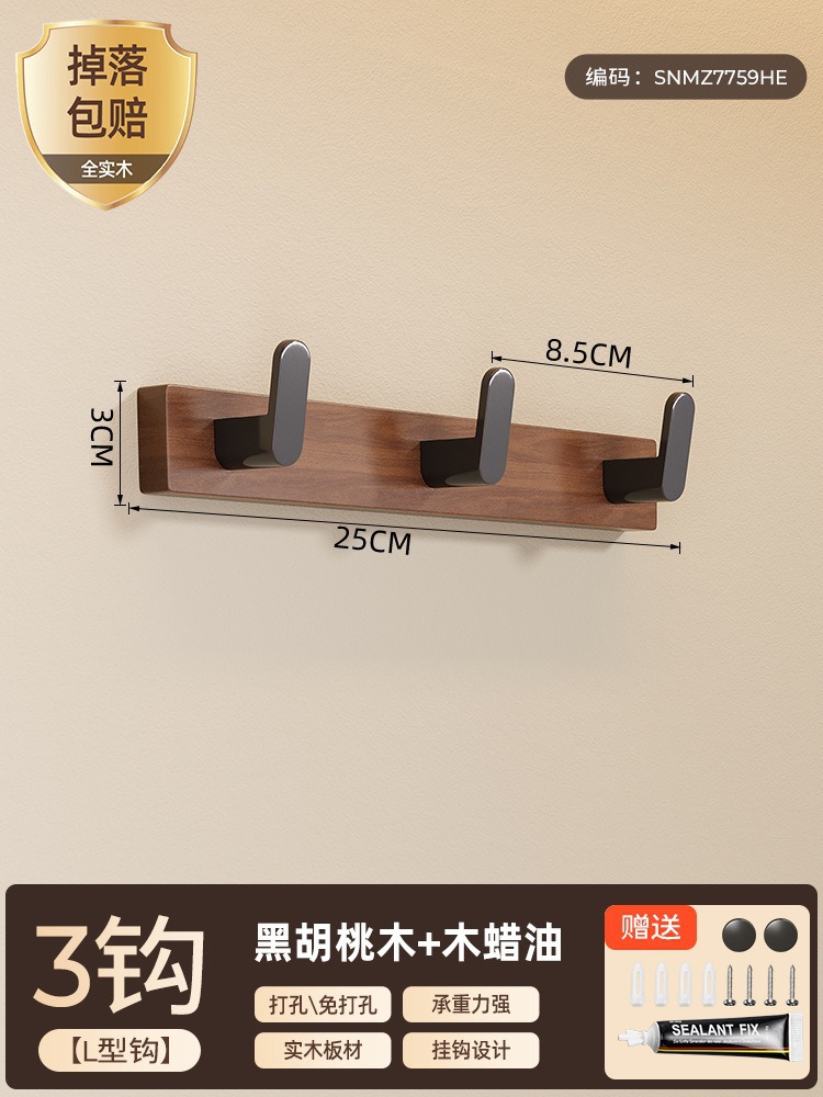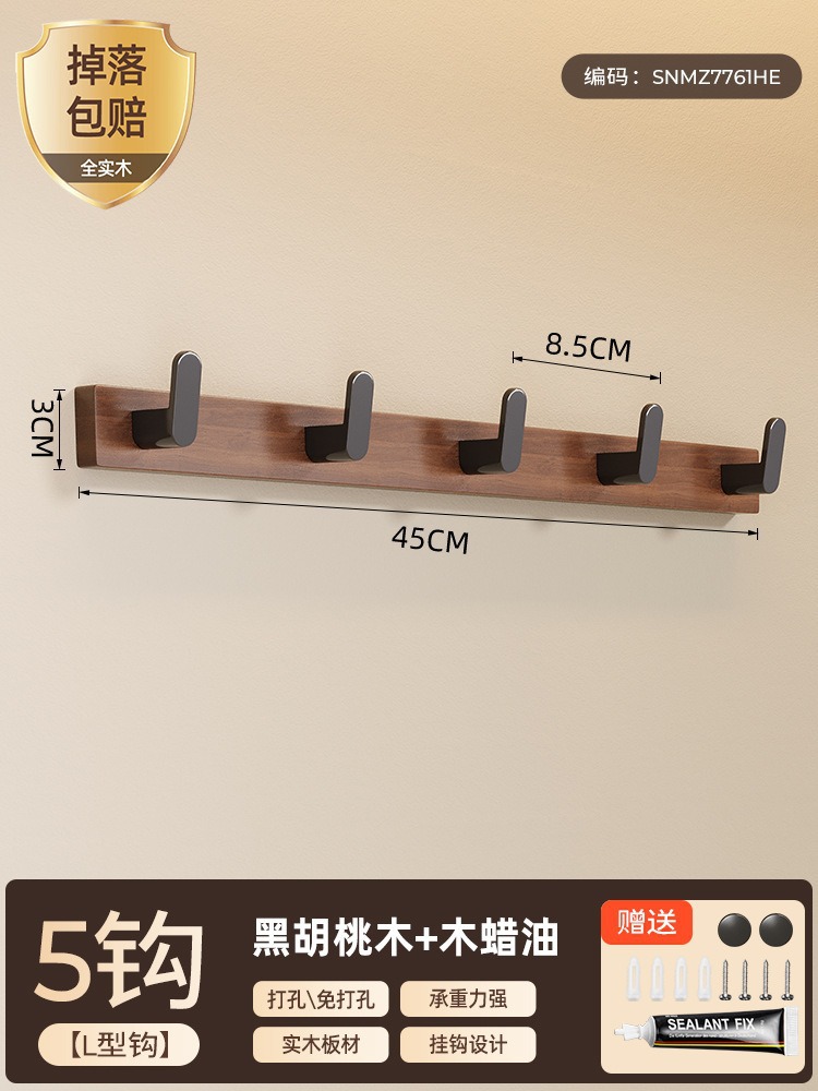高文海胡桃木挂钩排钩打孔收纳神器卫生间浴室家用墙上挂衣架壁挂