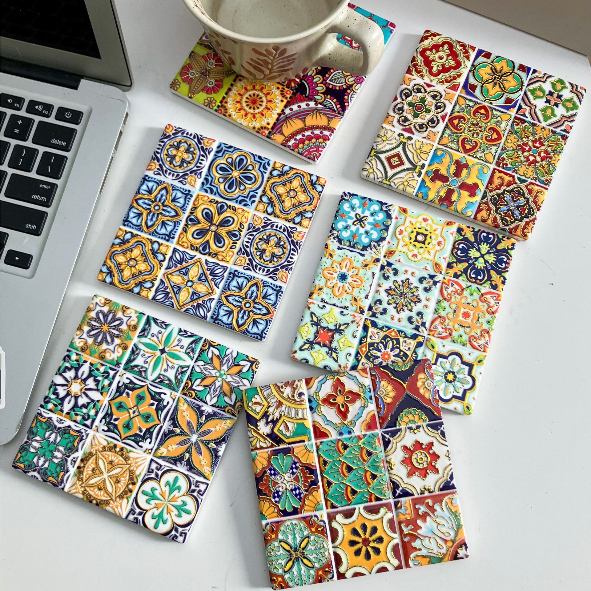 跨境新款方形3D浮雕烫金杯垫背面软木防滑隔热欧美咖啡复古茶杯垫