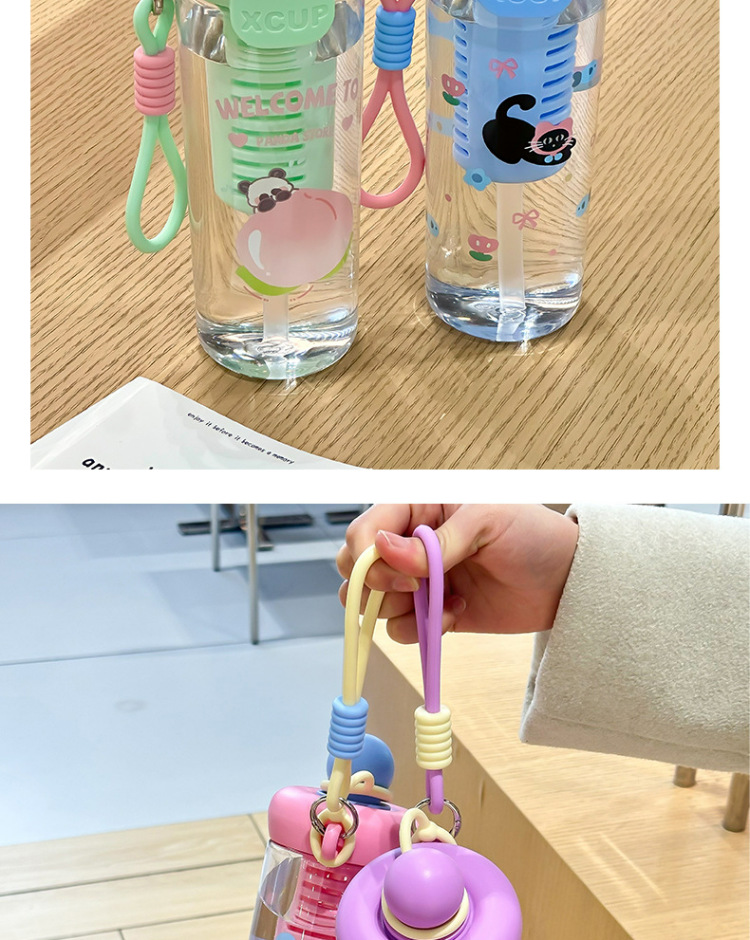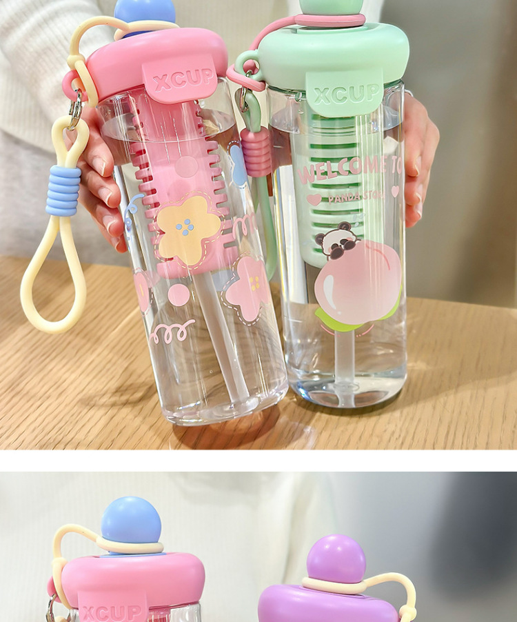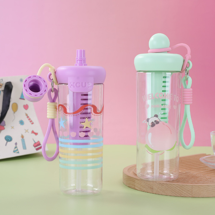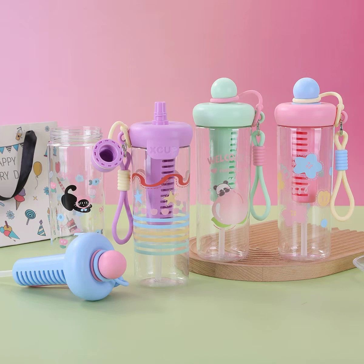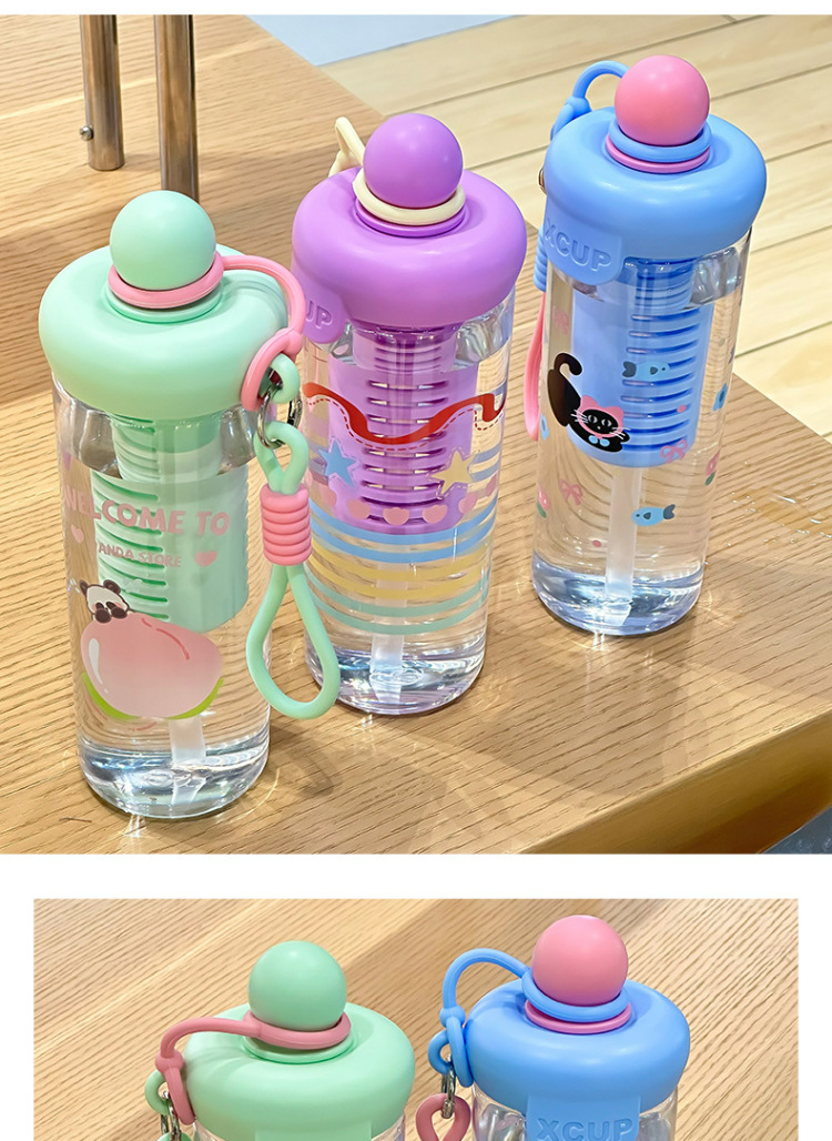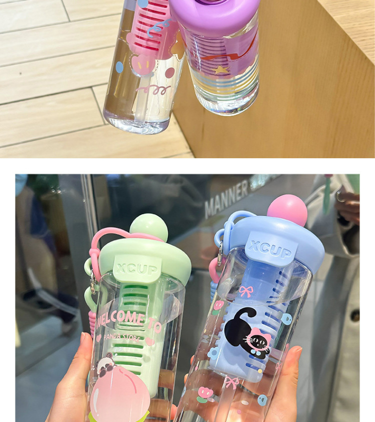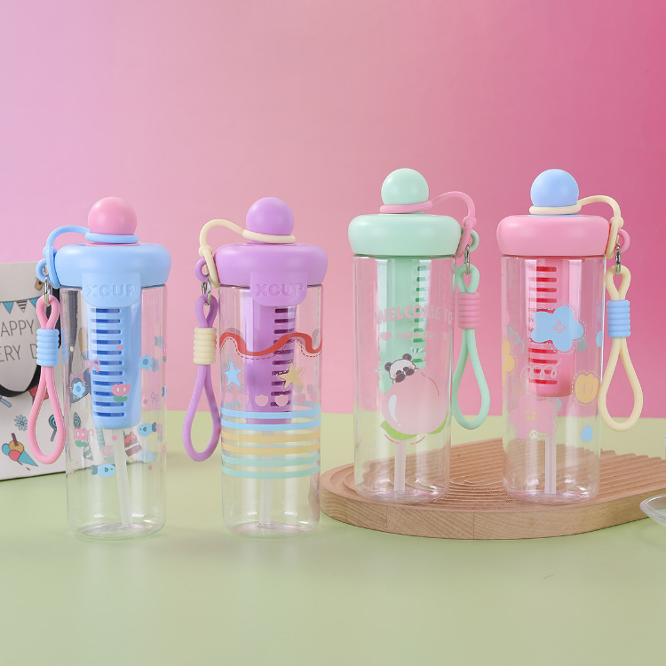 2025新款卡通大容量吸管杯茶水分离泡茶杯户外运动带提绳塑料水杯