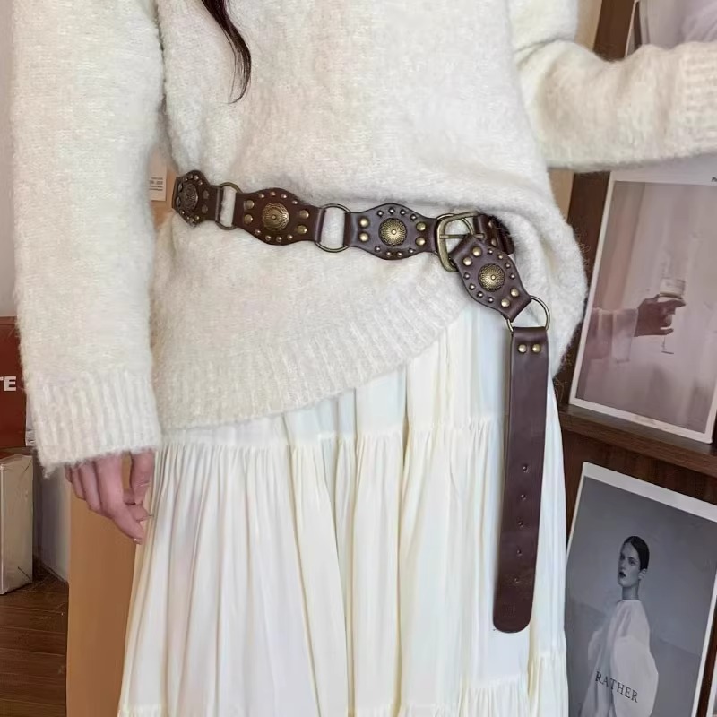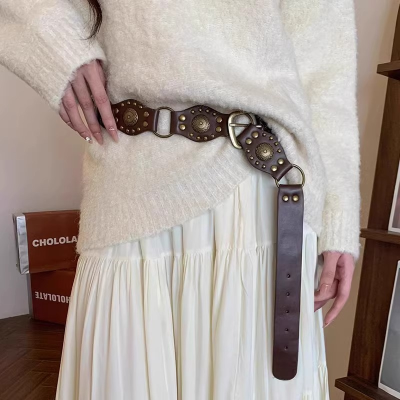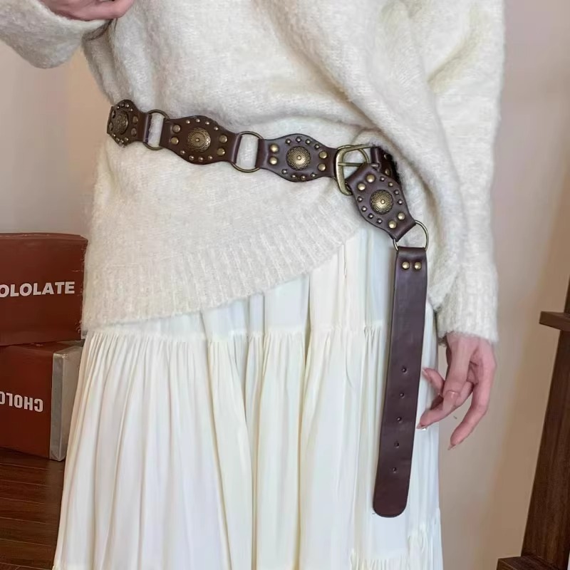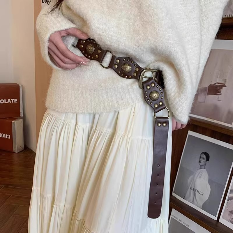 西部牛仔环扣腰带美式废土风复古棕色铆钉腰带ins风百搭潮流裤带