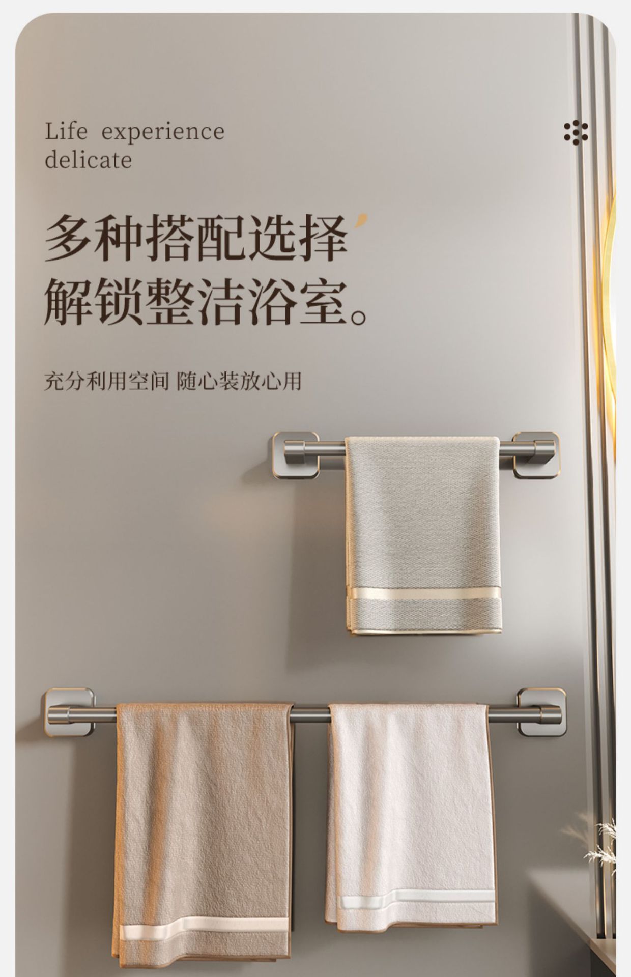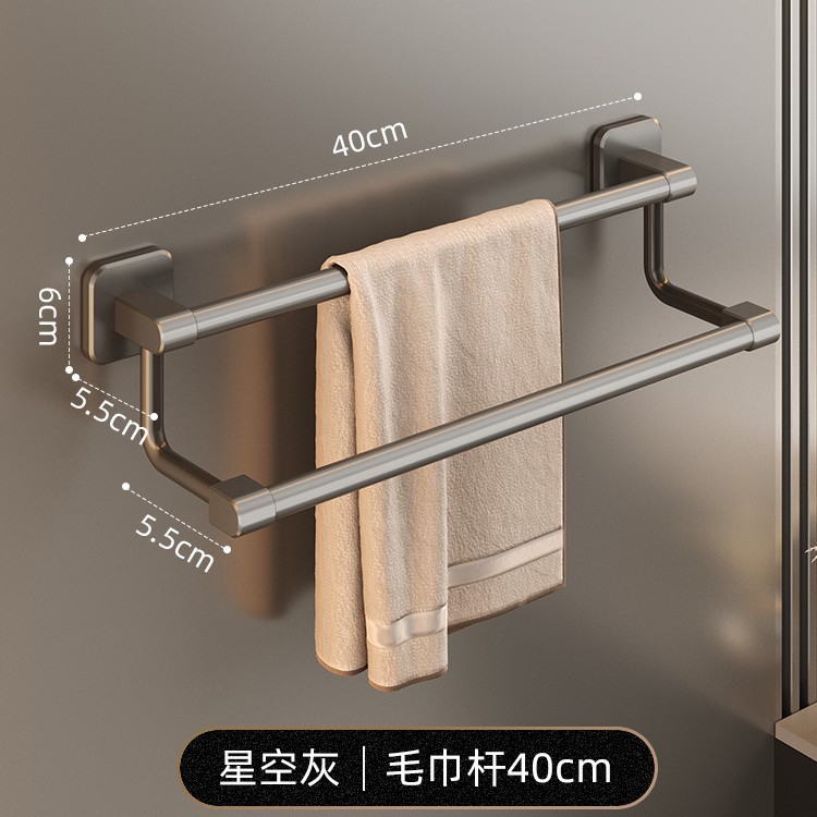 免打孔枪灰色单杆毛巾架浴室毛巾杆挂杆太空铝卫生间双杆贴片安装
