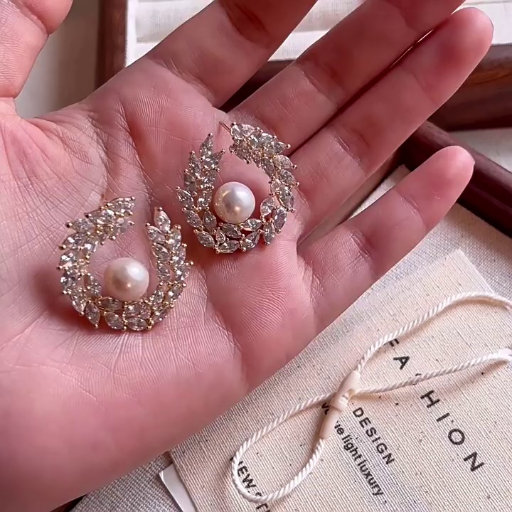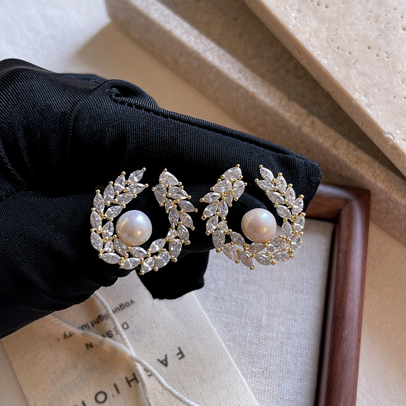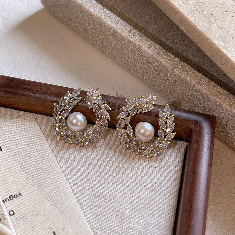 饰品真金电镀5A级锆石麦穗耳环S925纯银针玻璃珍珠耳钉网红耳饰品