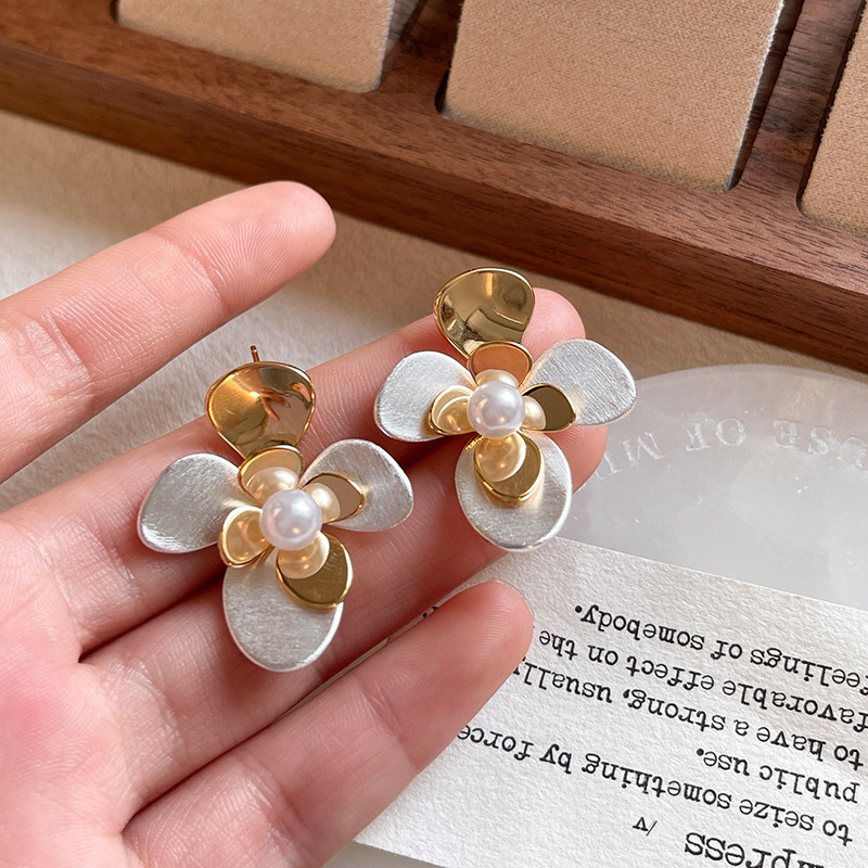 S925纯银针玻璃澳白珍珠耳钉耳饰品真金电镀撞色不规则花朵耳环女