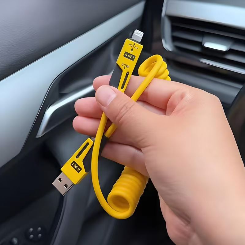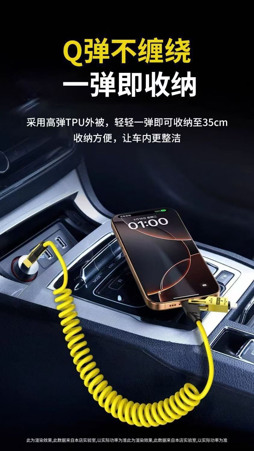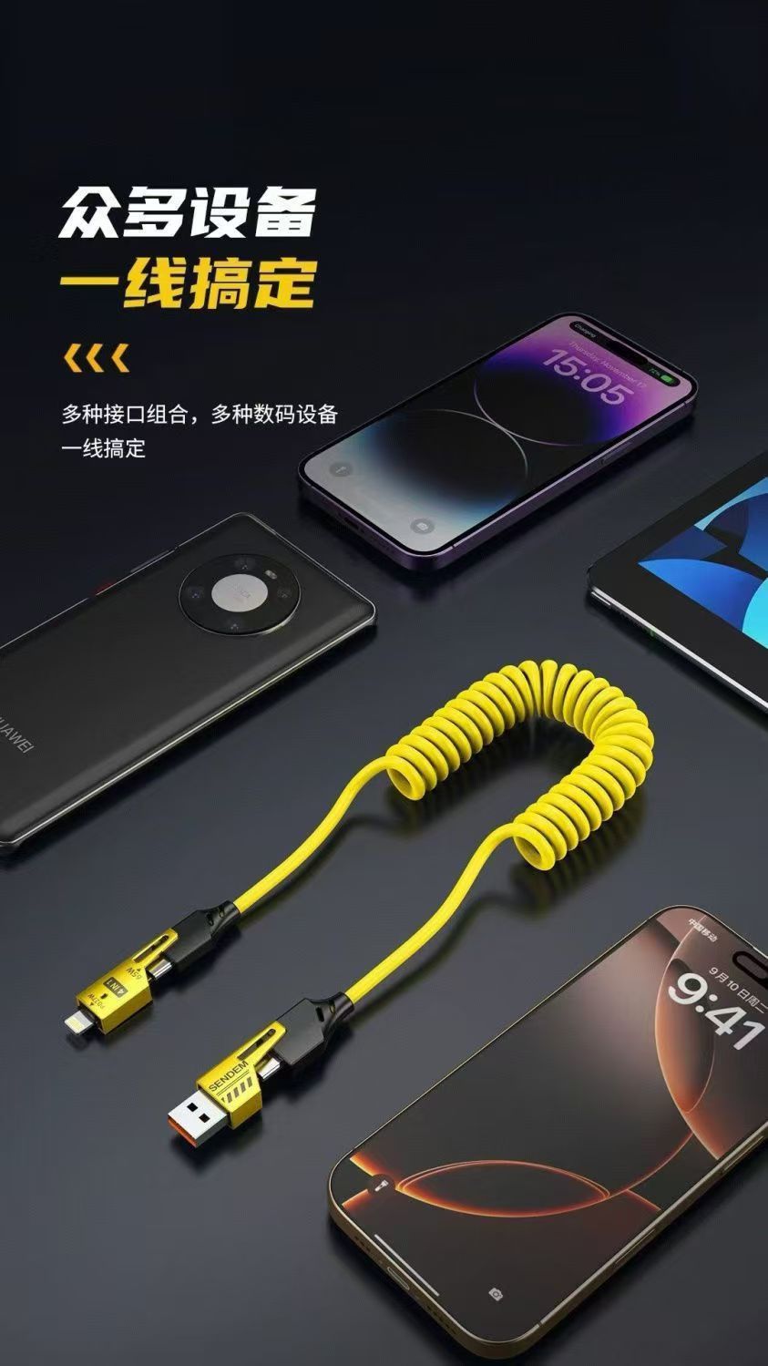 65w弹簧伸缩充电线四合一超级快充数据线适用苹果华为安卓多功能