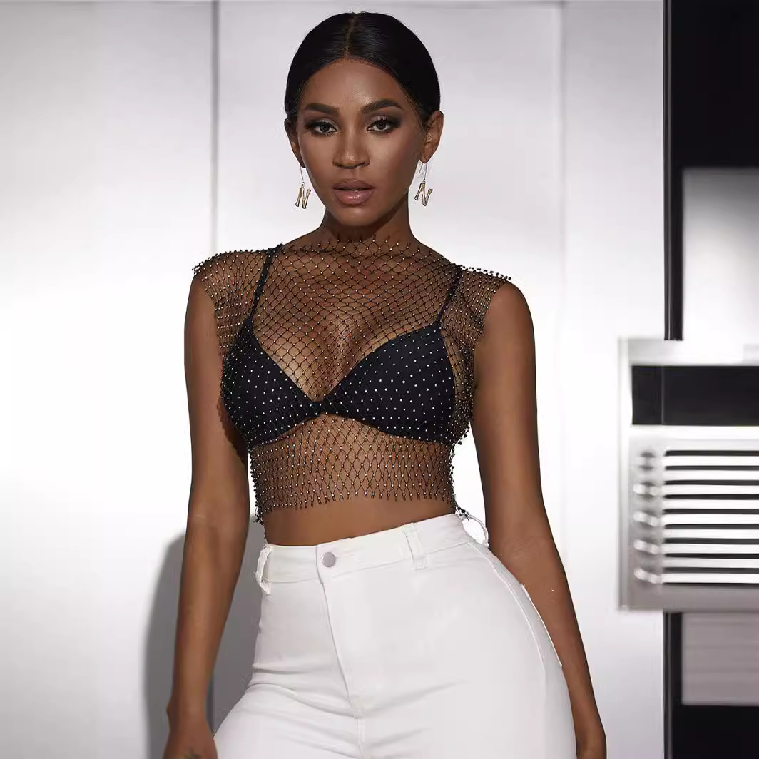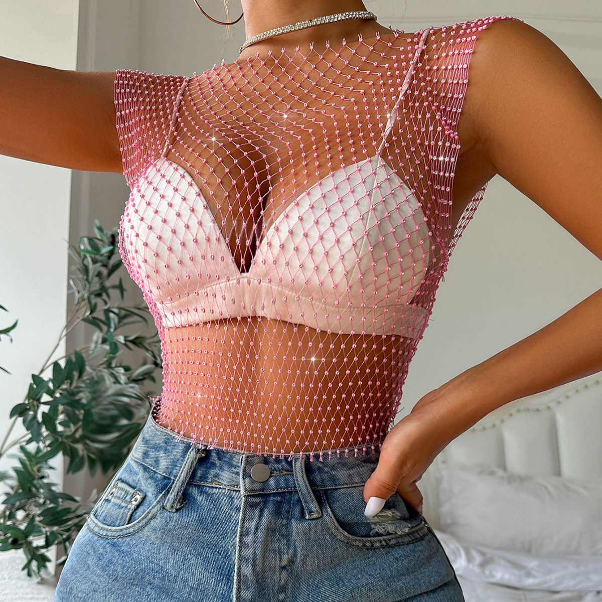 跨境货源2024Wish速卖通亚马逊夏季水钻网格闪钻女装T恤上衣YX951