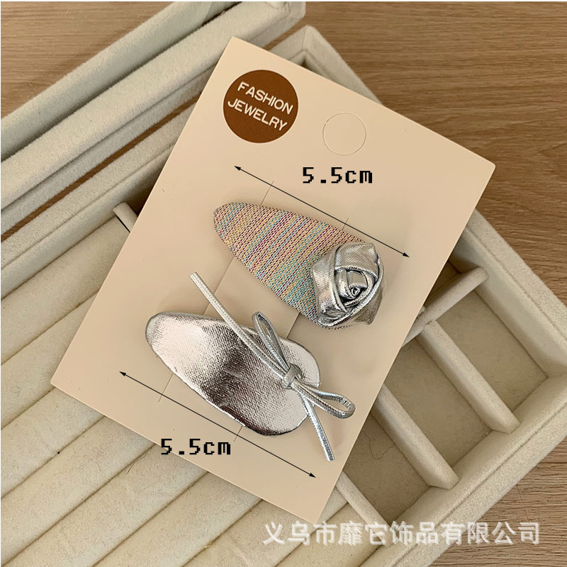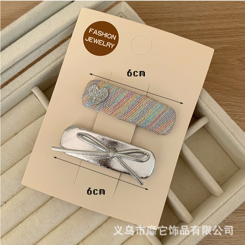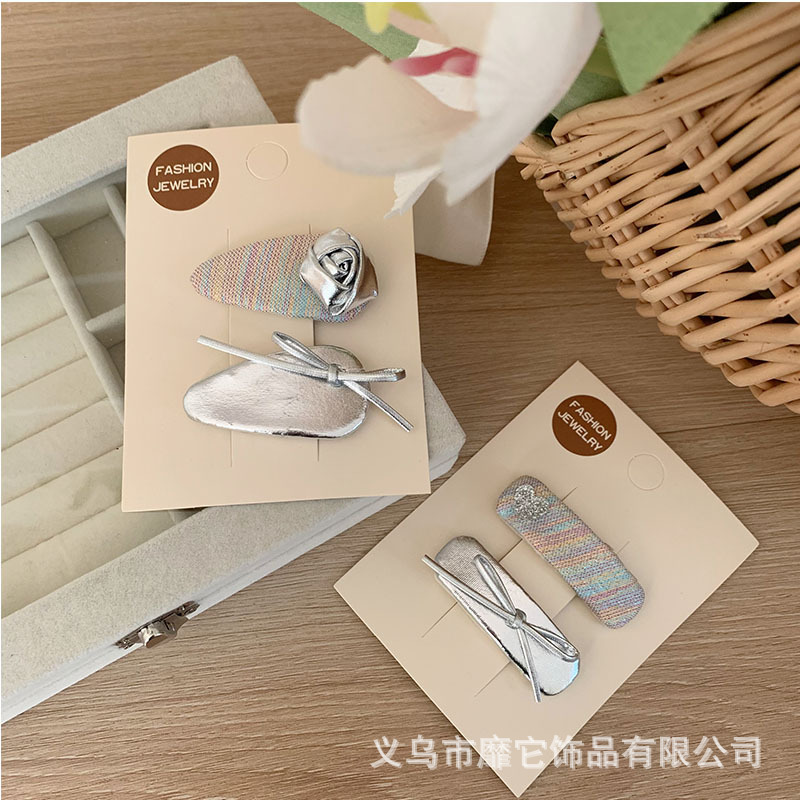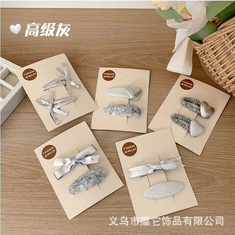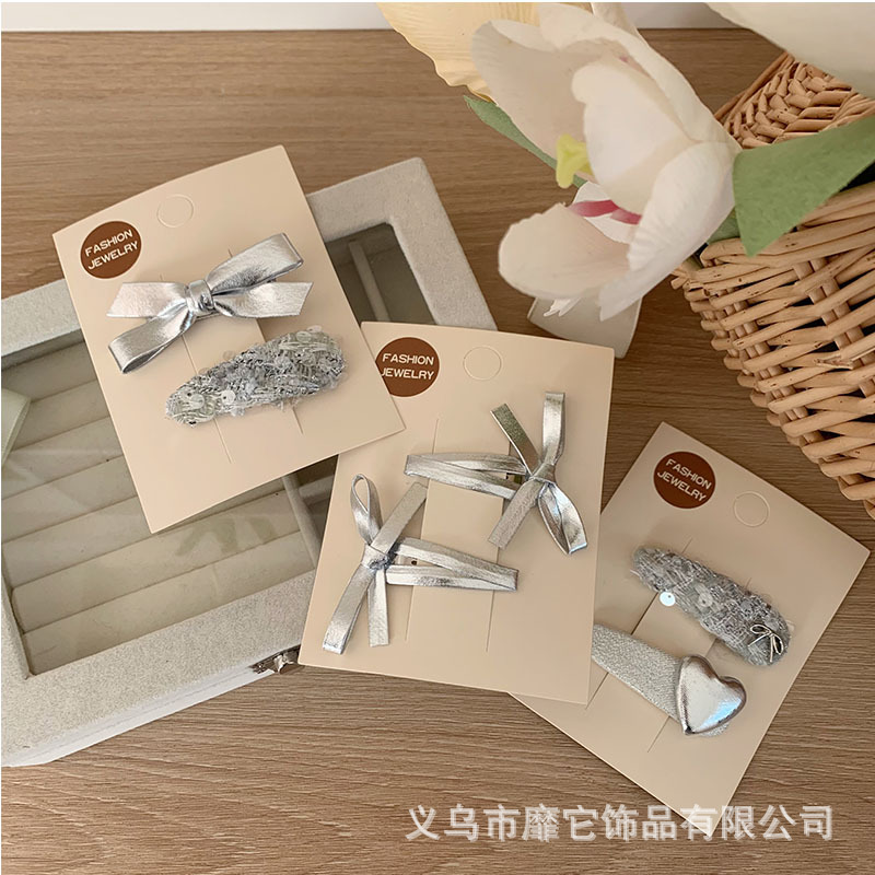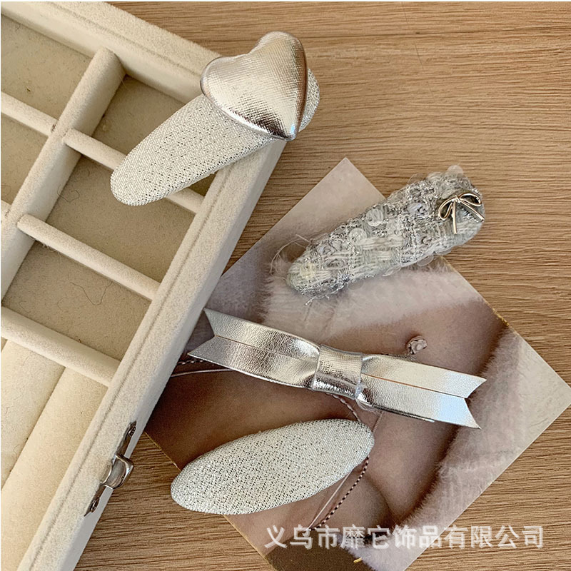 日韩银色系甜美可爱bb夹儿童皮质蝴蝶结发卡灰色甜酷侧边发夹女童