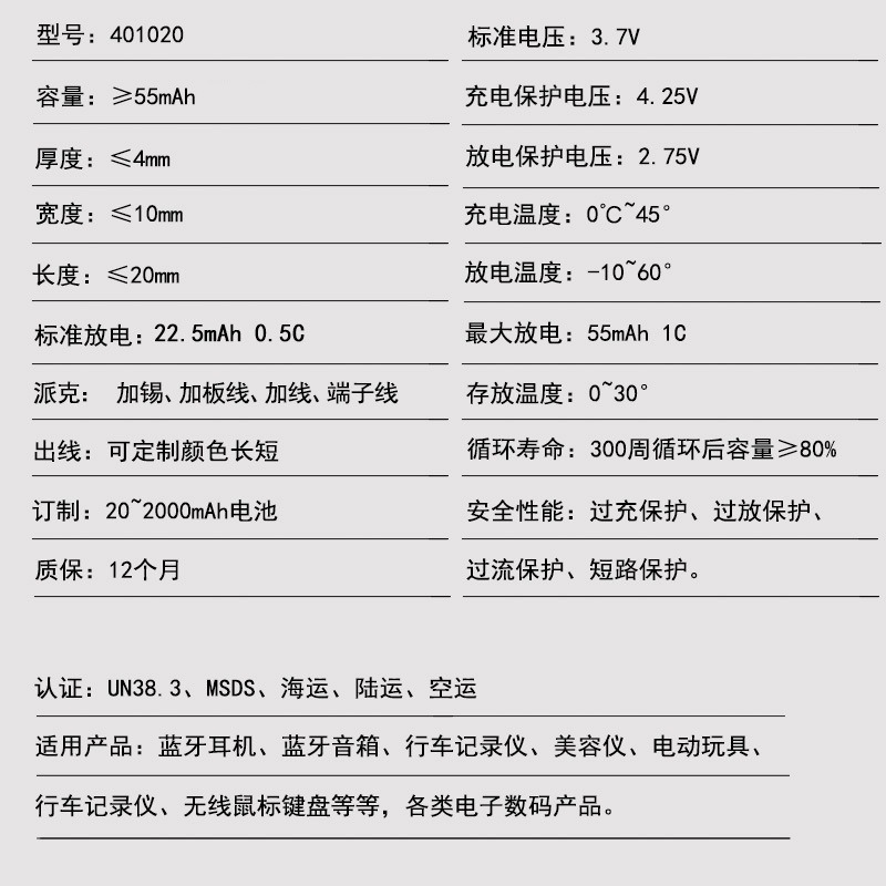 认证齐全401020锂电池55毫安软包锂电芯小夜灯点读蓝牙耳机电池