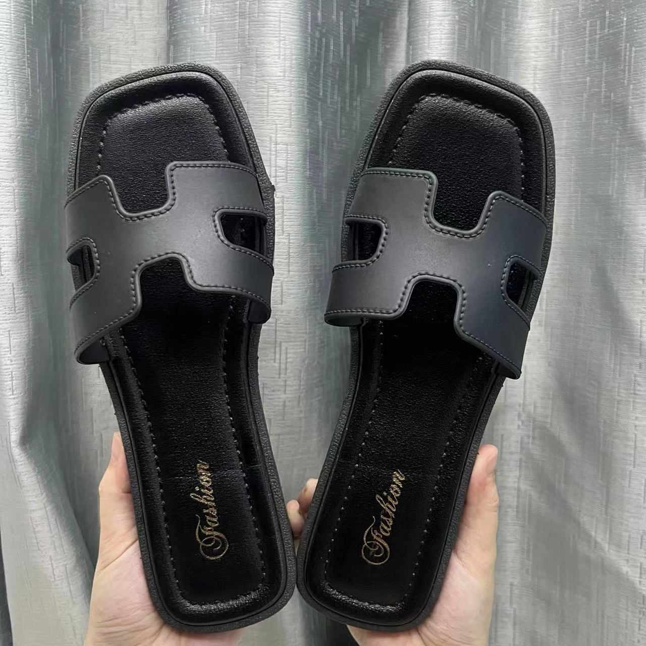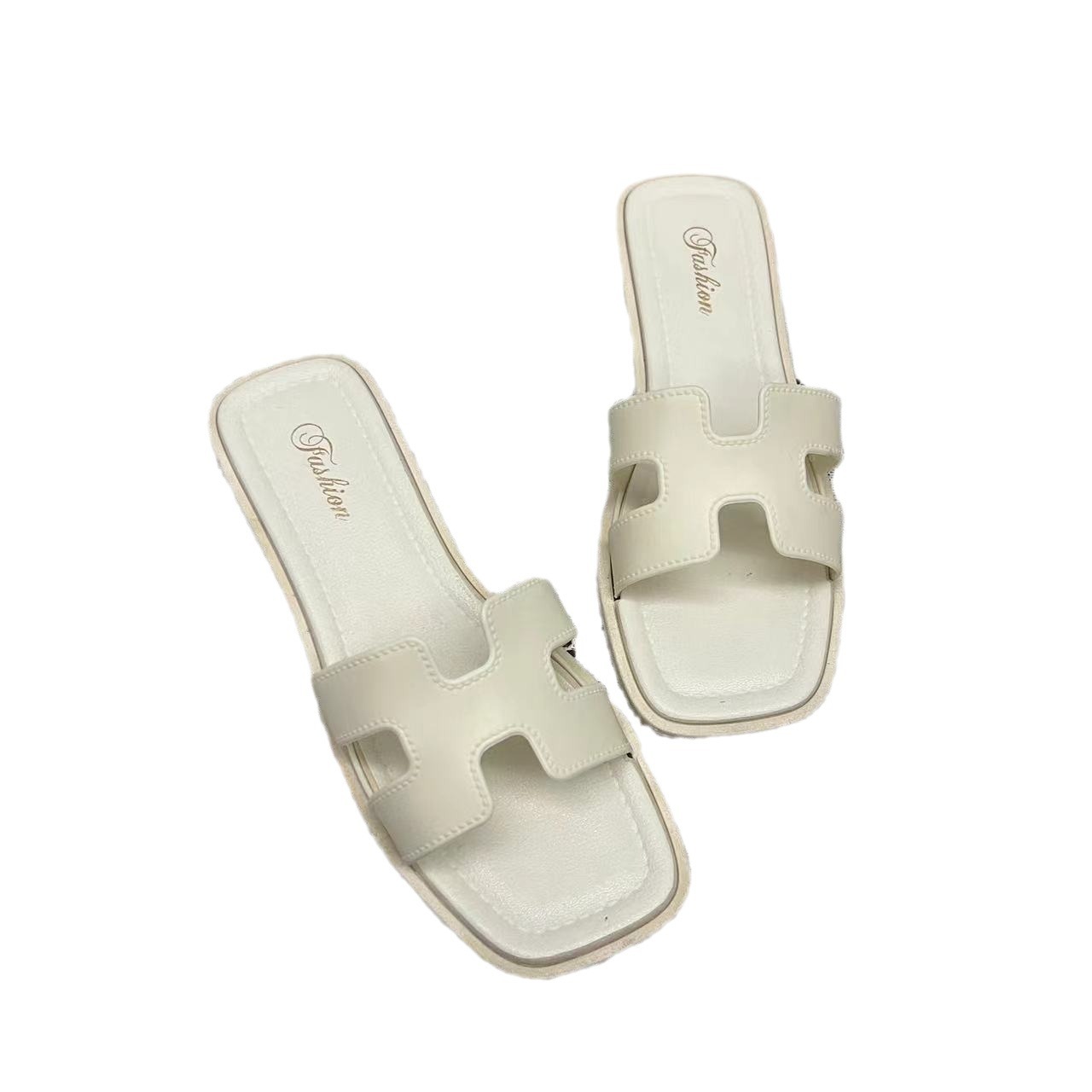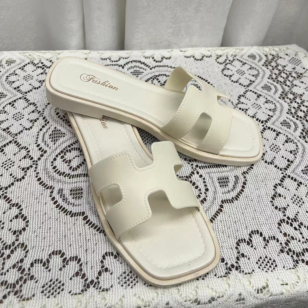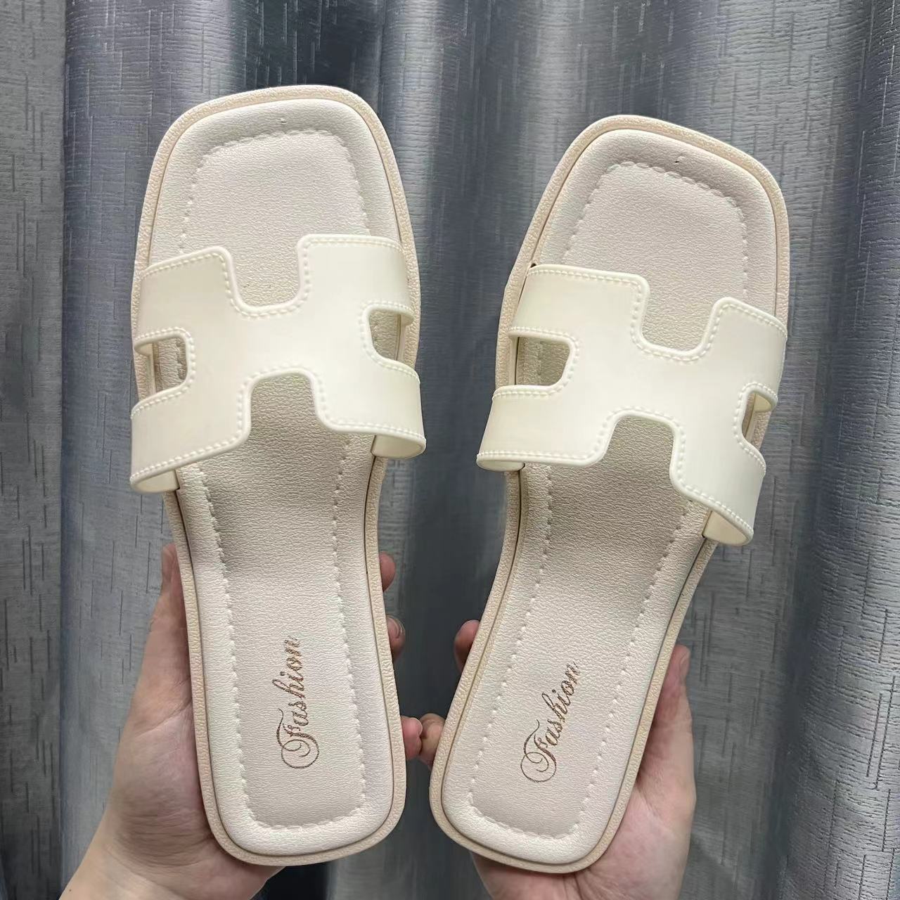 2024新款方头时尚百搭仙女风简约一字拖鞋平底罗马沙滩拖鞋女跨境