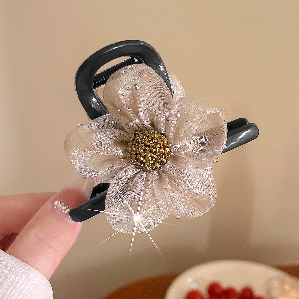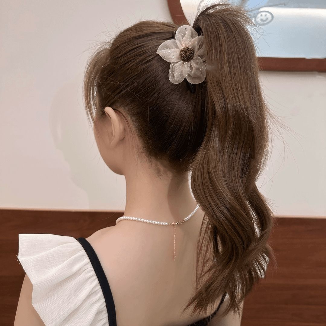 高级感网纱水钻花朵抓夹女2024新款鲨鱼夹高马尾发夹后脑勺夹发饰