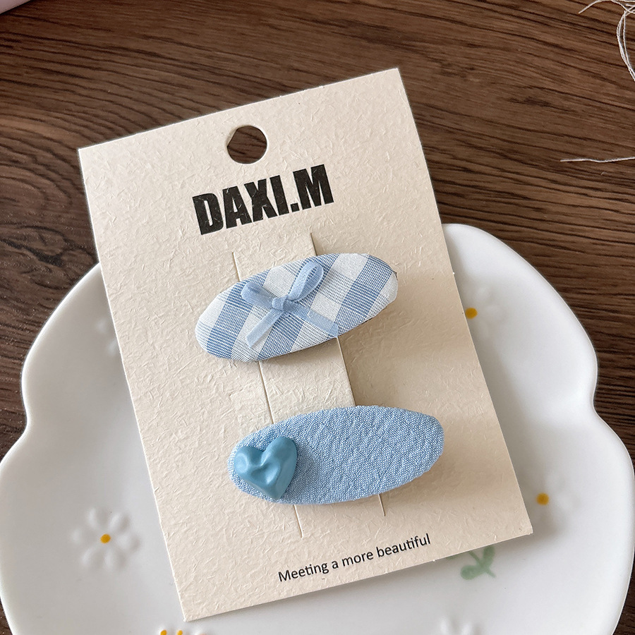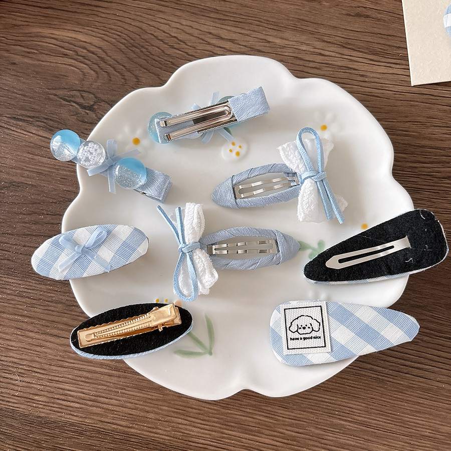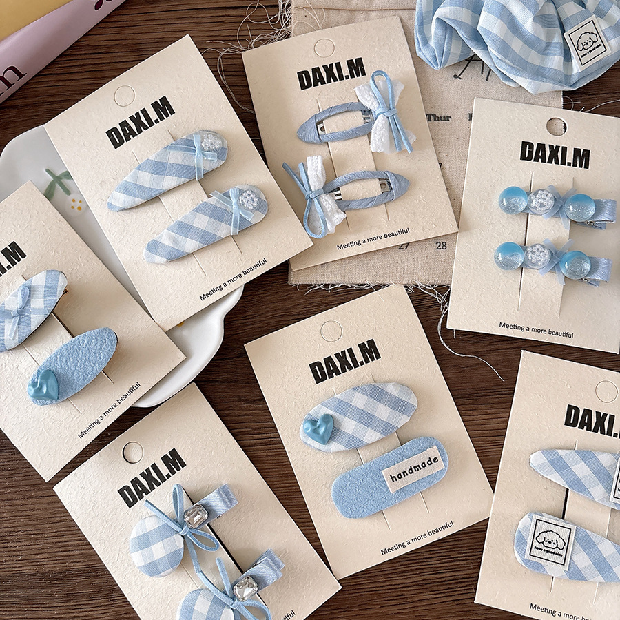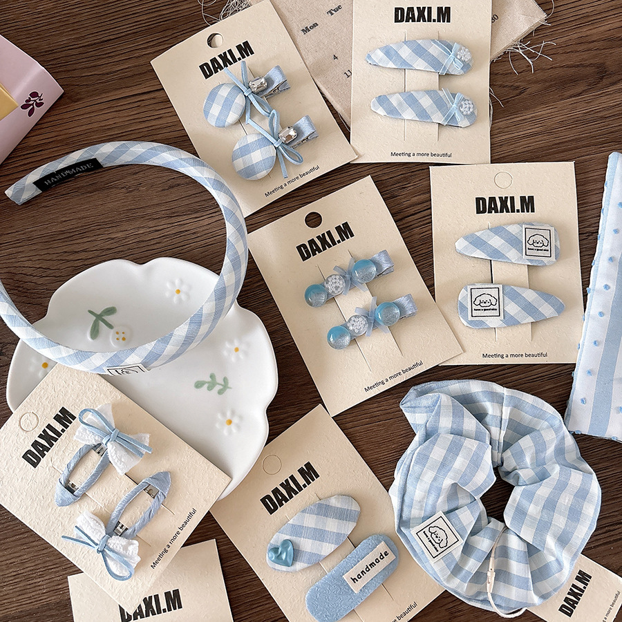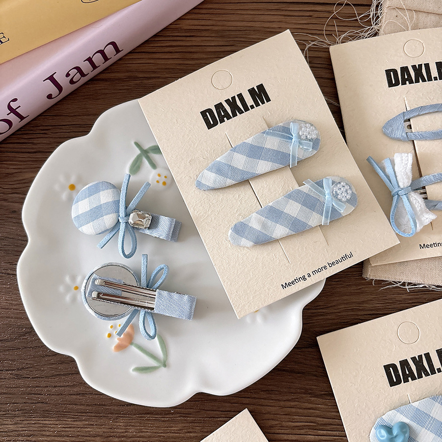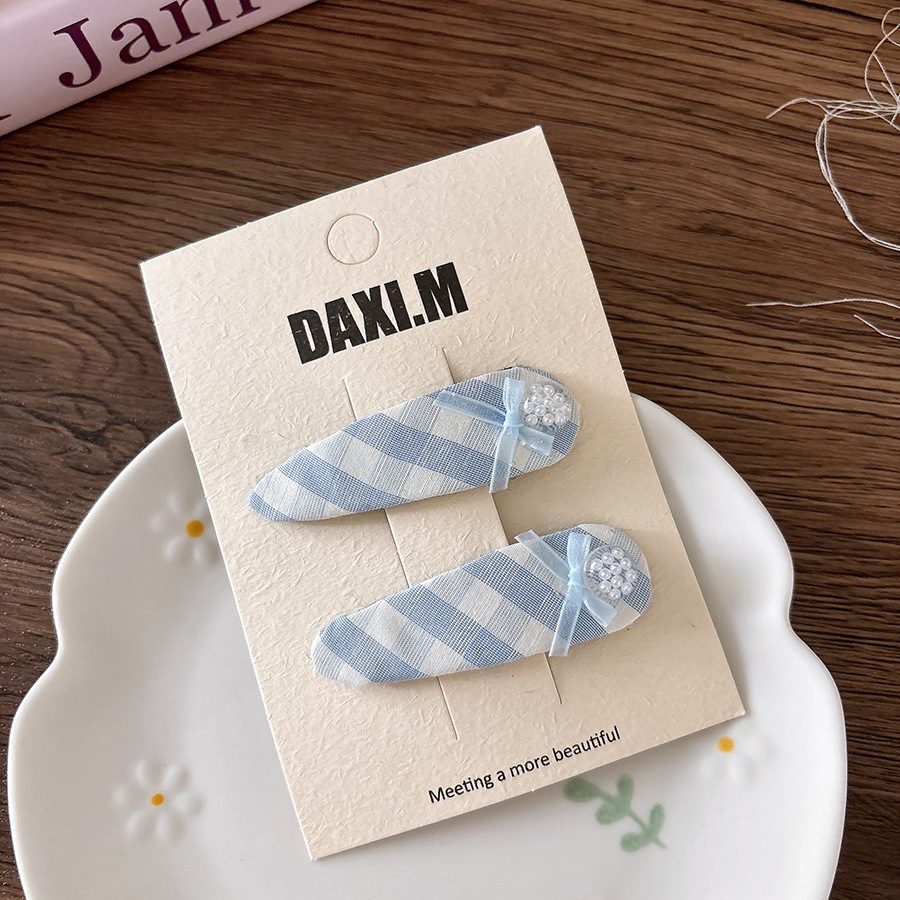 新款布艺蓝色系格子蝴蝶结女孩侧边压夹发卡少女百搭刘海bb夹发圈