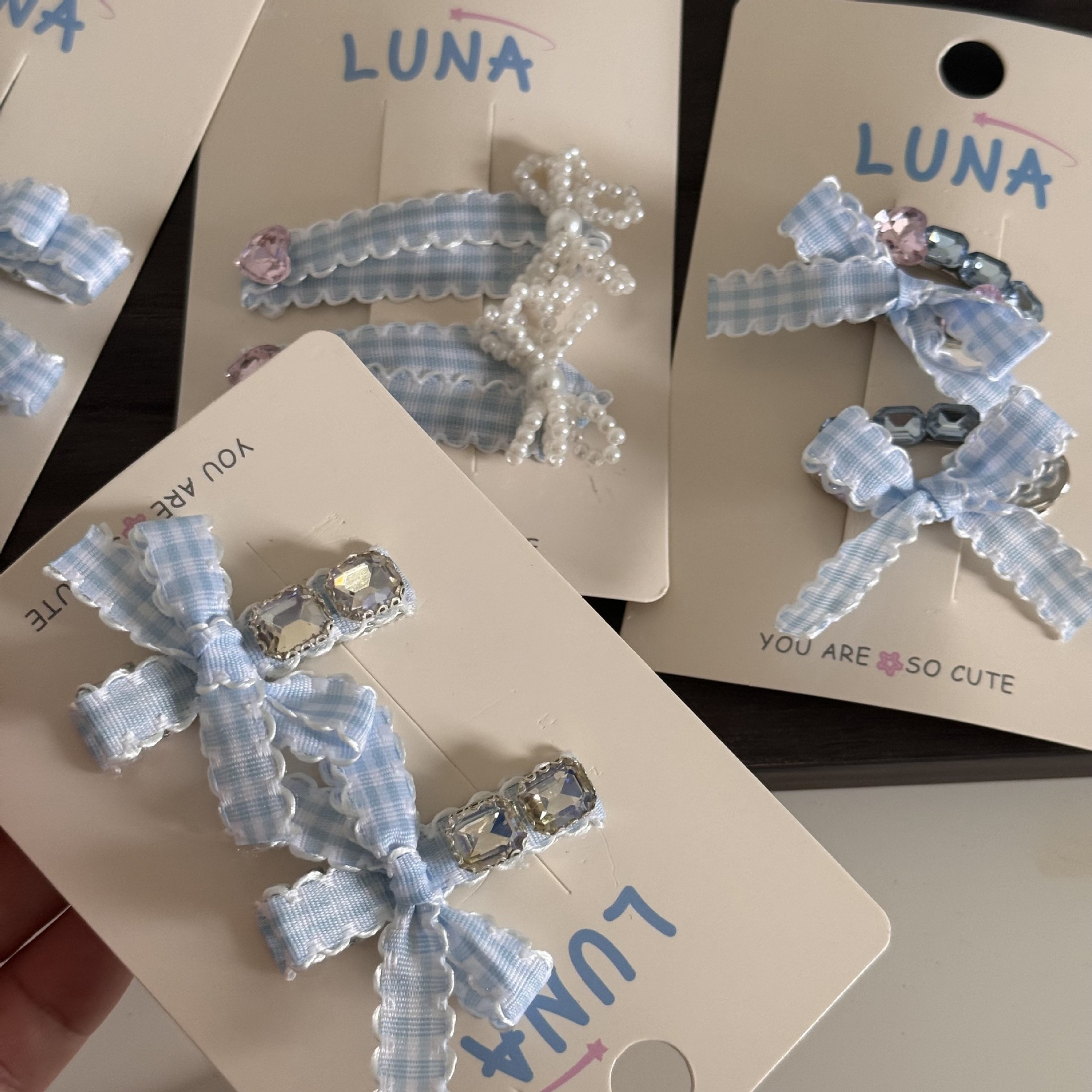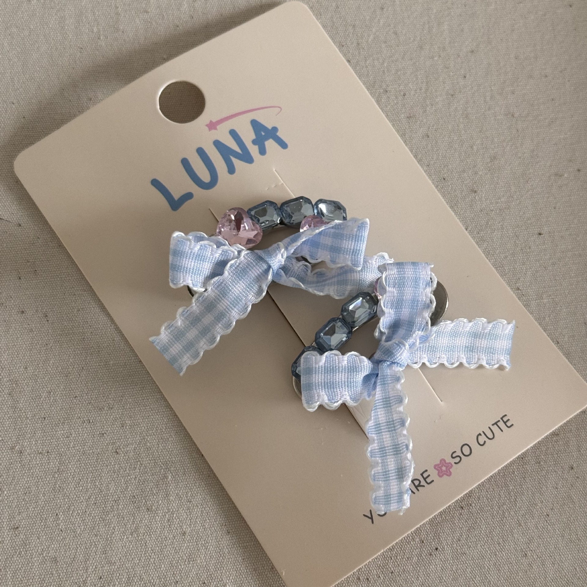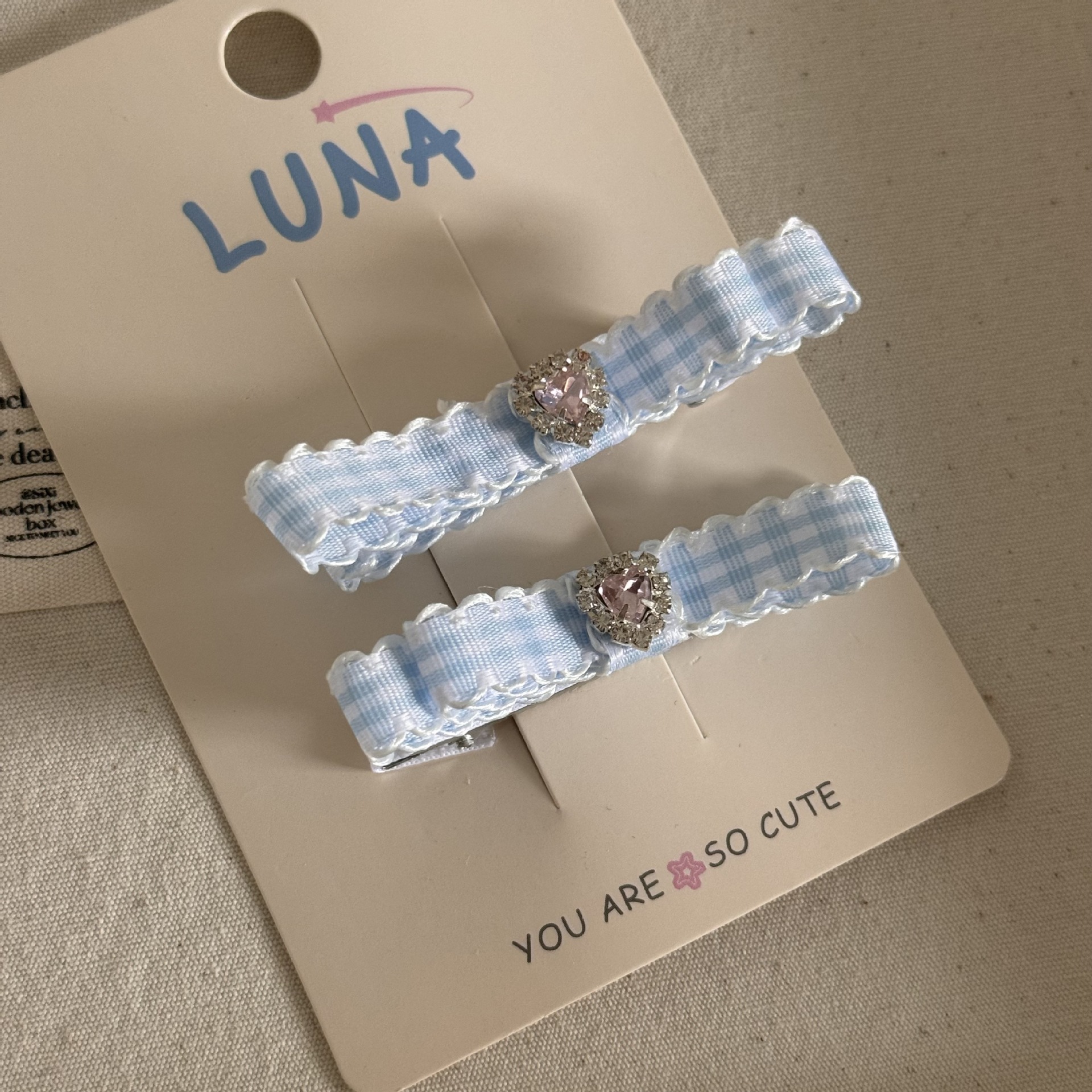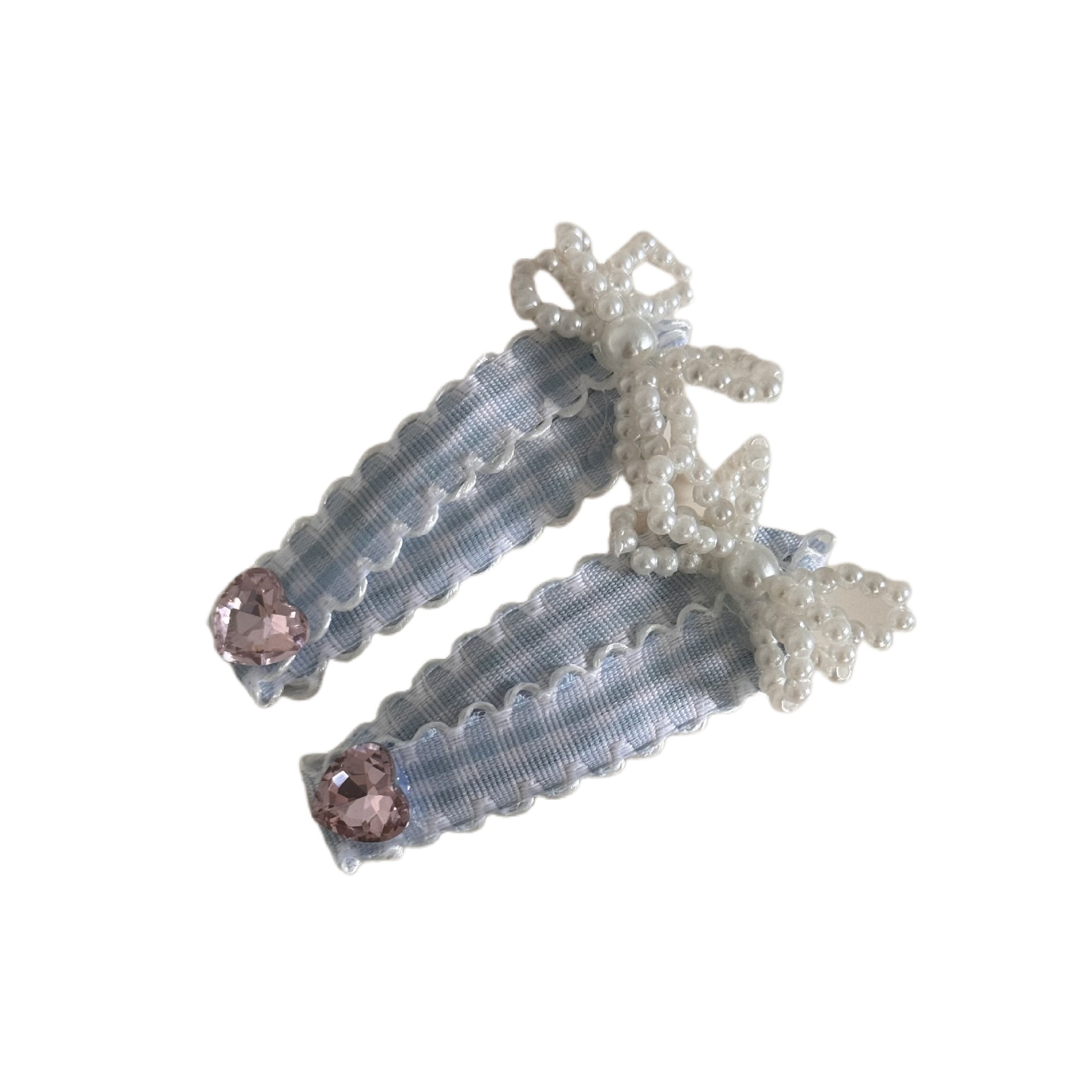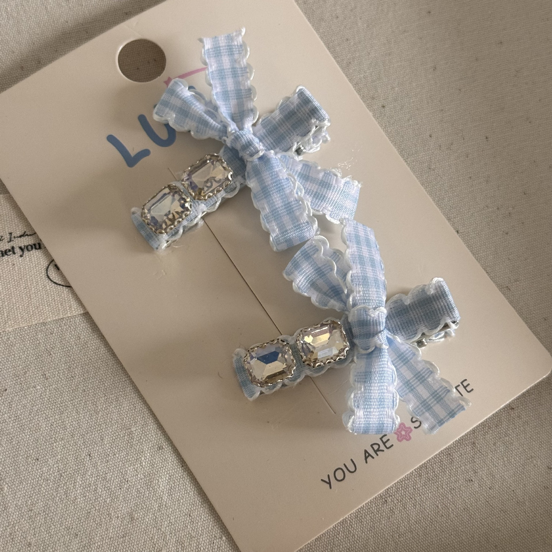 蓝色小清新格纹水钻蝴蝶结发夹甜美可爱对夹百搭刘海对夹发饰新款