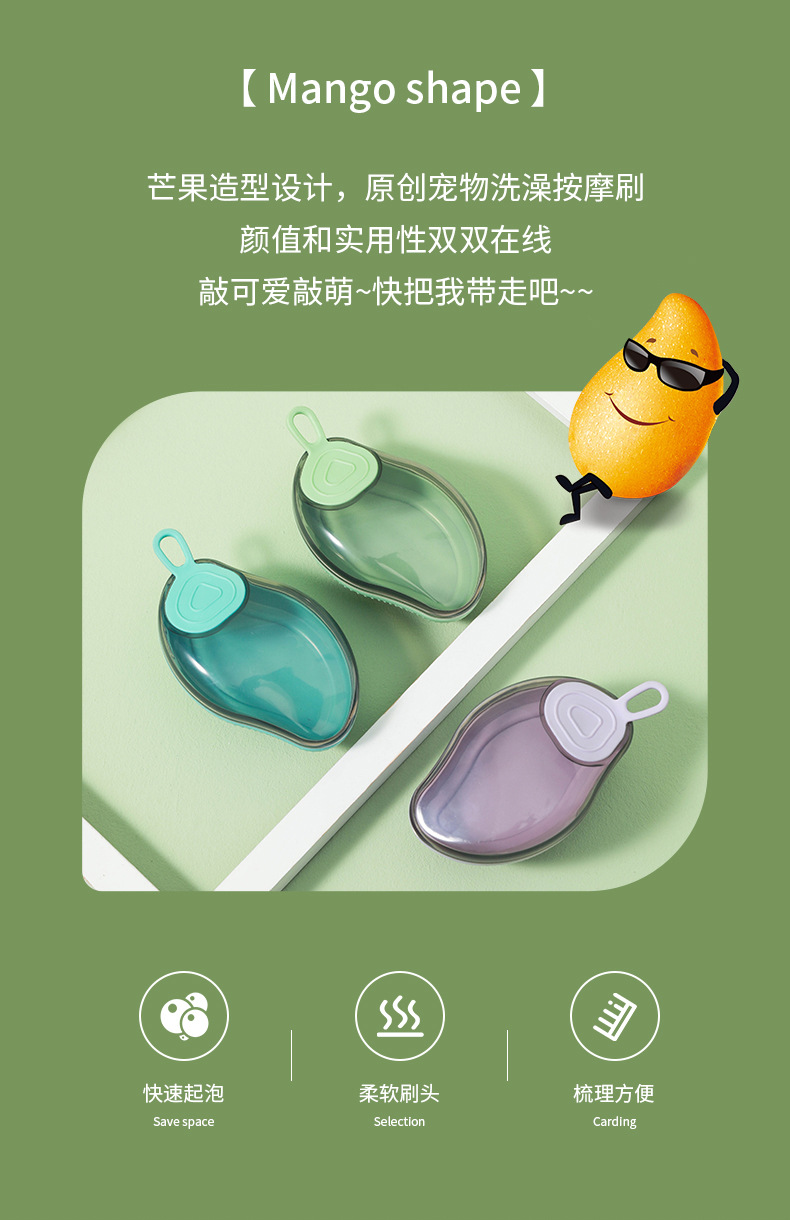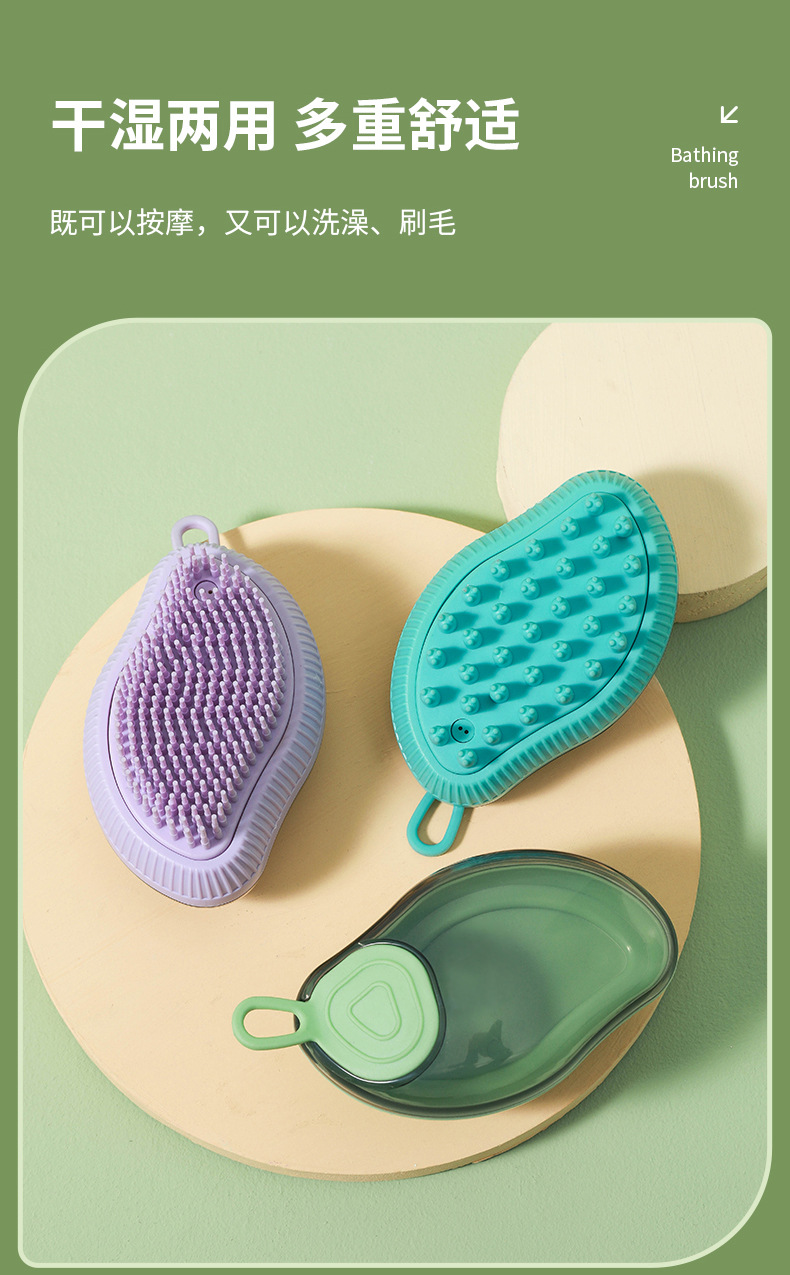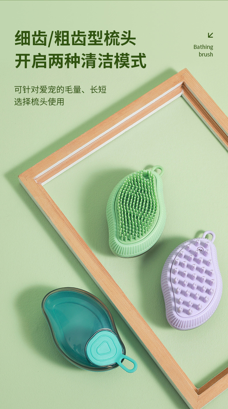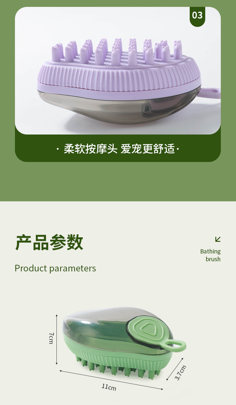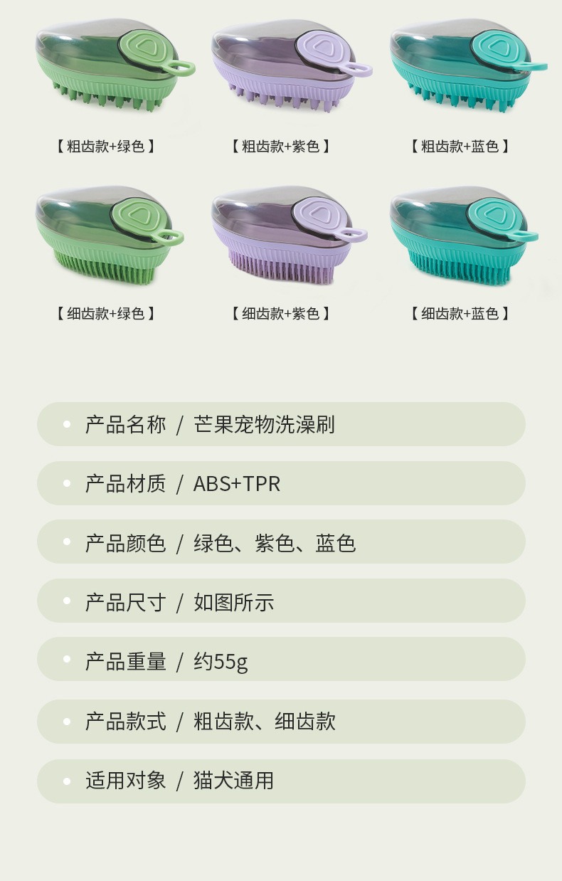 【产品名称】宠物洗澡刷 【产品尺寸】11cm*7cm*3.7 【彩盒尺寸】5*7*11cm 【净重/毛重】58g/70g 【装箱规格】52*45.5*53cm 【装箱数量】280pcs 【装箱重量】21kg(抛货25kg单抛90g)