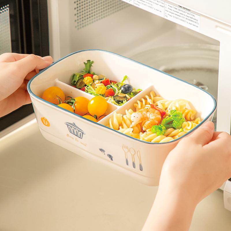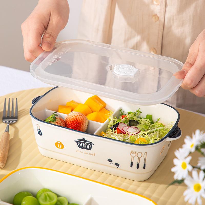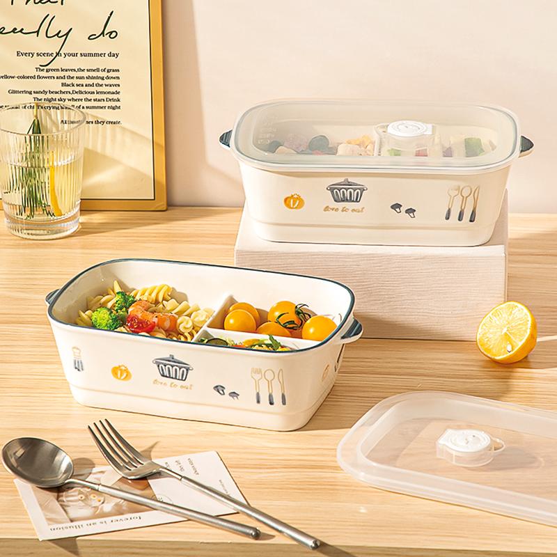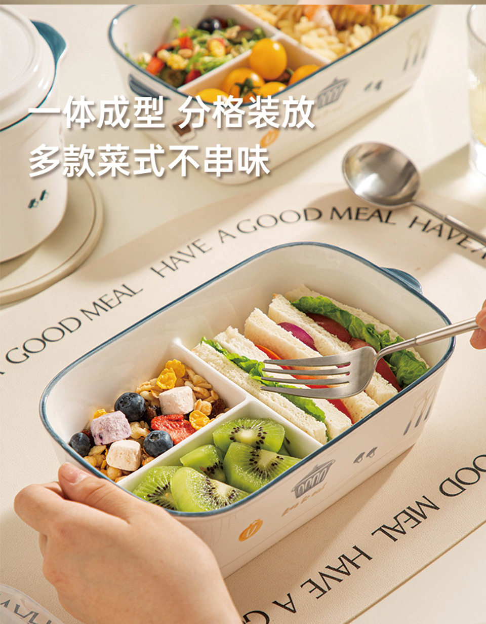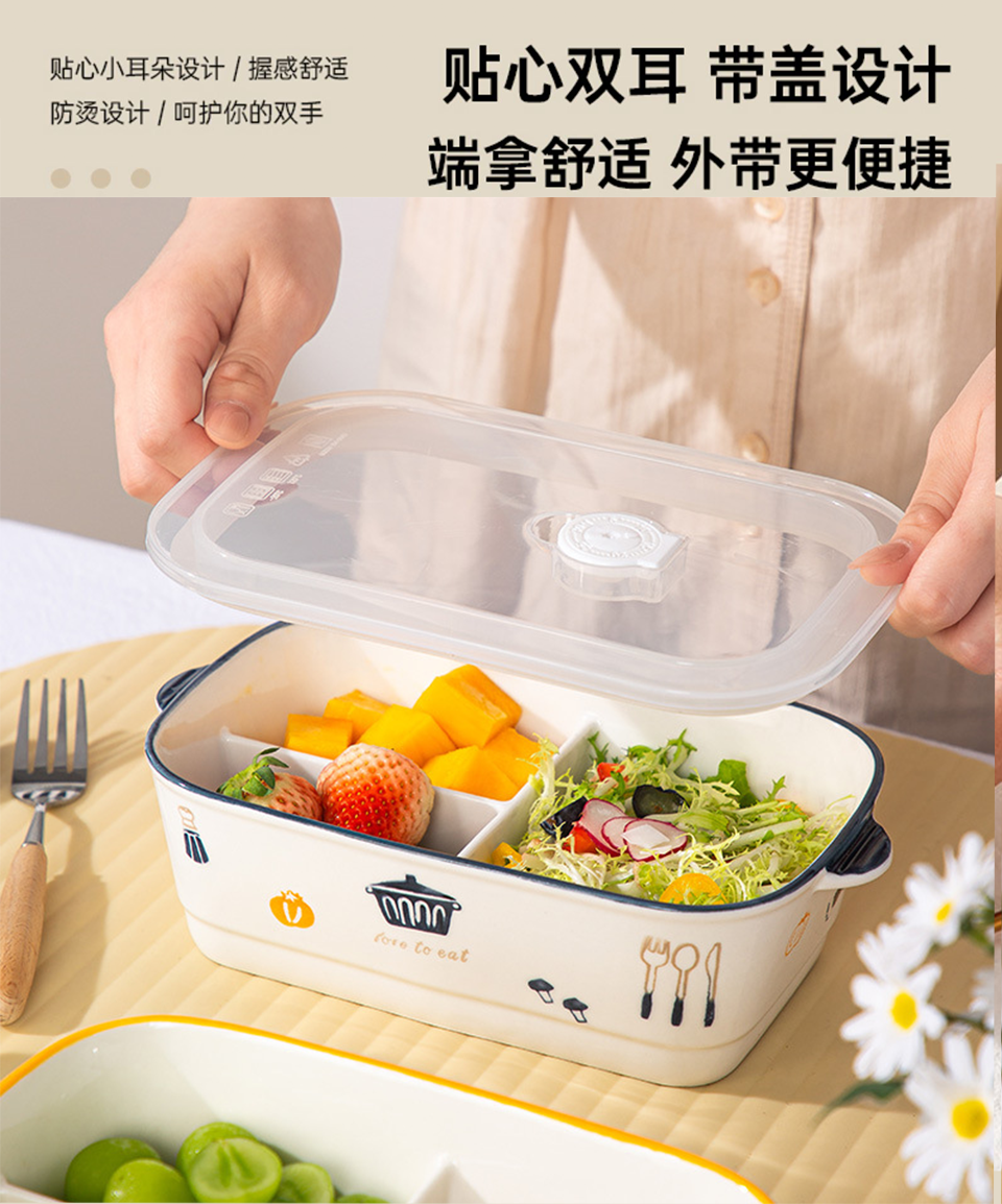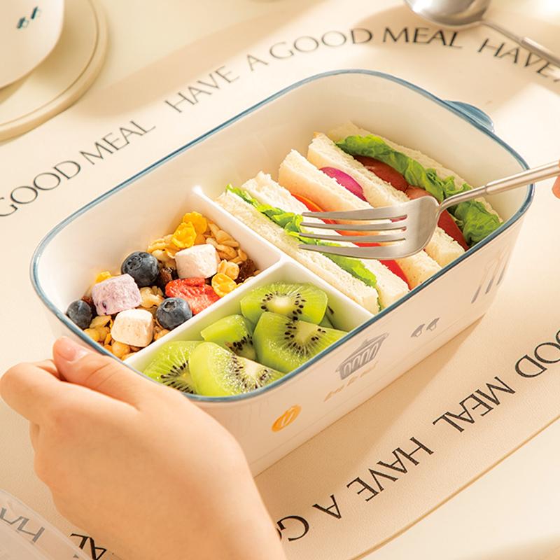陶瓷风格盘陶瓷分格饭盒新款儿童分餐便当盒三格上班族轻食带饭