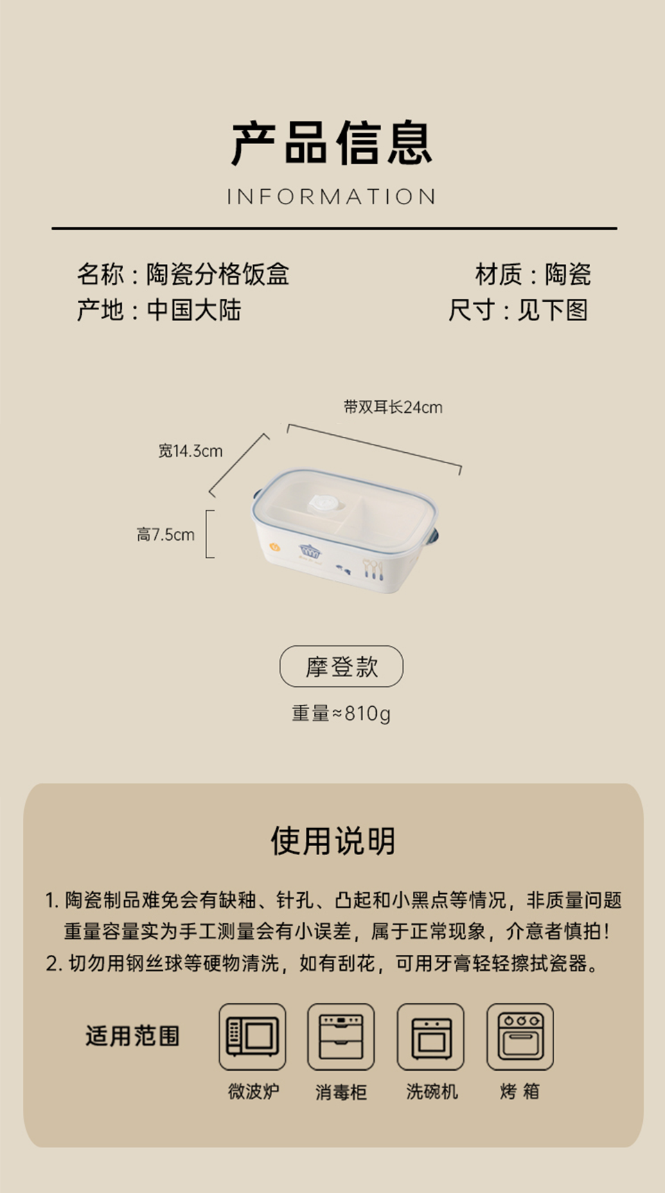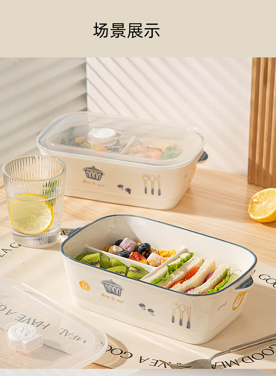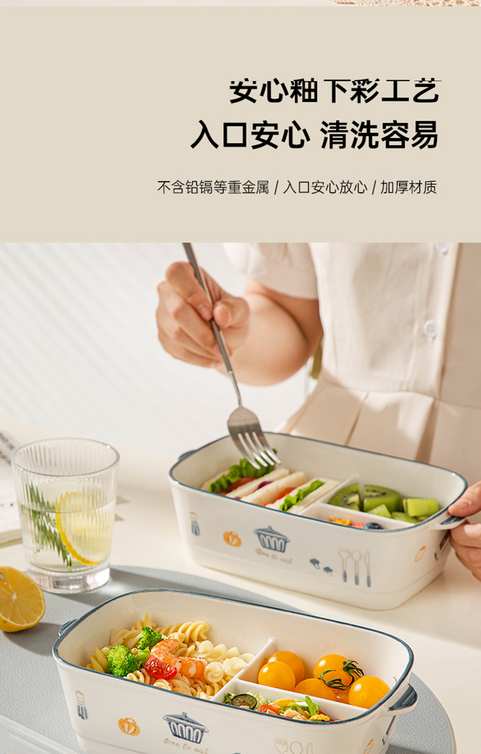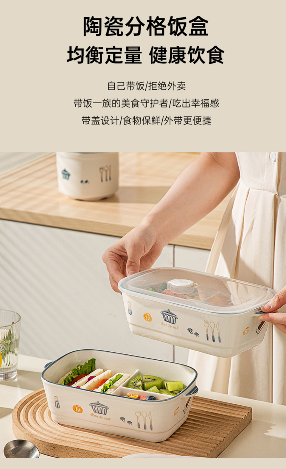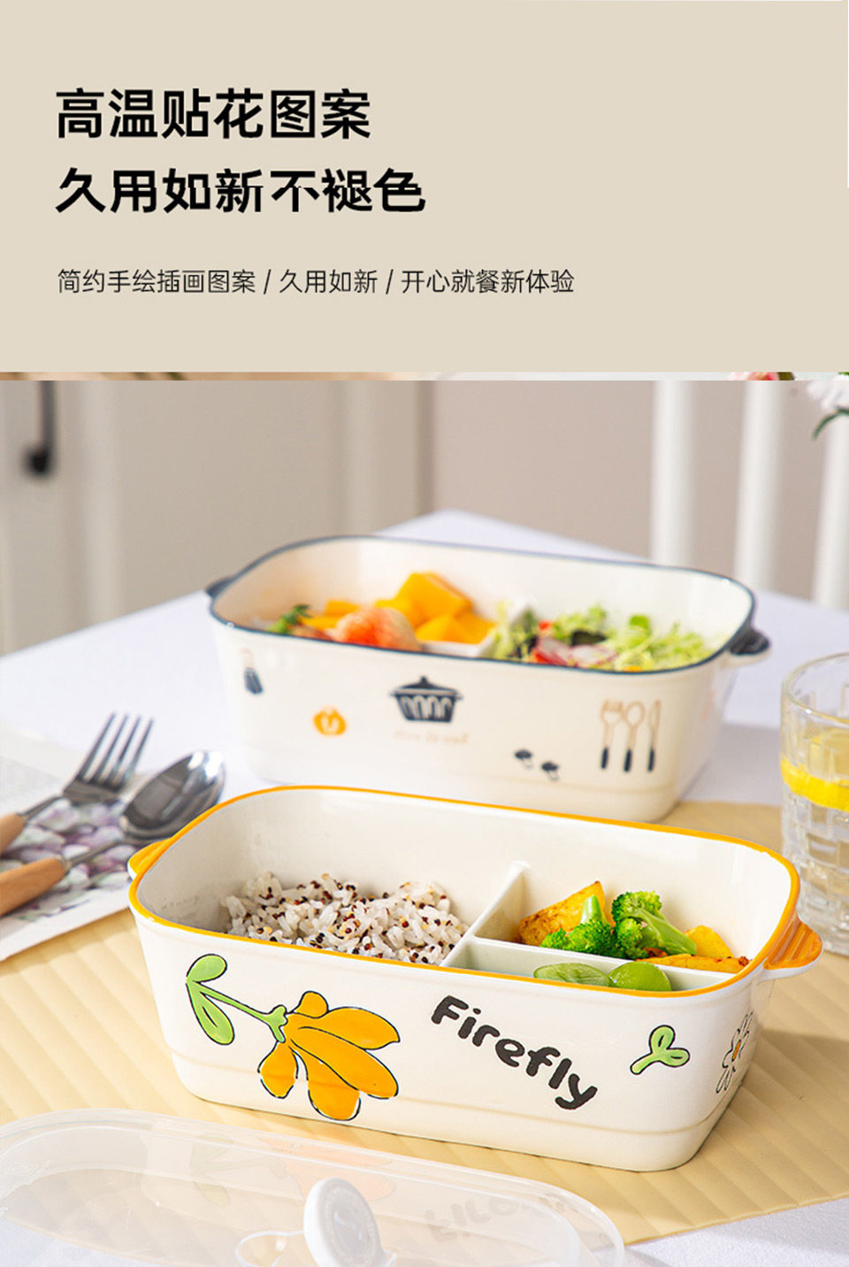 陶瓷风格盘陶瓷分格饭盒新款儿童分餐便当盒三格上班族轻食带饭