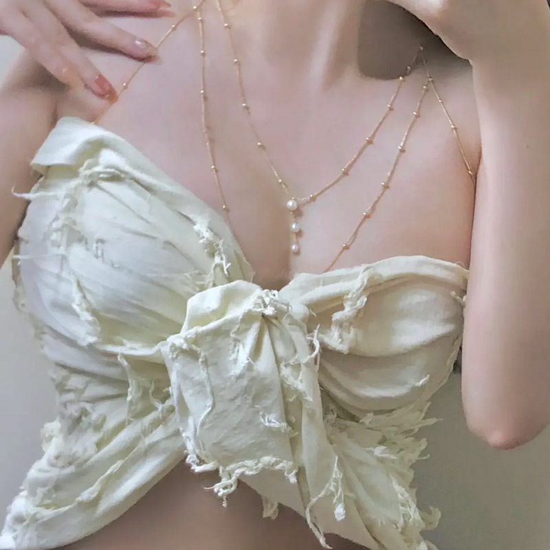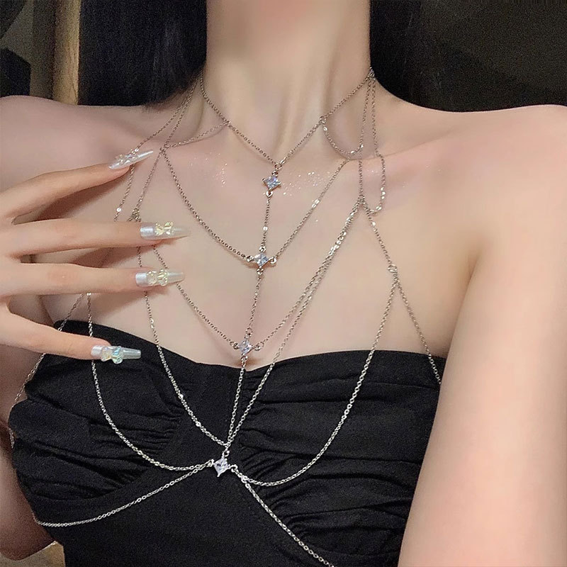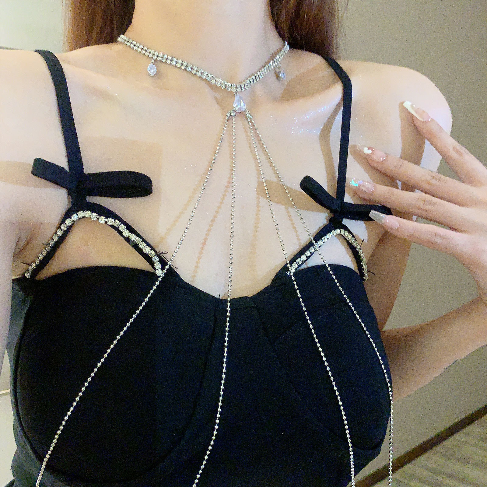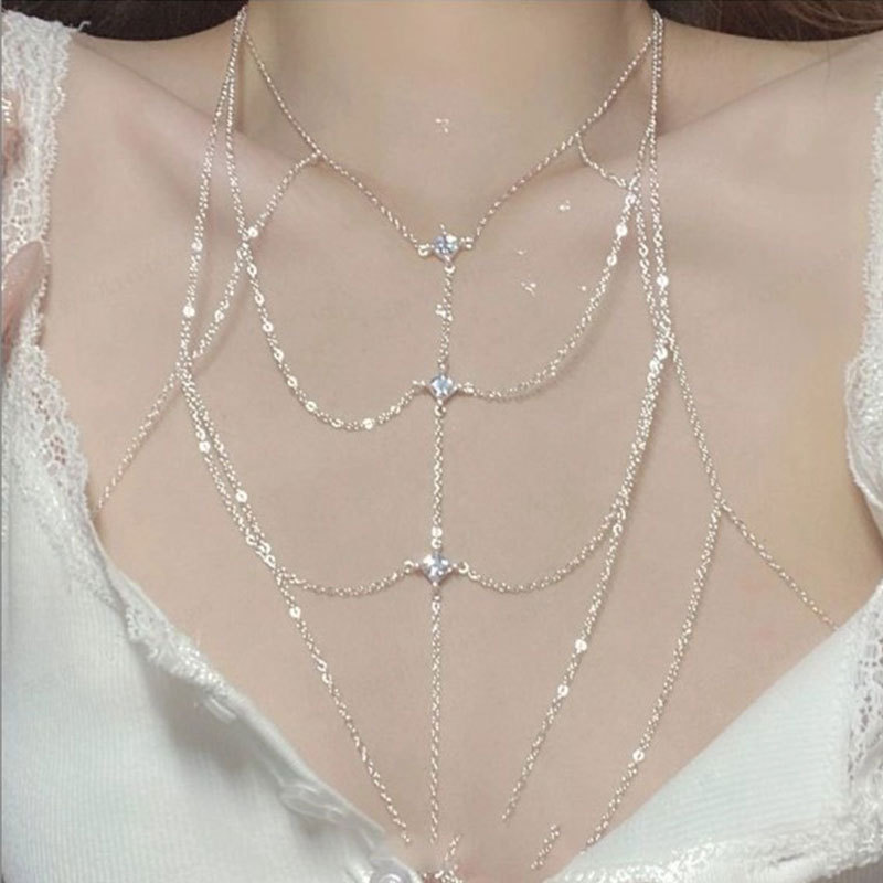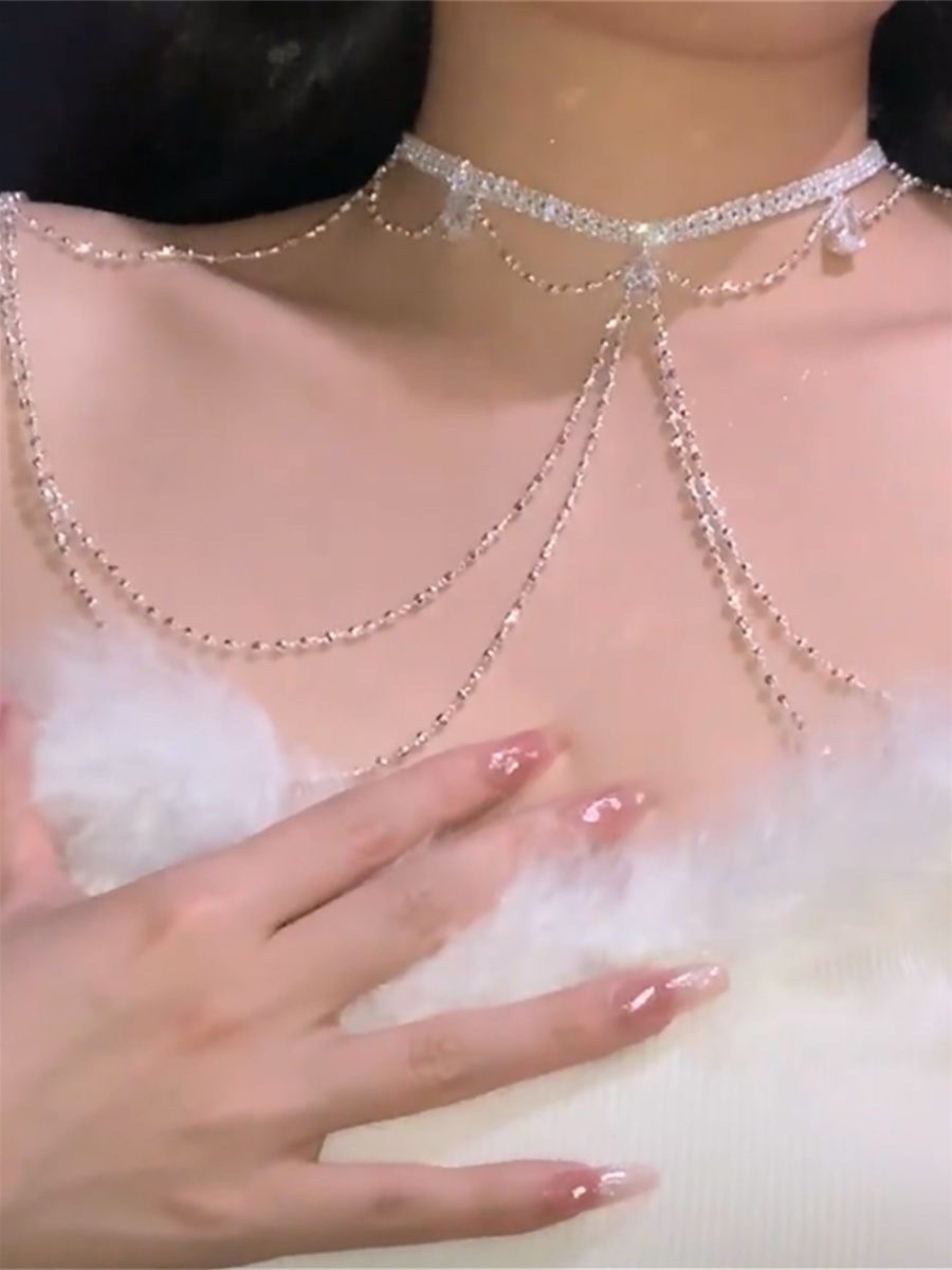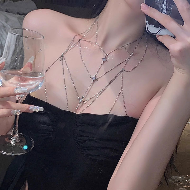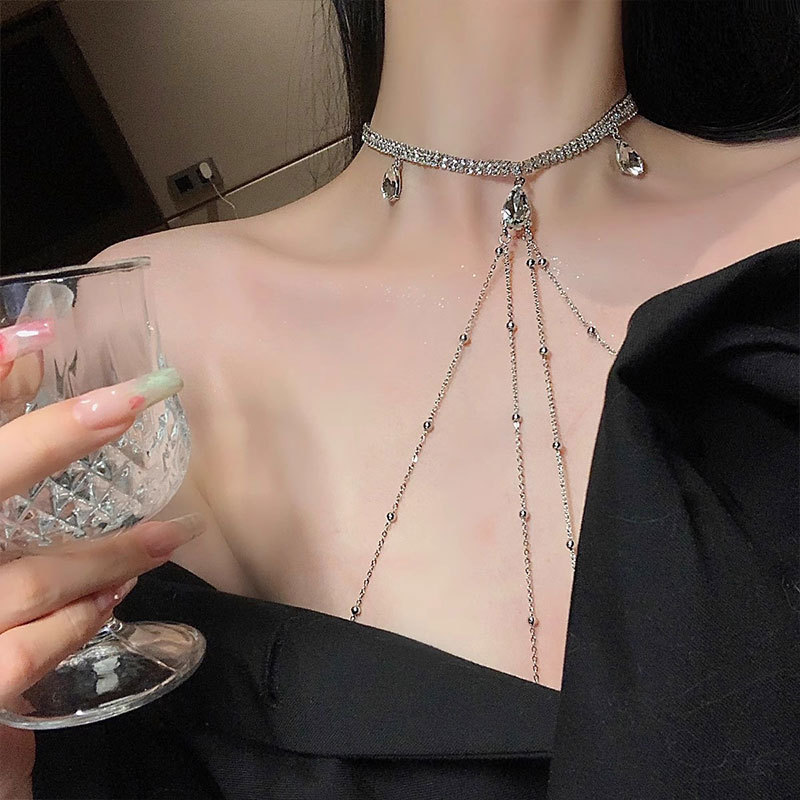 小香风镶钻挂脖长款流苏身体链项链水钻链条全身腰链配饰性感胸链