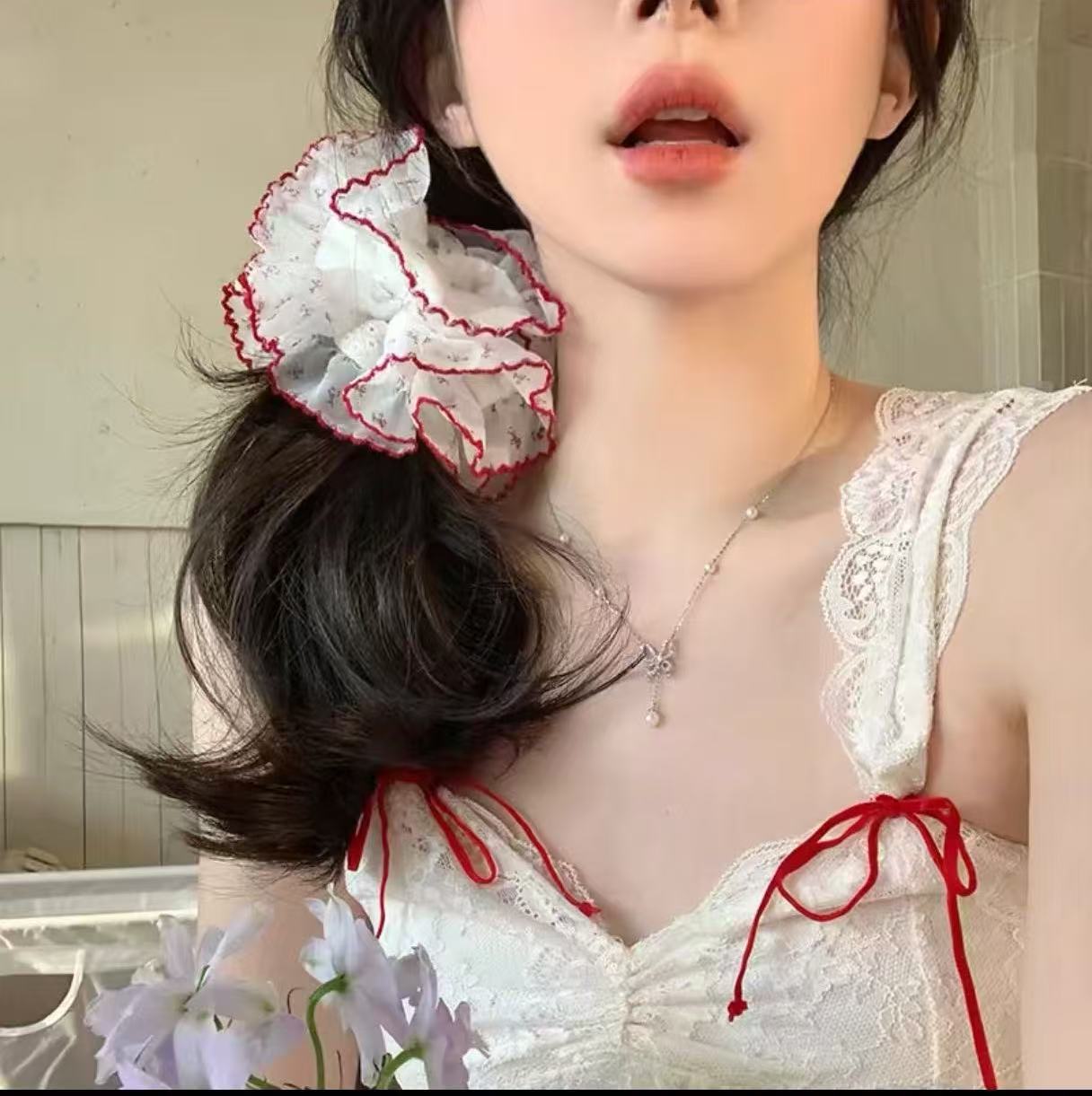 杨超越同款红色花边蕾丝发圈法式复古温柔发饰少女镂空超大号发绳