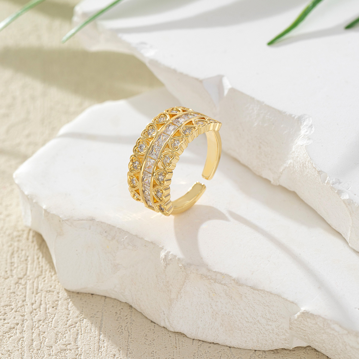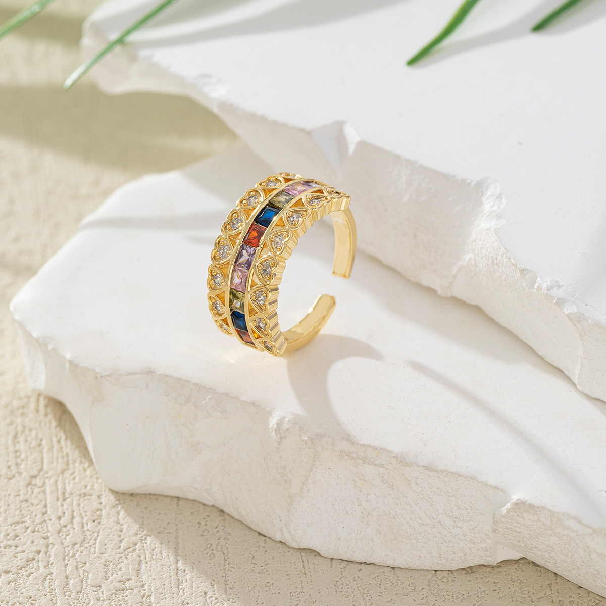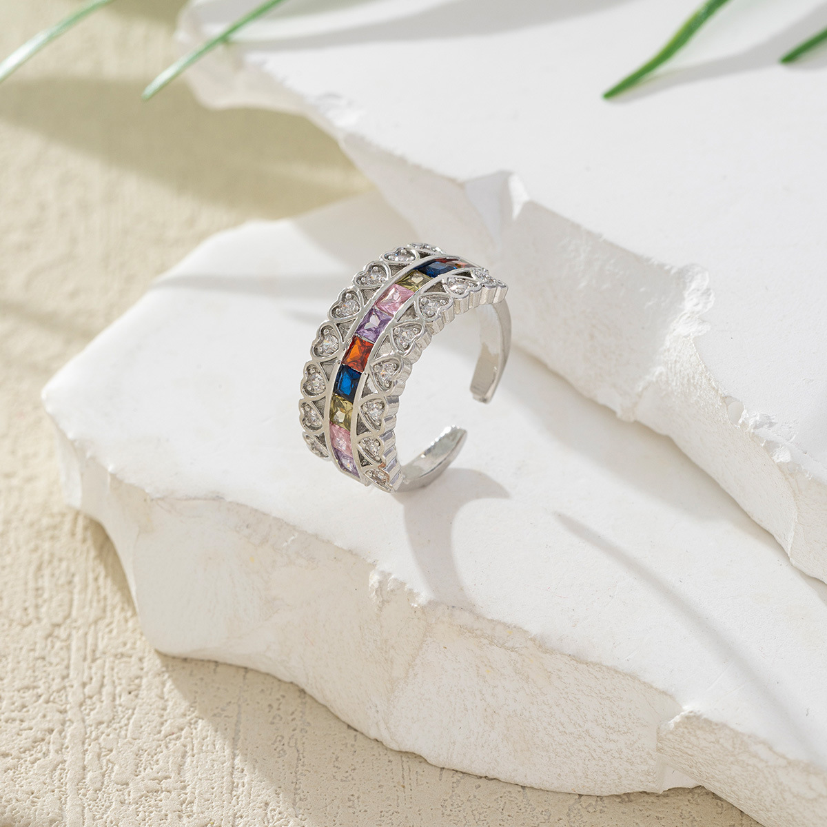 亚马逊热卖锆石戒指 18k金电镀爱心开口欧美小众彩色排钻高级指环