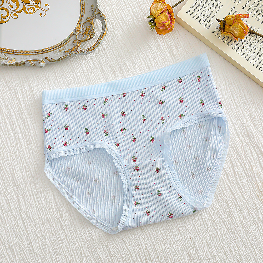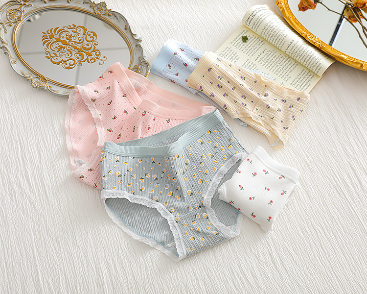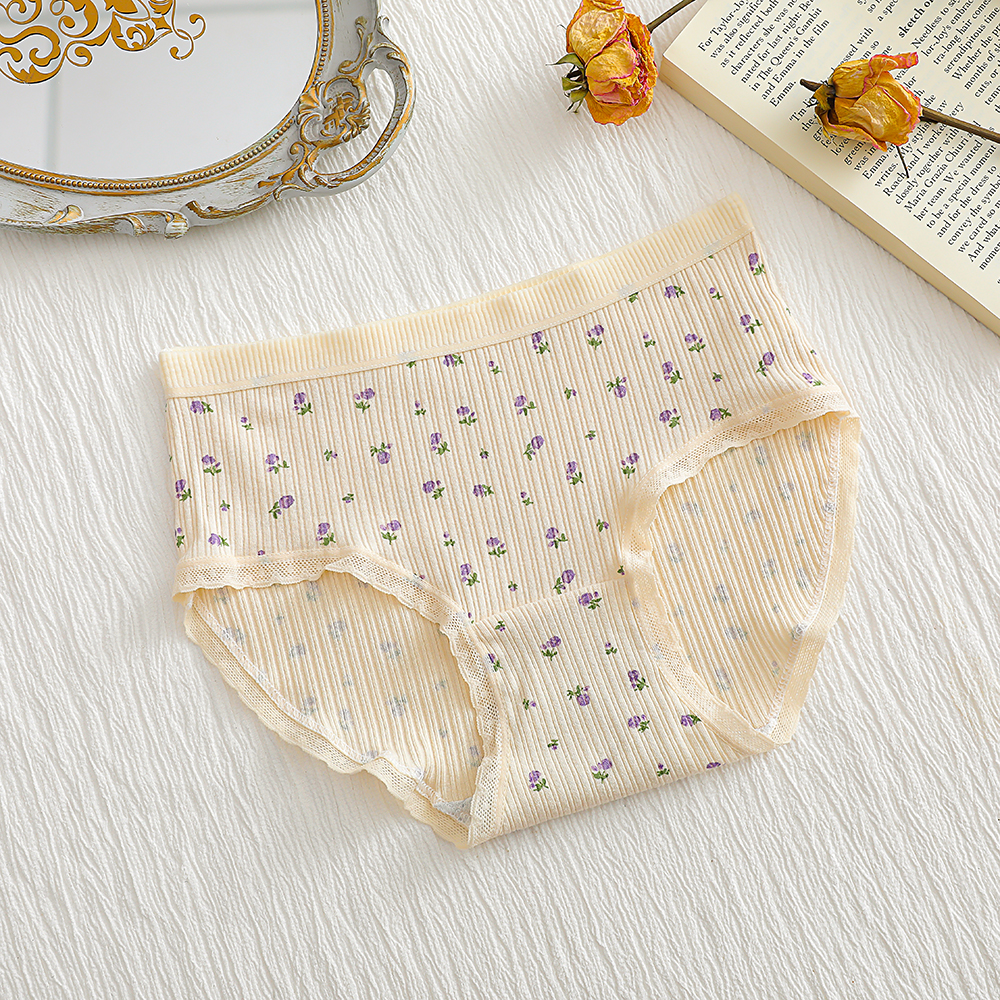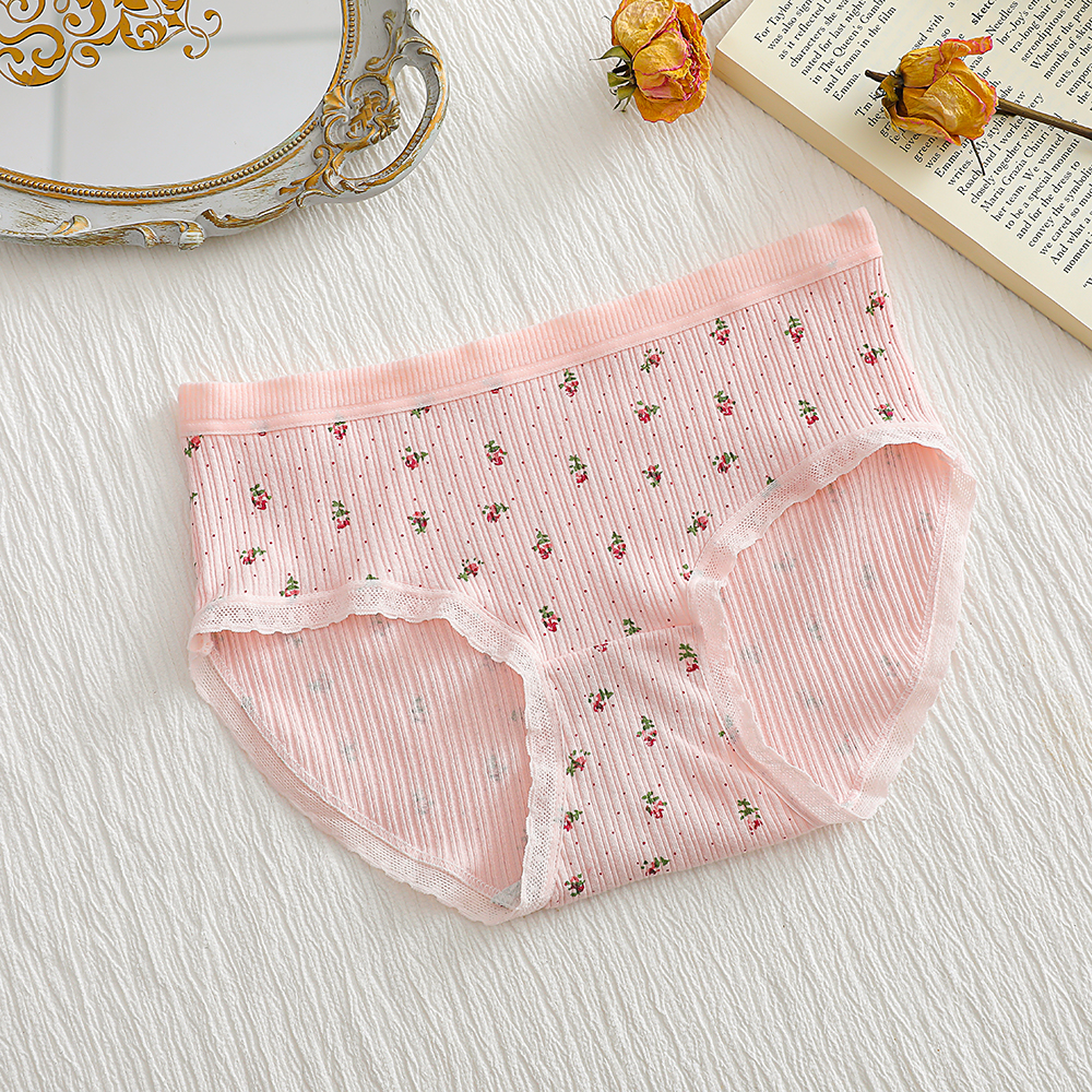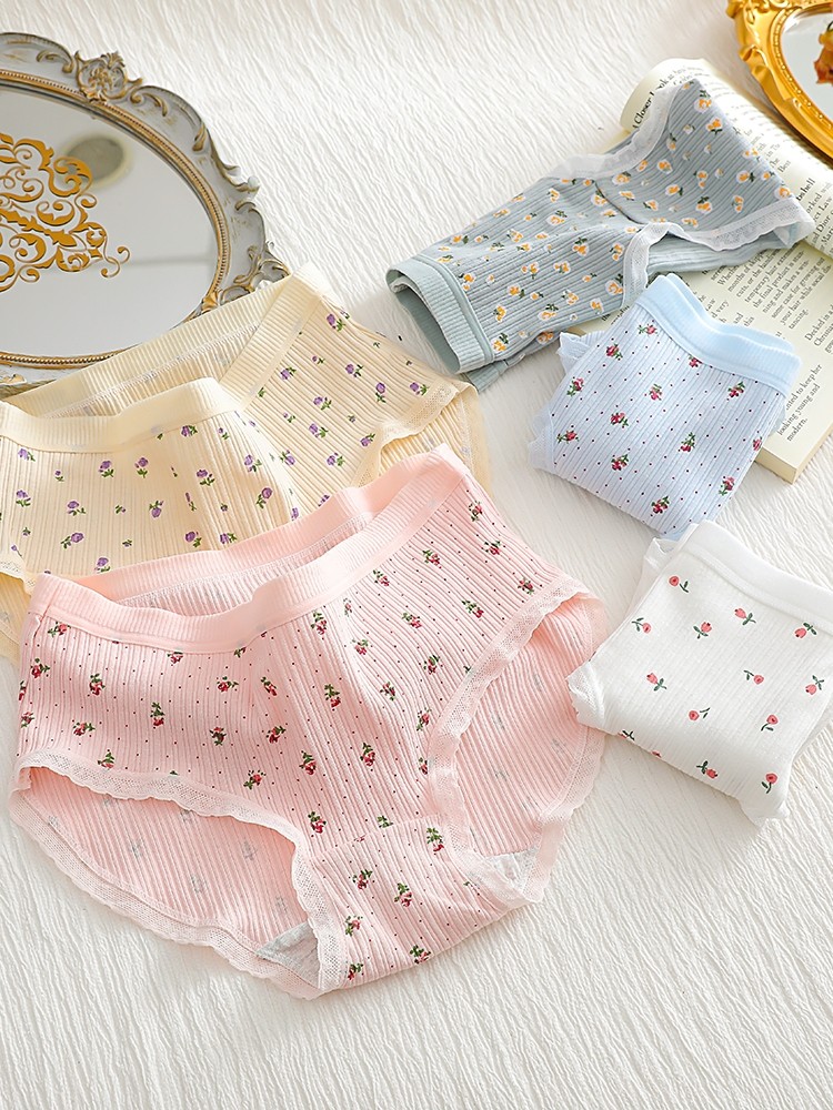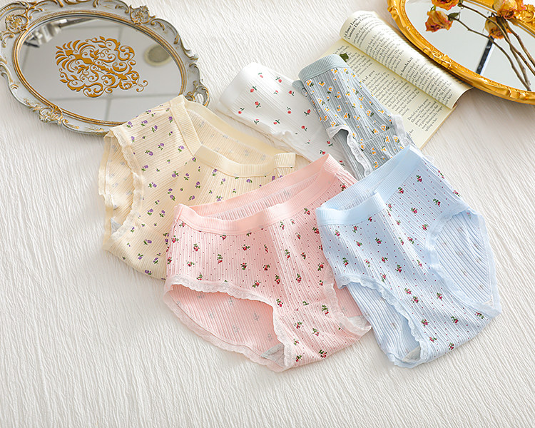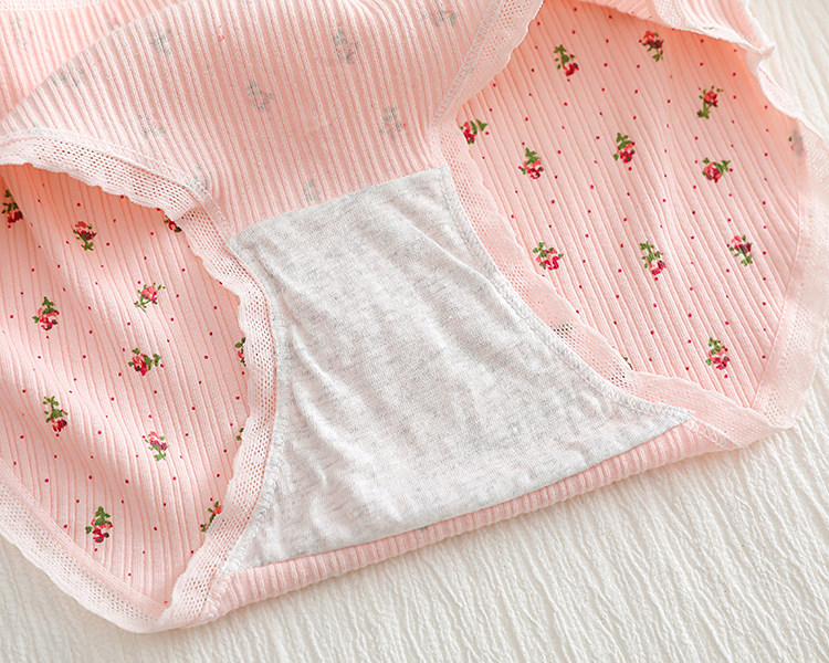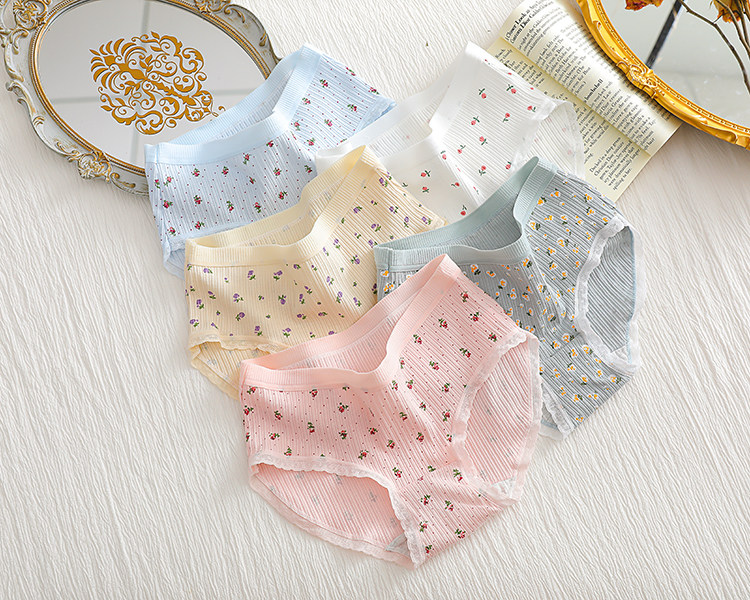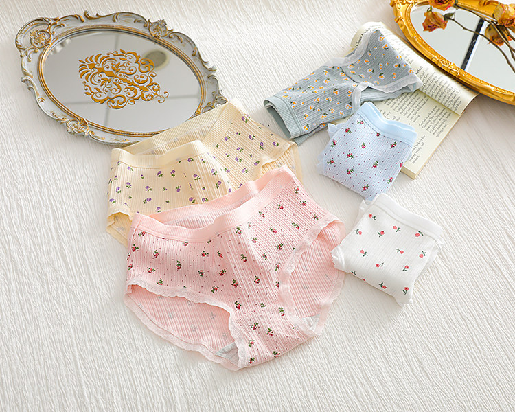 田园小碎花中腰包臀透气纯棉裆内裤女螺纹清新浅色系少女三角裤