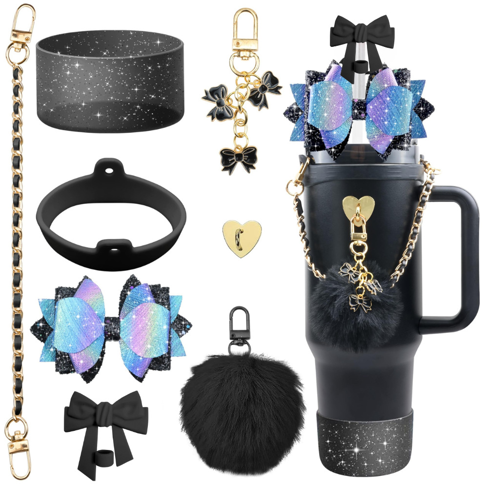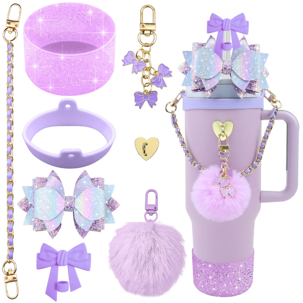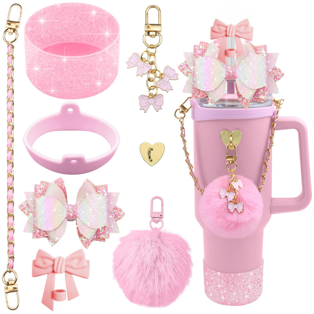 跨境斯坦利杯配件闪粉蝴蝶结吸管装饰毛球挂件手提绳蝴蝶结吸管盖
