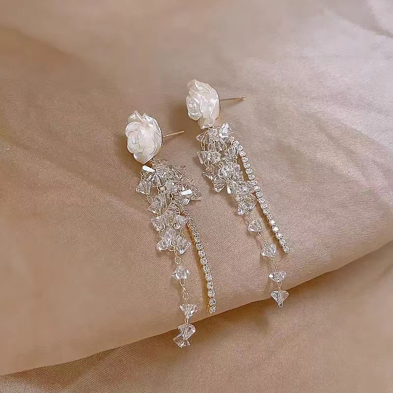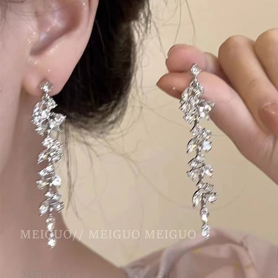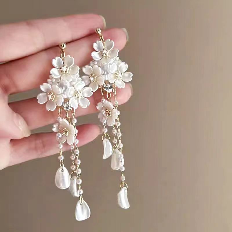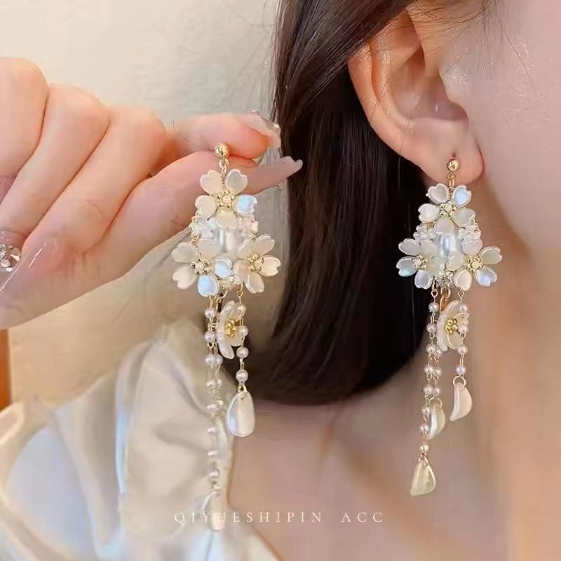 s925银针方圆脸珍珠长款流苏耳饰女耳钉法式优雅轻奢小众流苏耳环