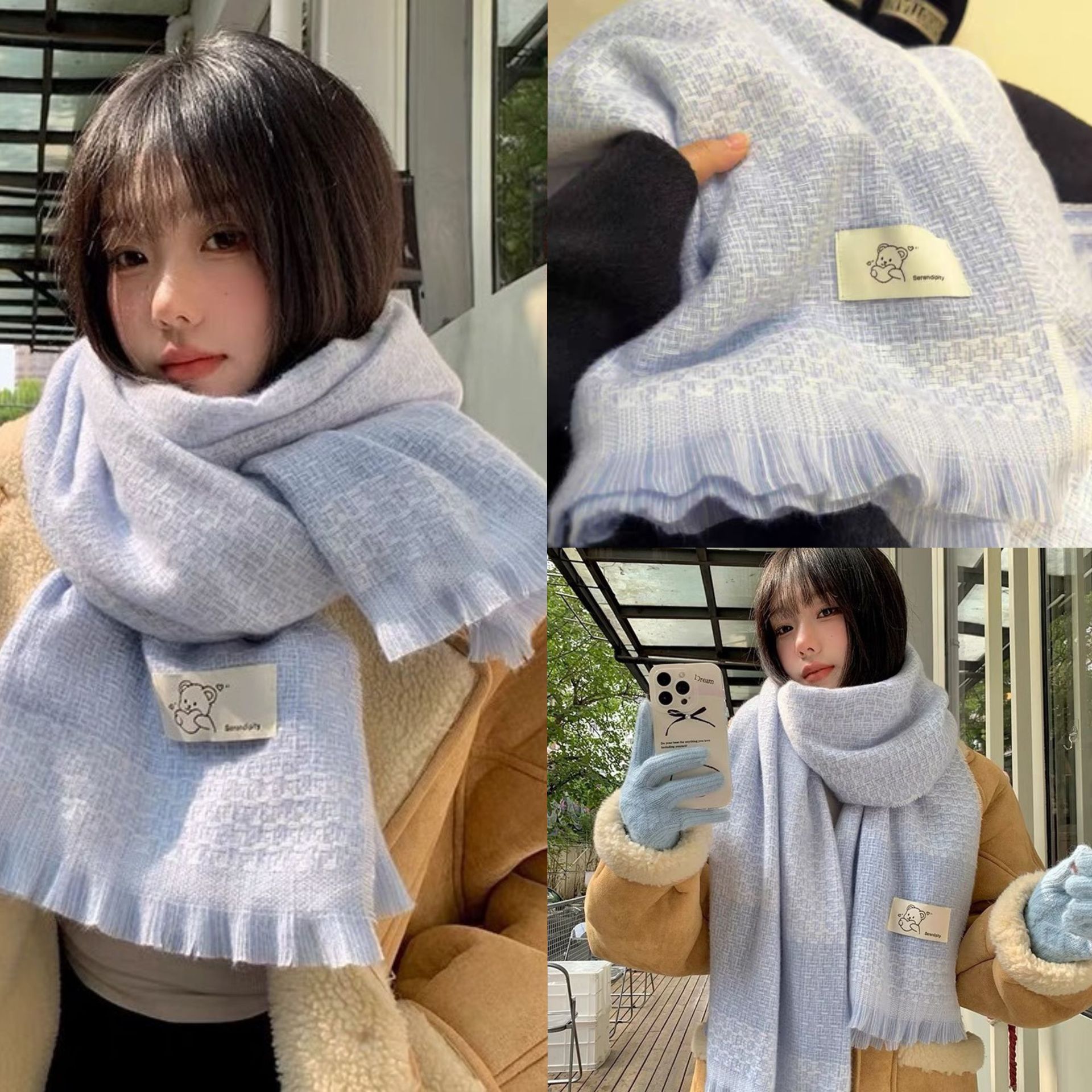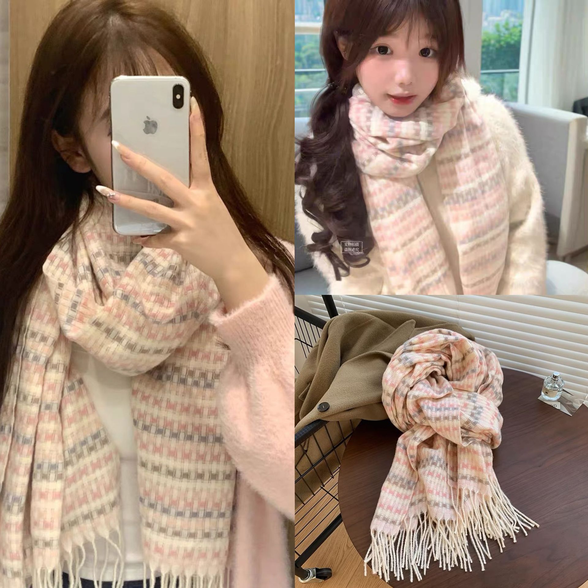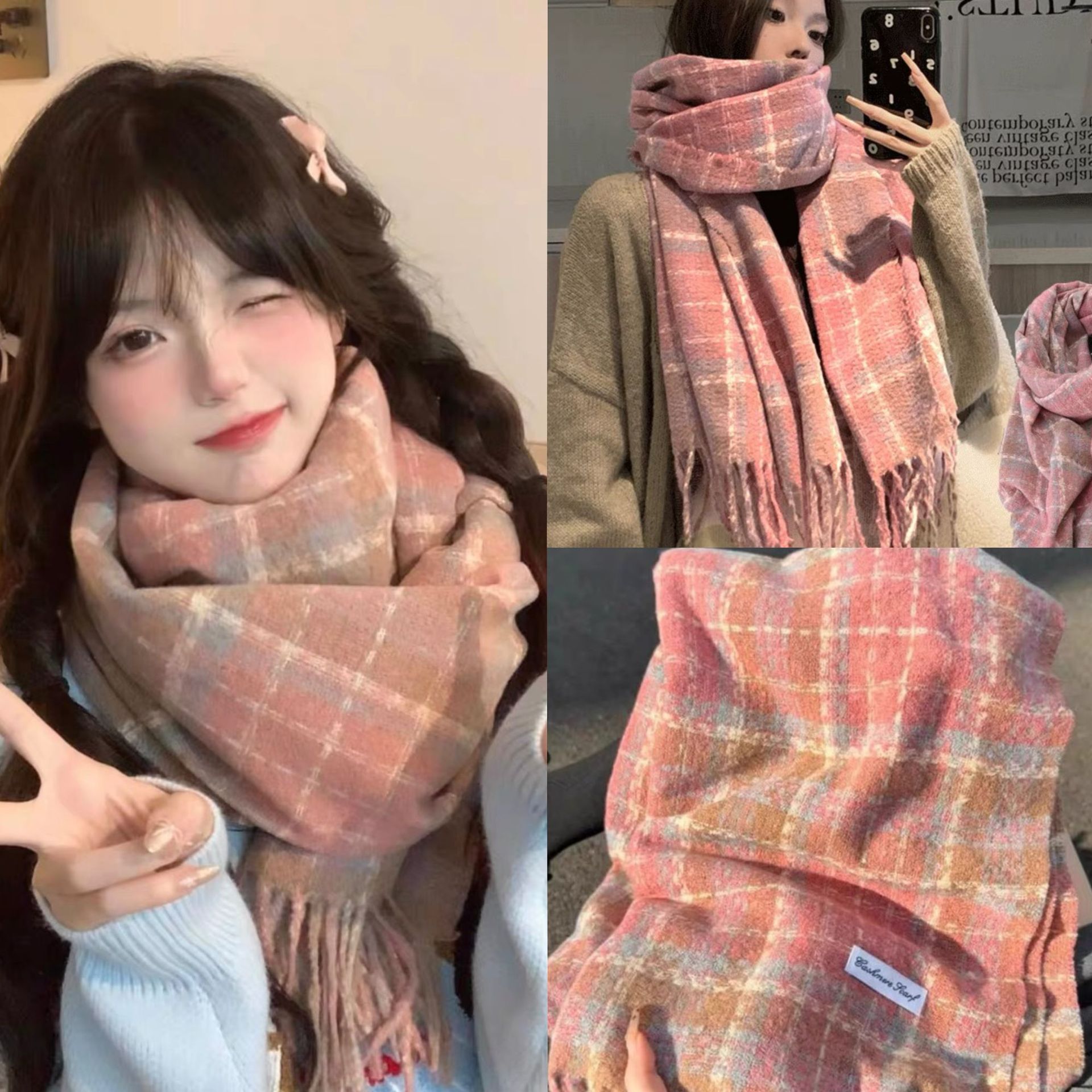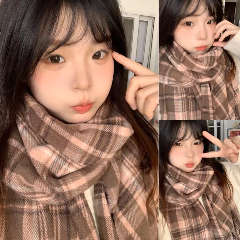 2024格子围巾女秋冬仿羊绒披肩韩系保暖围脖学生百搭清新少女可爱
