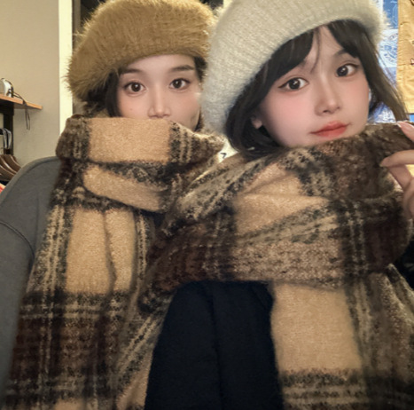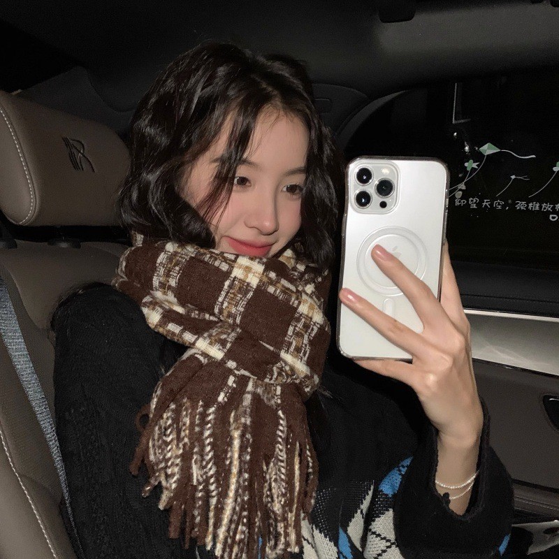 新款秋冬千鸟格围巾女韩版加厚保暖百搭格子围脖针织流苏学生围巾
