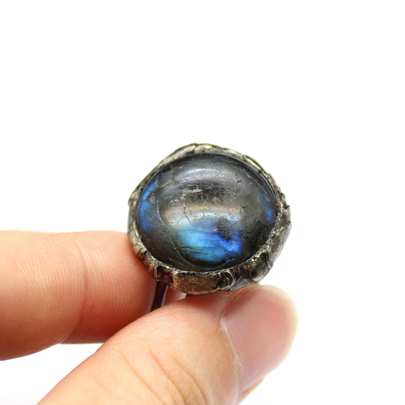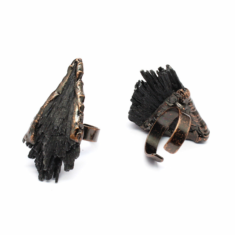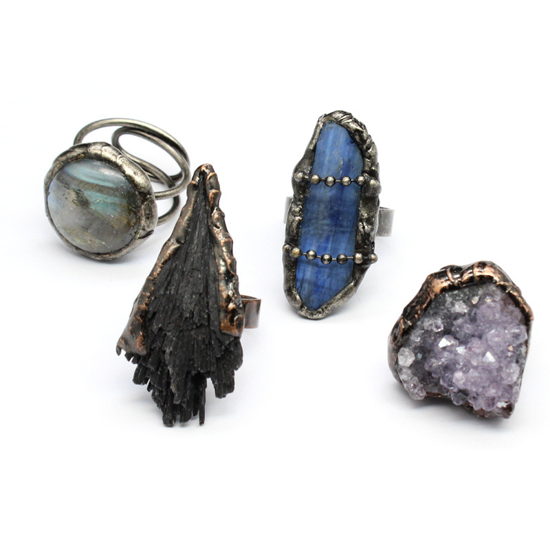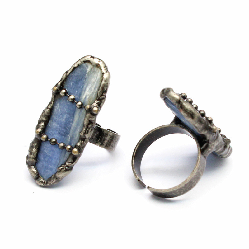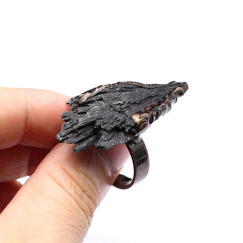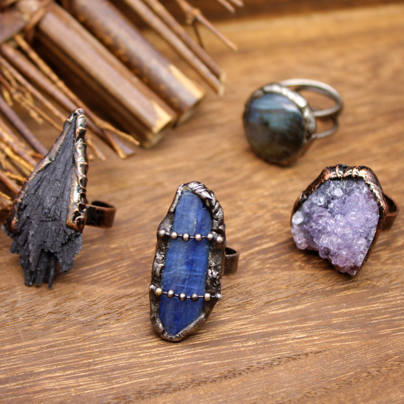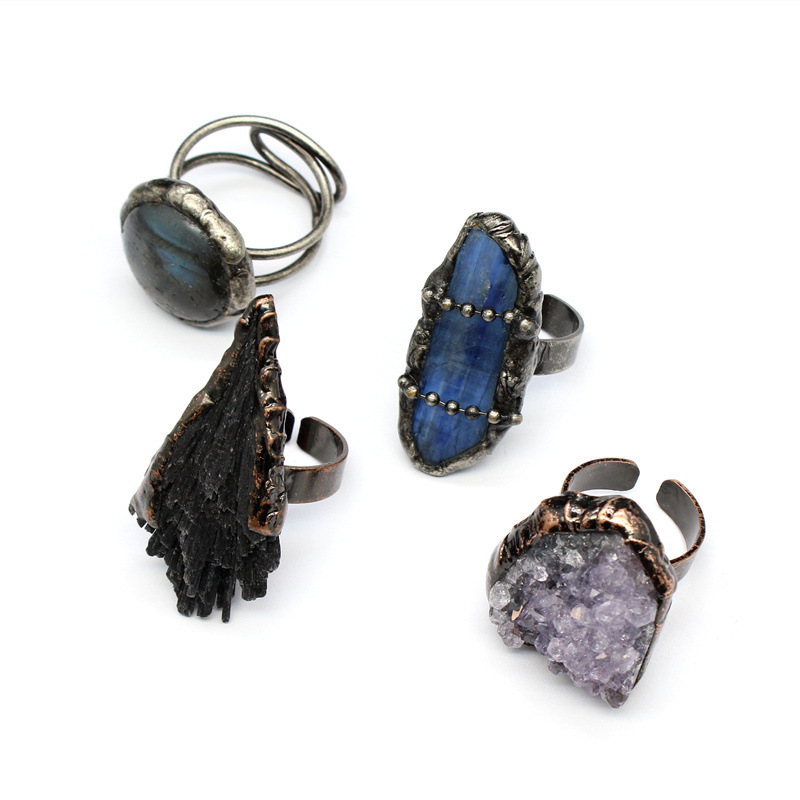 跨境水晶饰品批发做旧天然石黑碧玺原石戒指蓝晶不定形创意手饰
