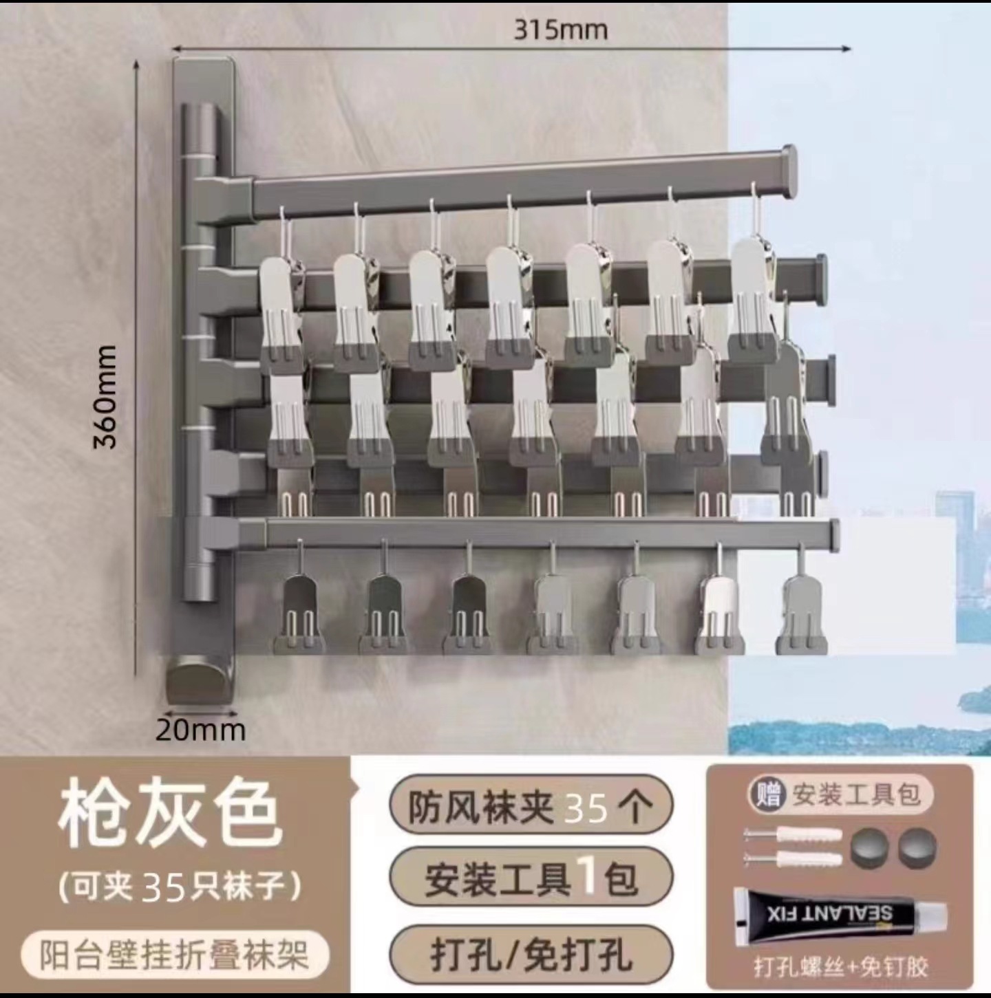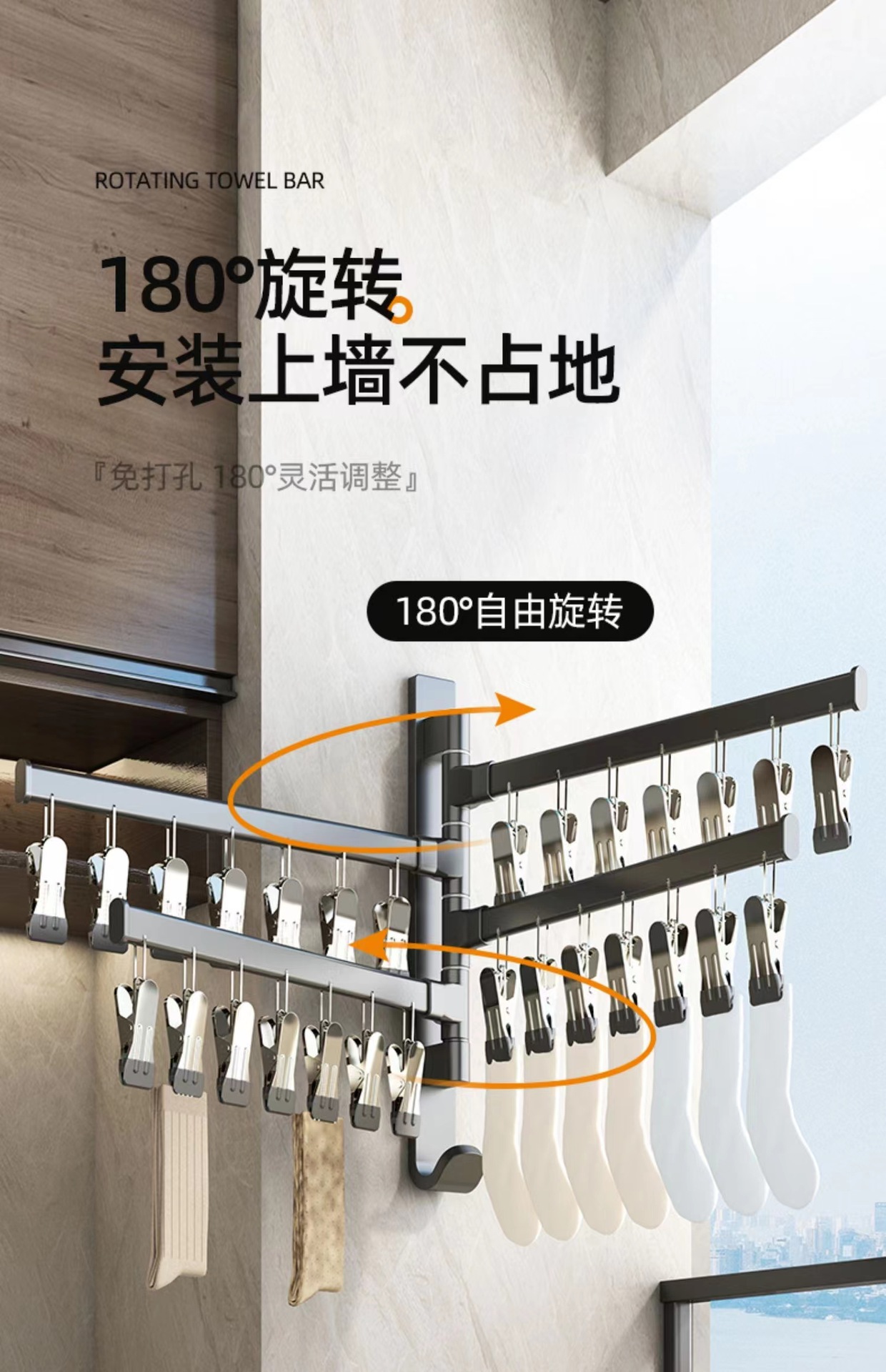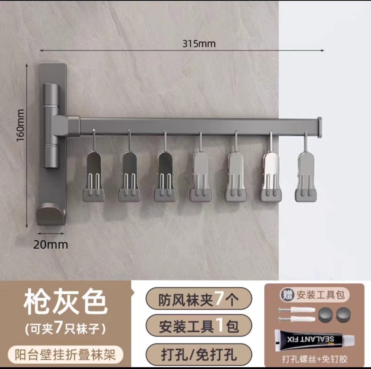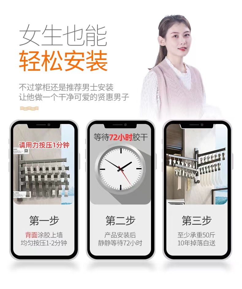 (1)、此款为壁挂折叠袜子架,可以打孔/免打孔双用安装。
