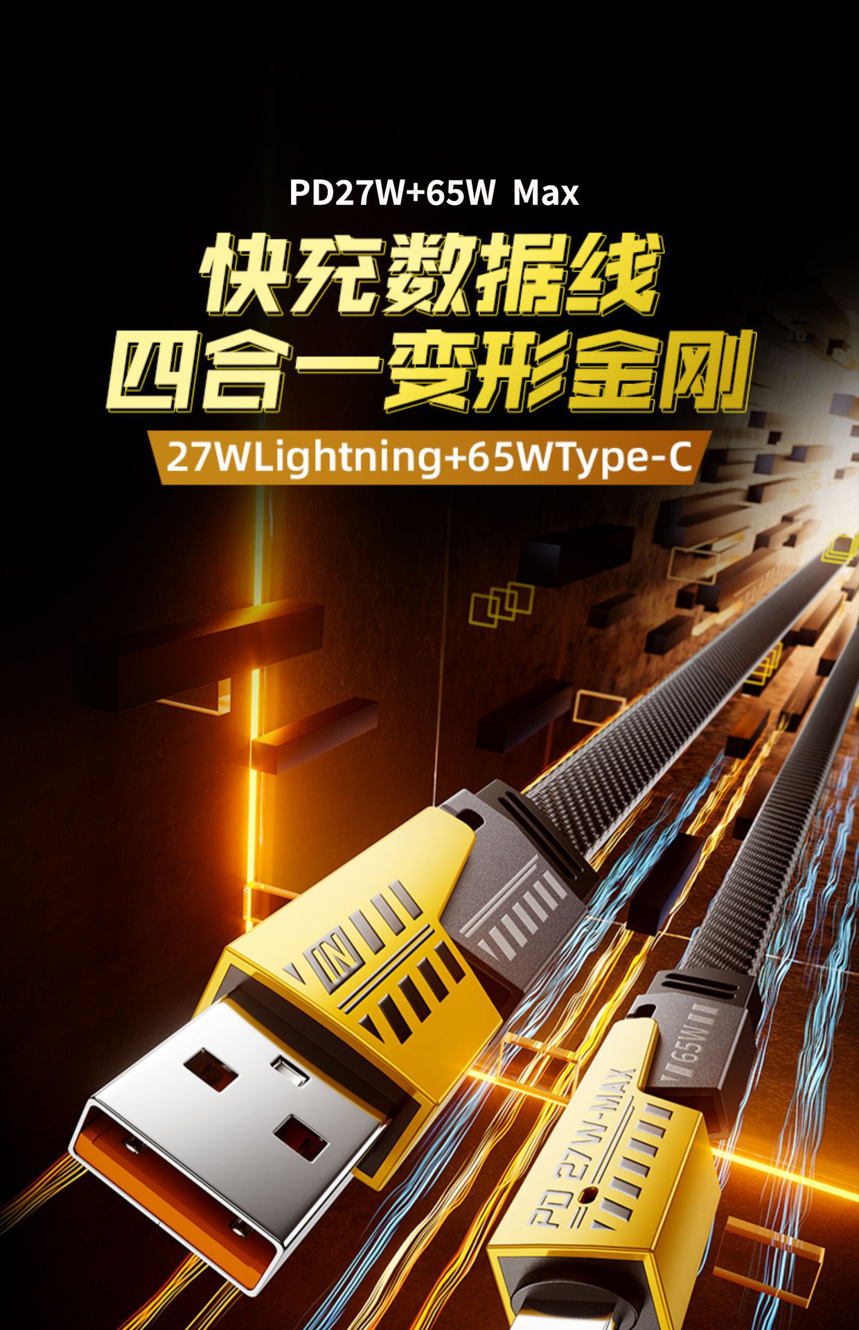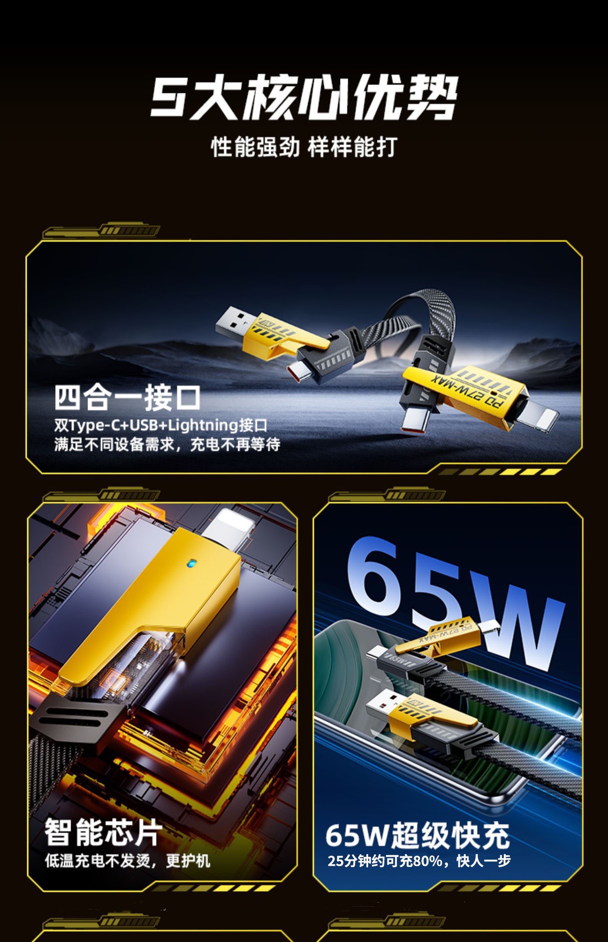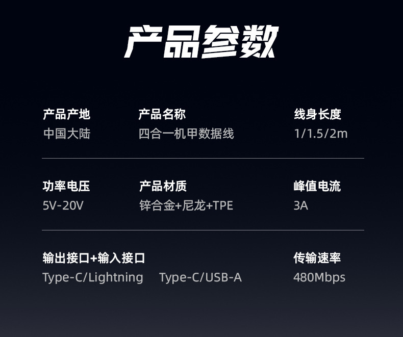 机甲四合一数据线超级快充充电线二拖二锌合金多头车载Type-c传输