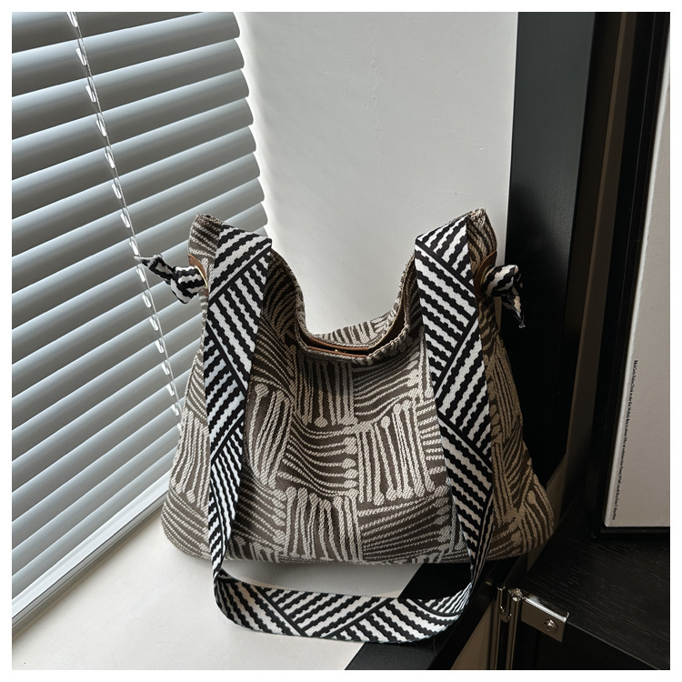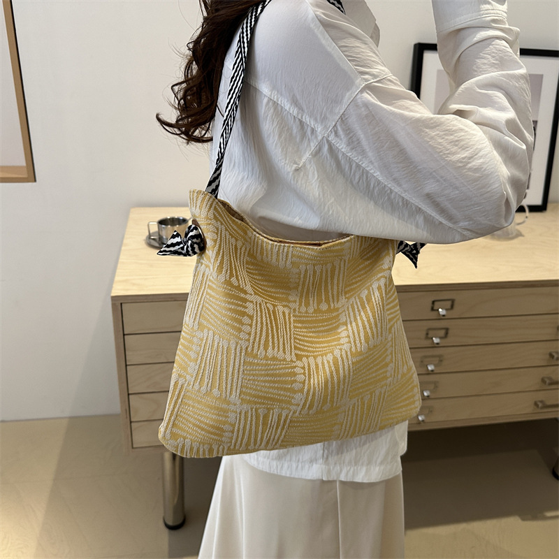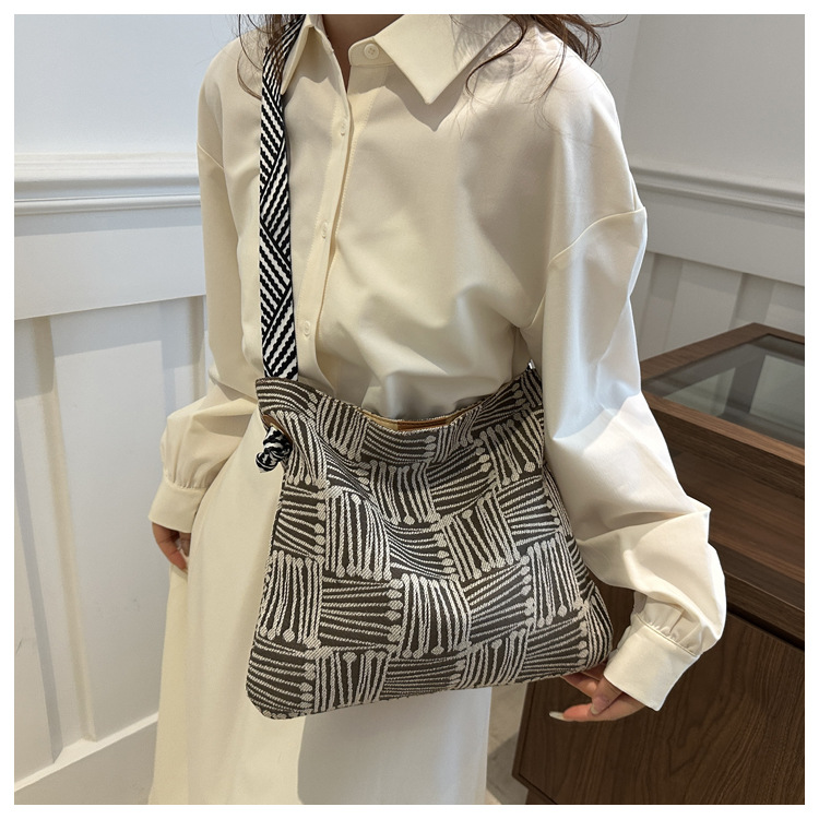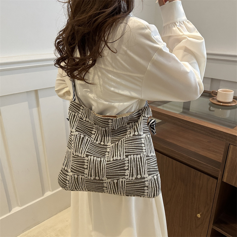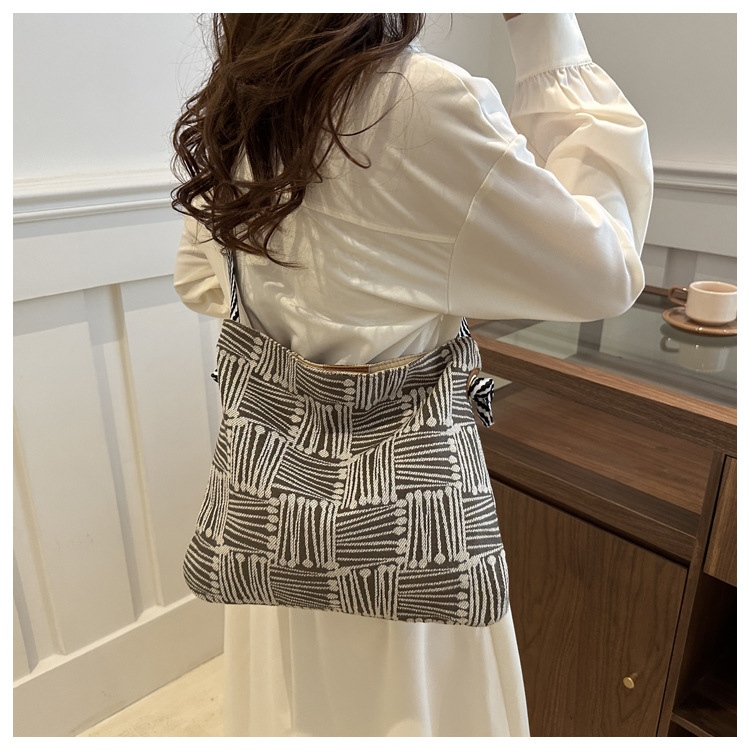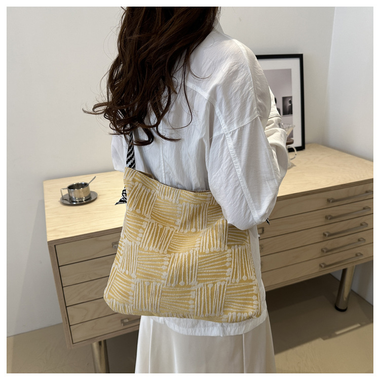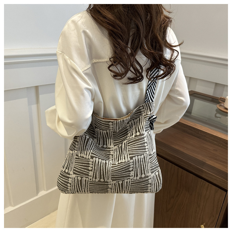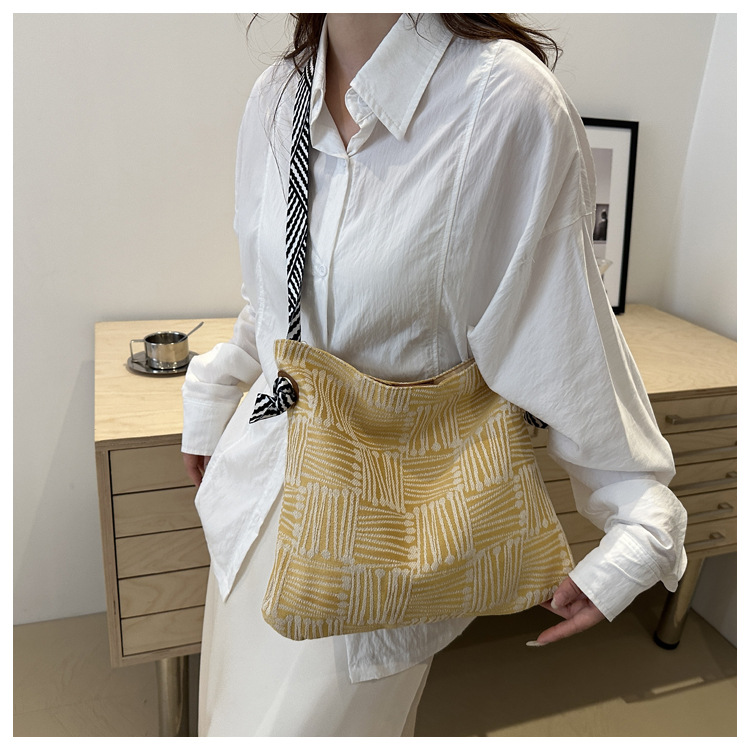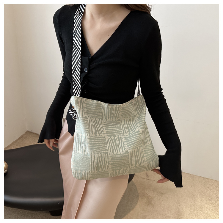 慵懒风宽肩带格子大容量斜挎帆布包2024新款潮时尚百搭托特包女