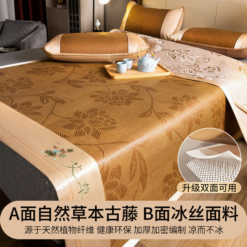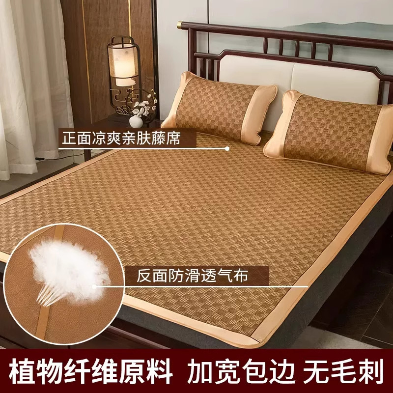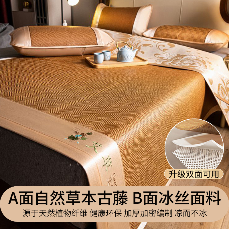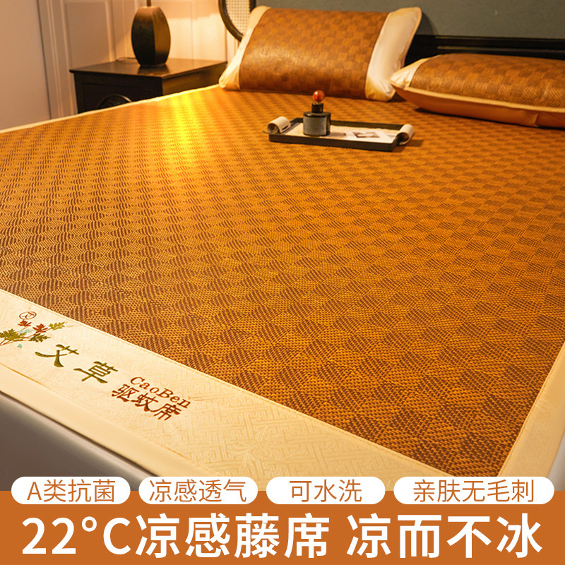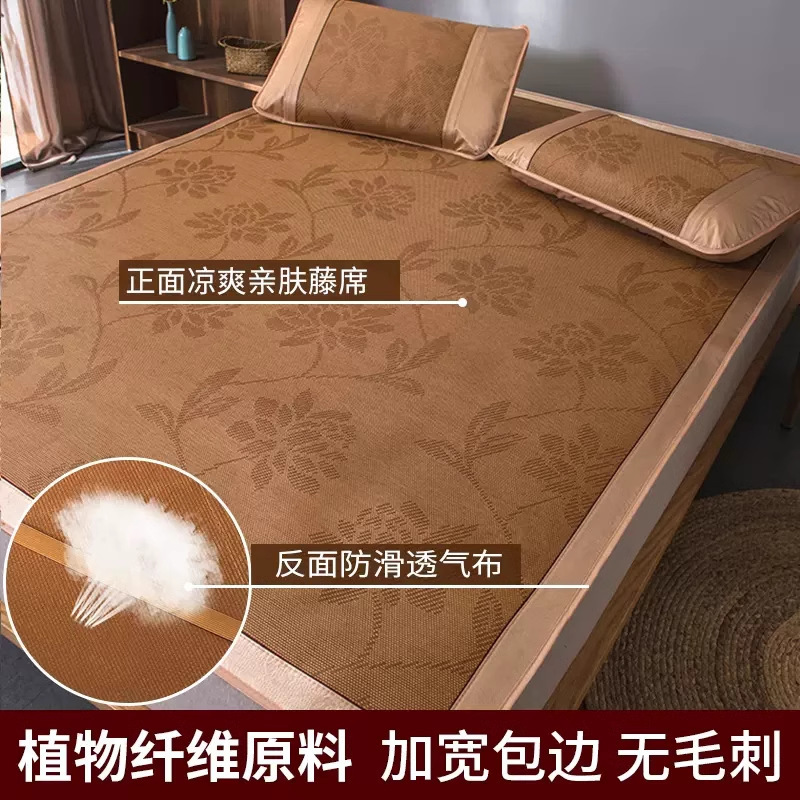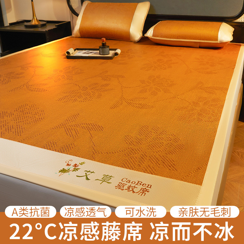 加厚艾草双面藤席冰丝凉席三件套竹草席学生双人夏季空调席可折叠