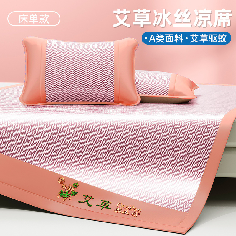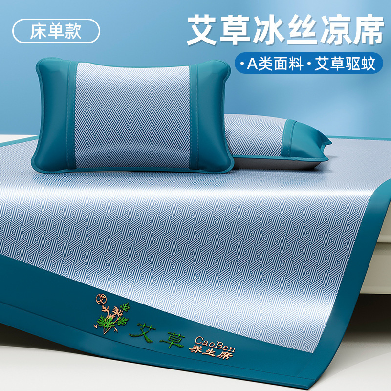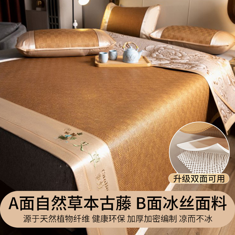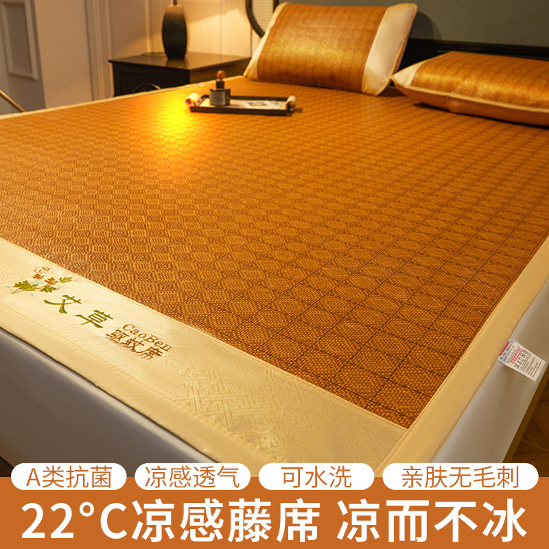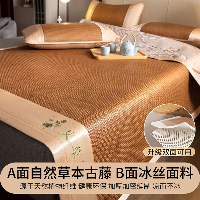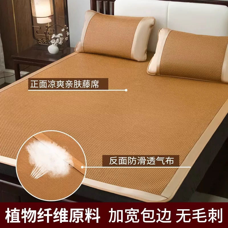 加厚艾草双面藤席冰丝凉席三件套竹草席学生双人夏季空调席可折叠