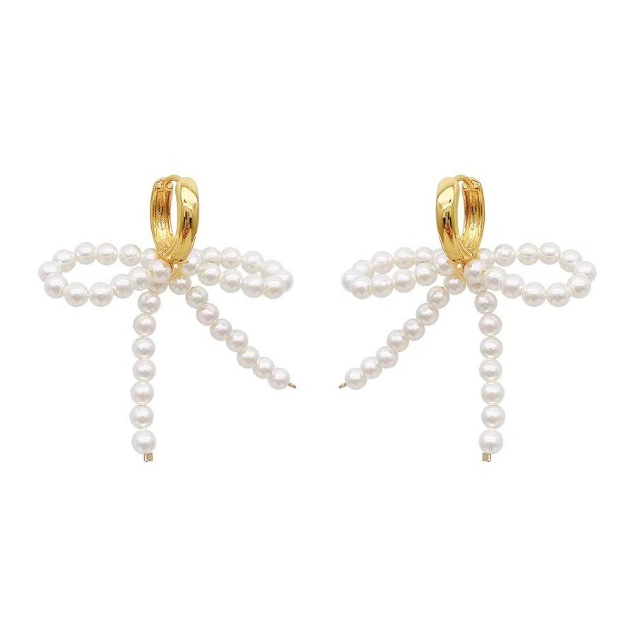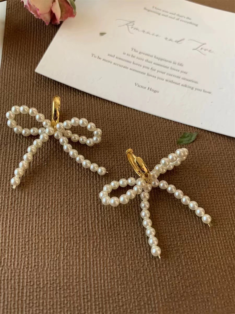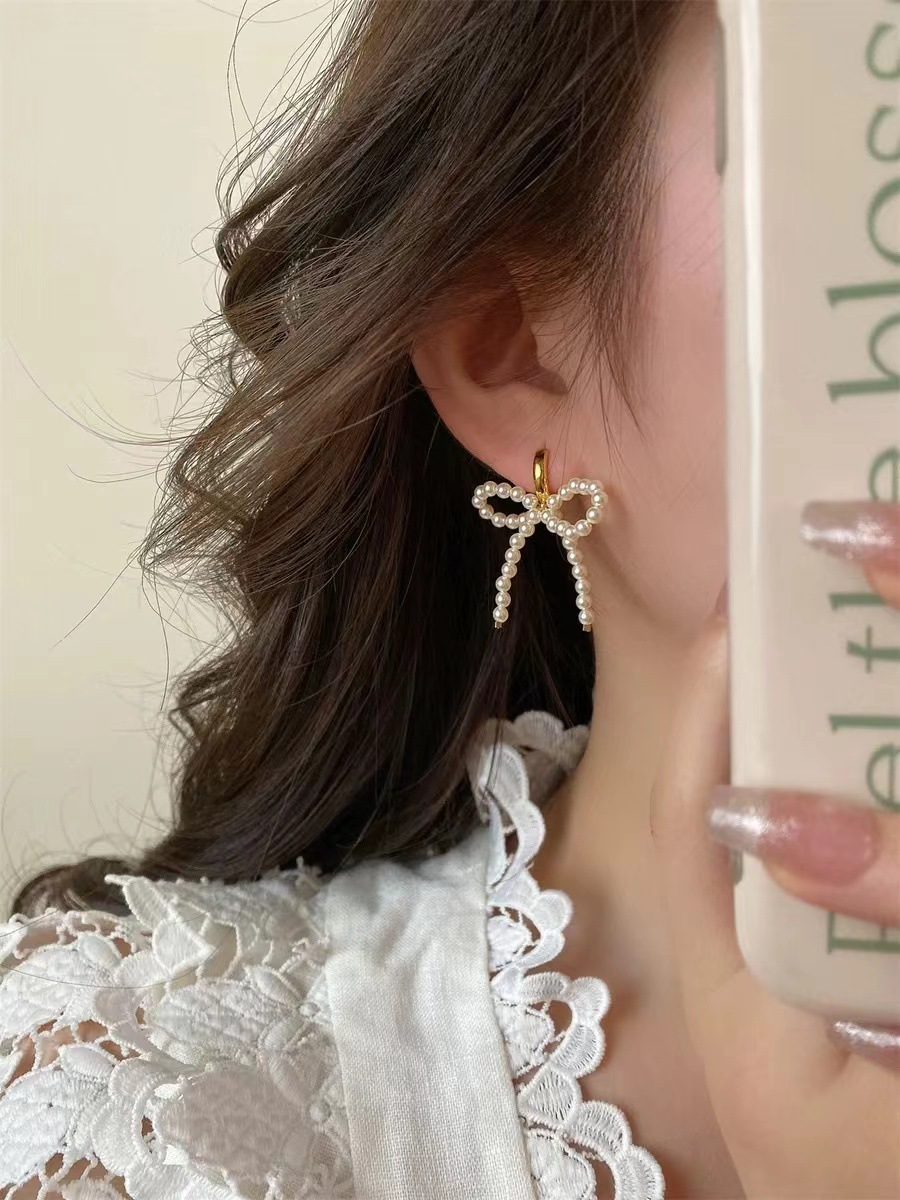 淑女风蝴蝶结珍珠耳环2024新款温柔少女耳扣法式复古耳饰高级耳坠