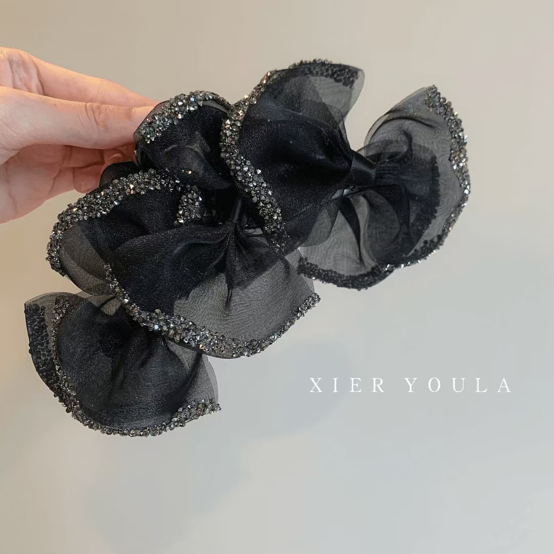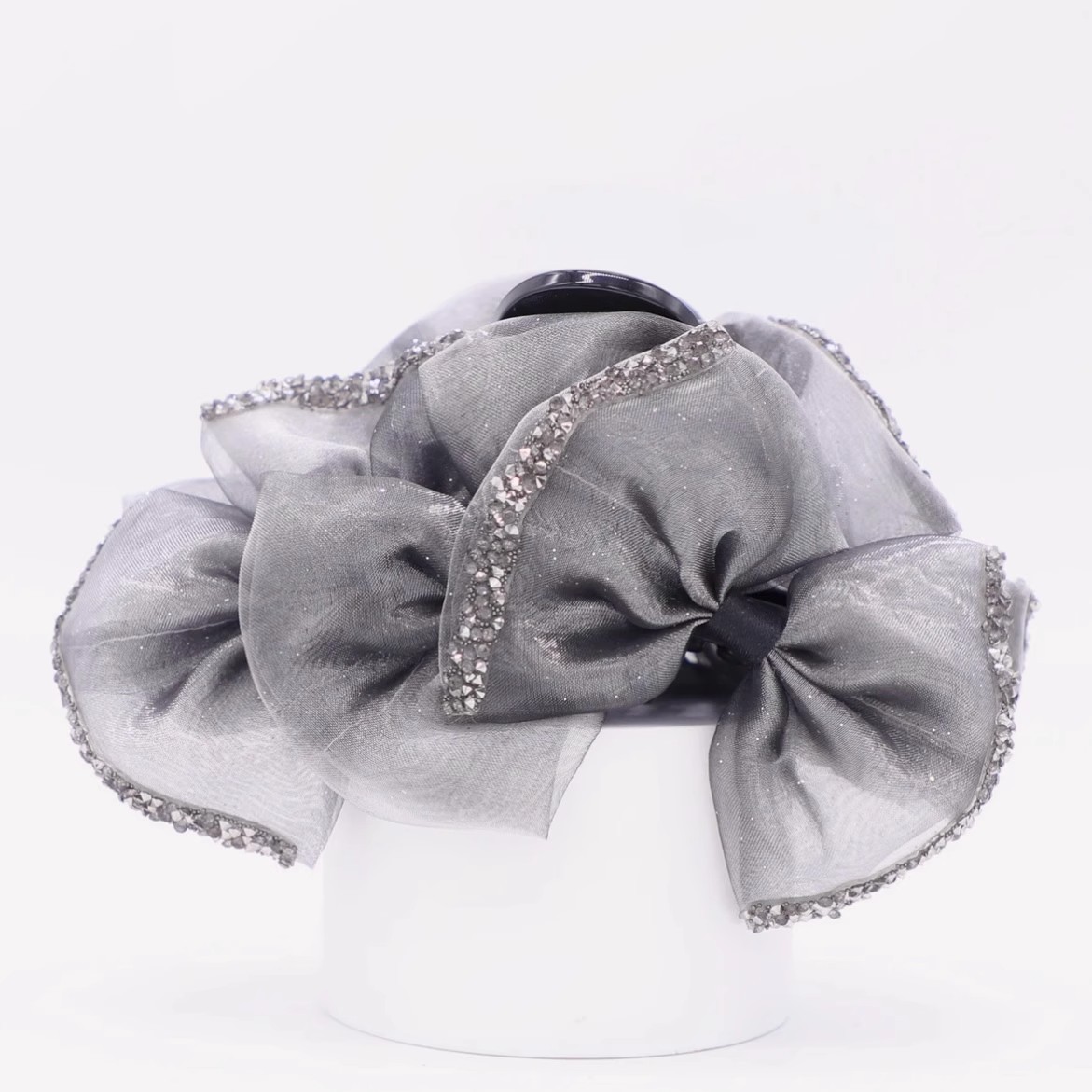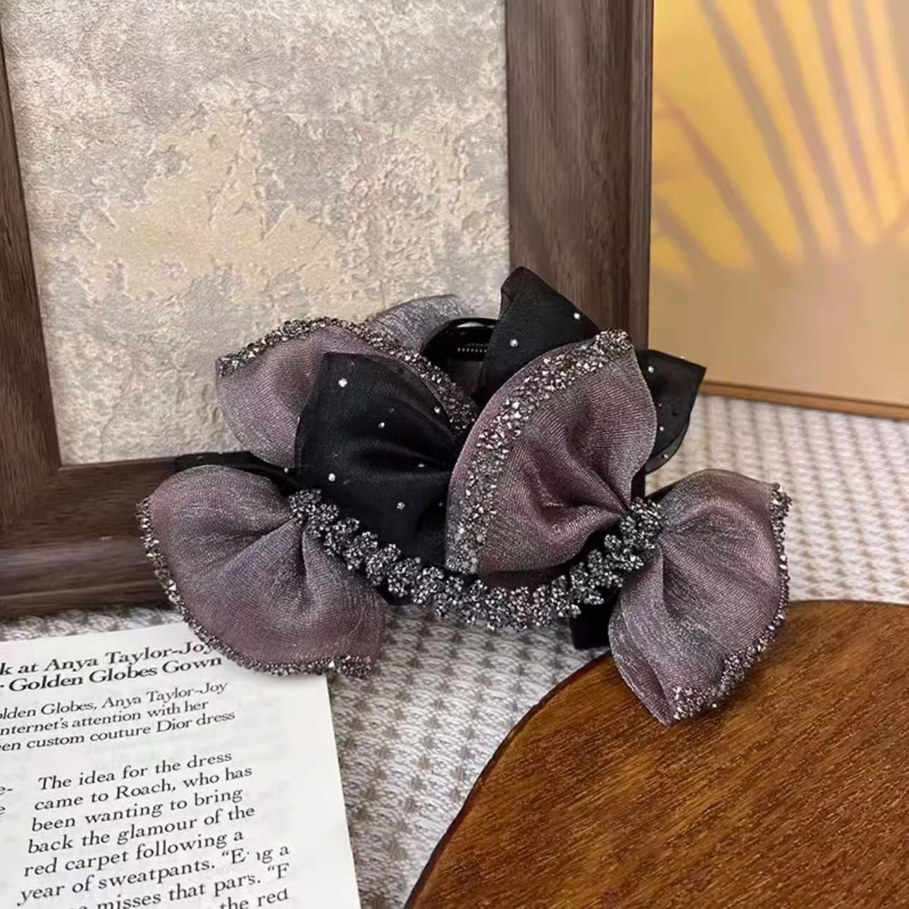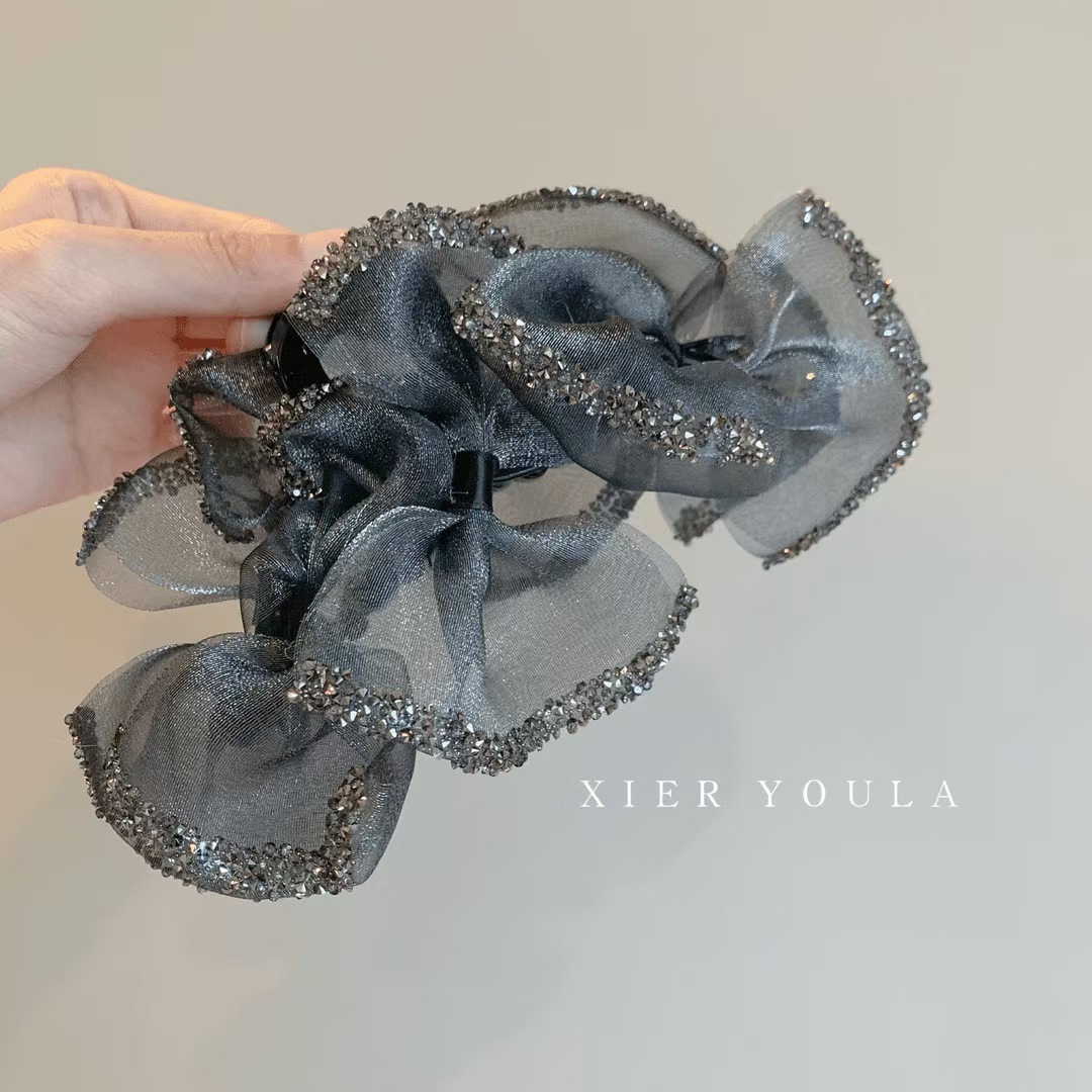 新款2025【云妙】欧根纱灰色蝴蝶结高级感AB面显气质13cm抓夹发夹