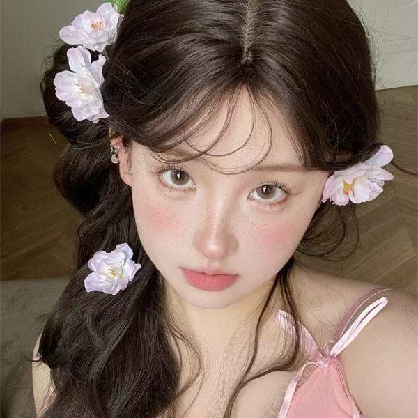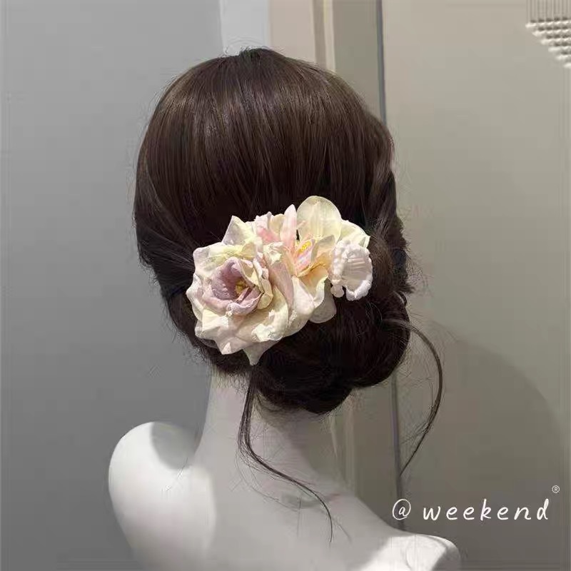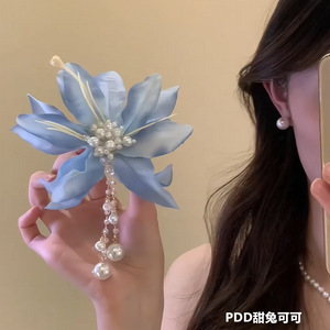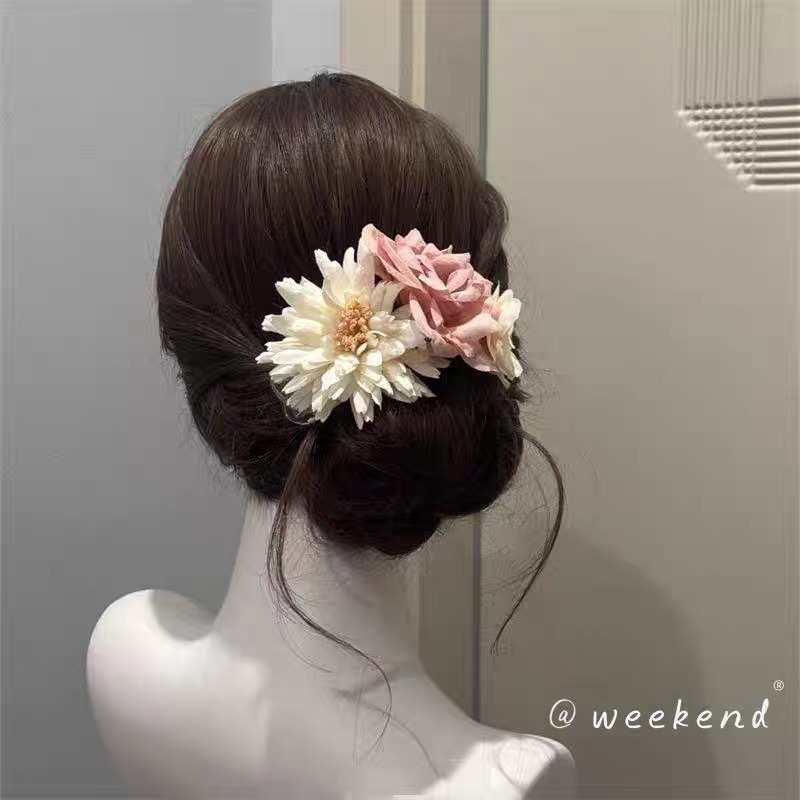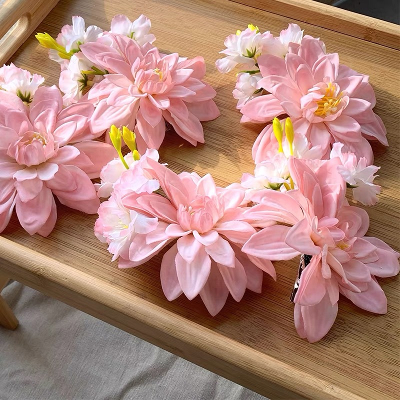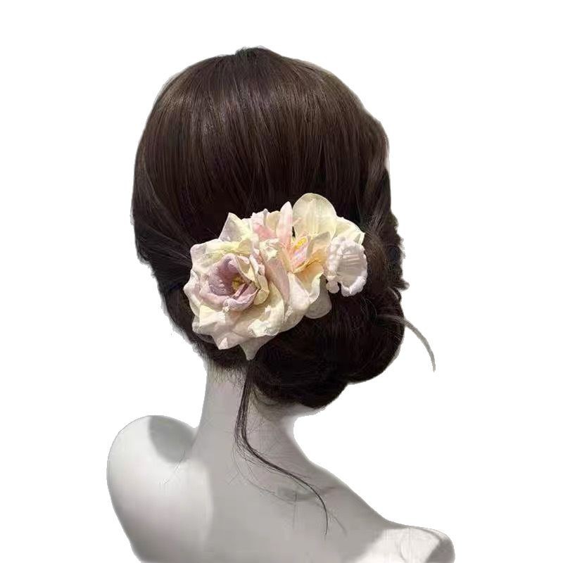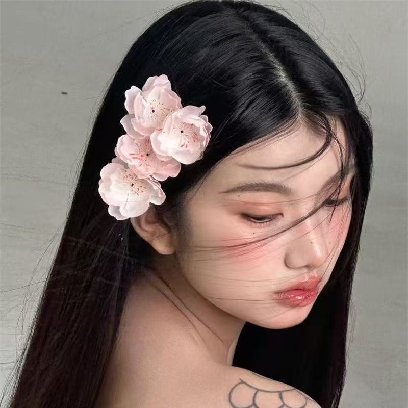 早春款新中式温柔粉色花朵发夹复古盘发丸子头簪花夹子氛围感发饰