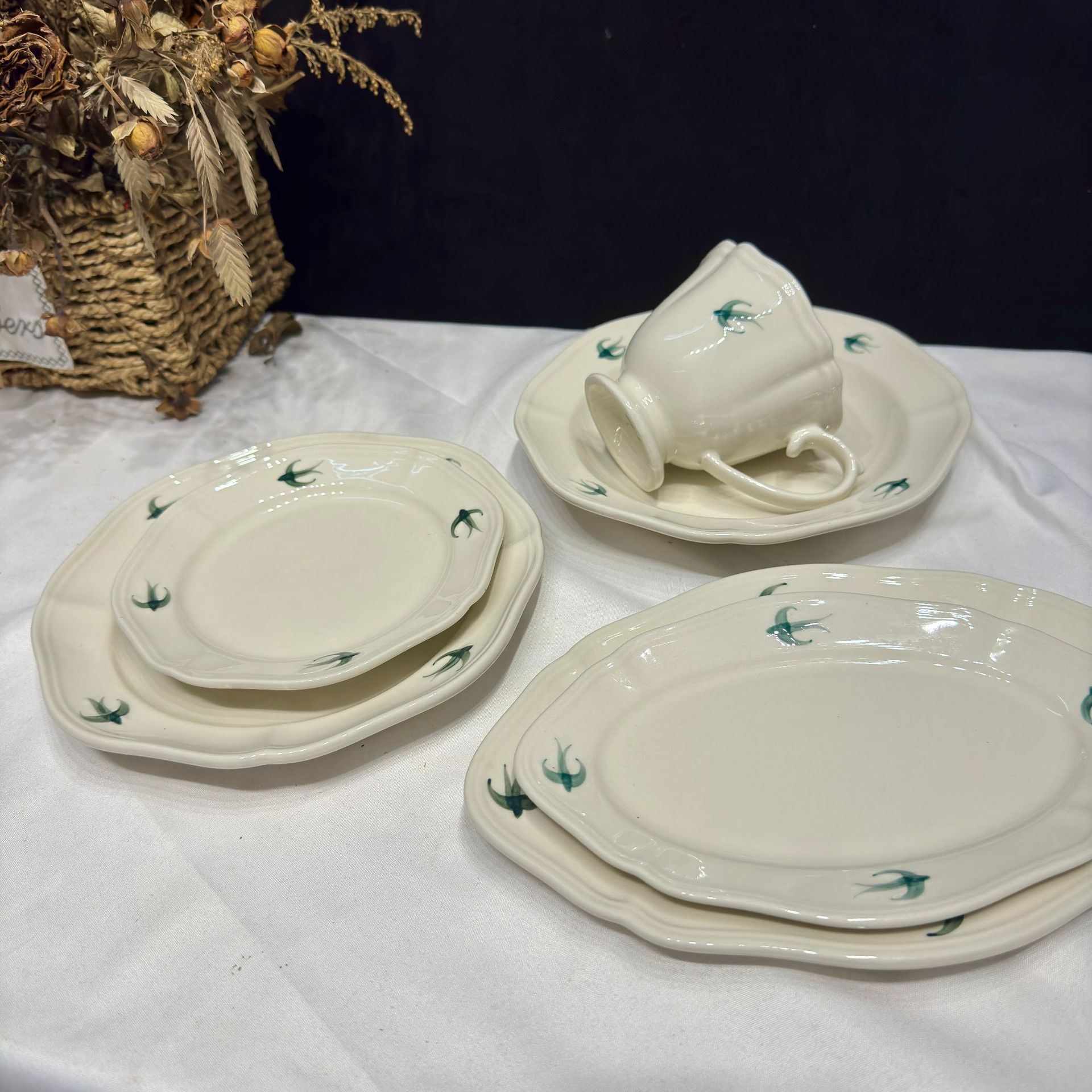 批发飞鸟椭圆盘6寸8寸甜品蛋糕陶瓷盘家用菜盘子法式复古餐具杯子