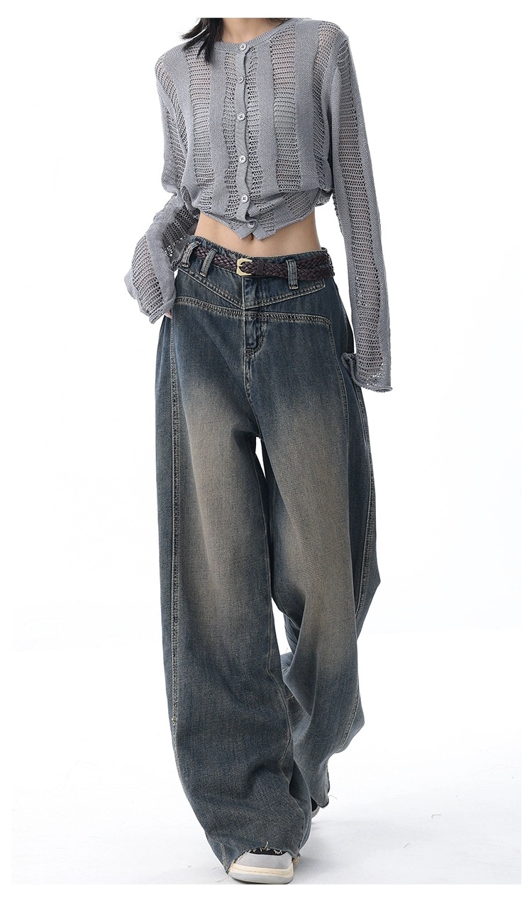 美式高街复古做旧阔腿牛仔裤女秋季2024新款中高腰时髦显瘦拖地裤